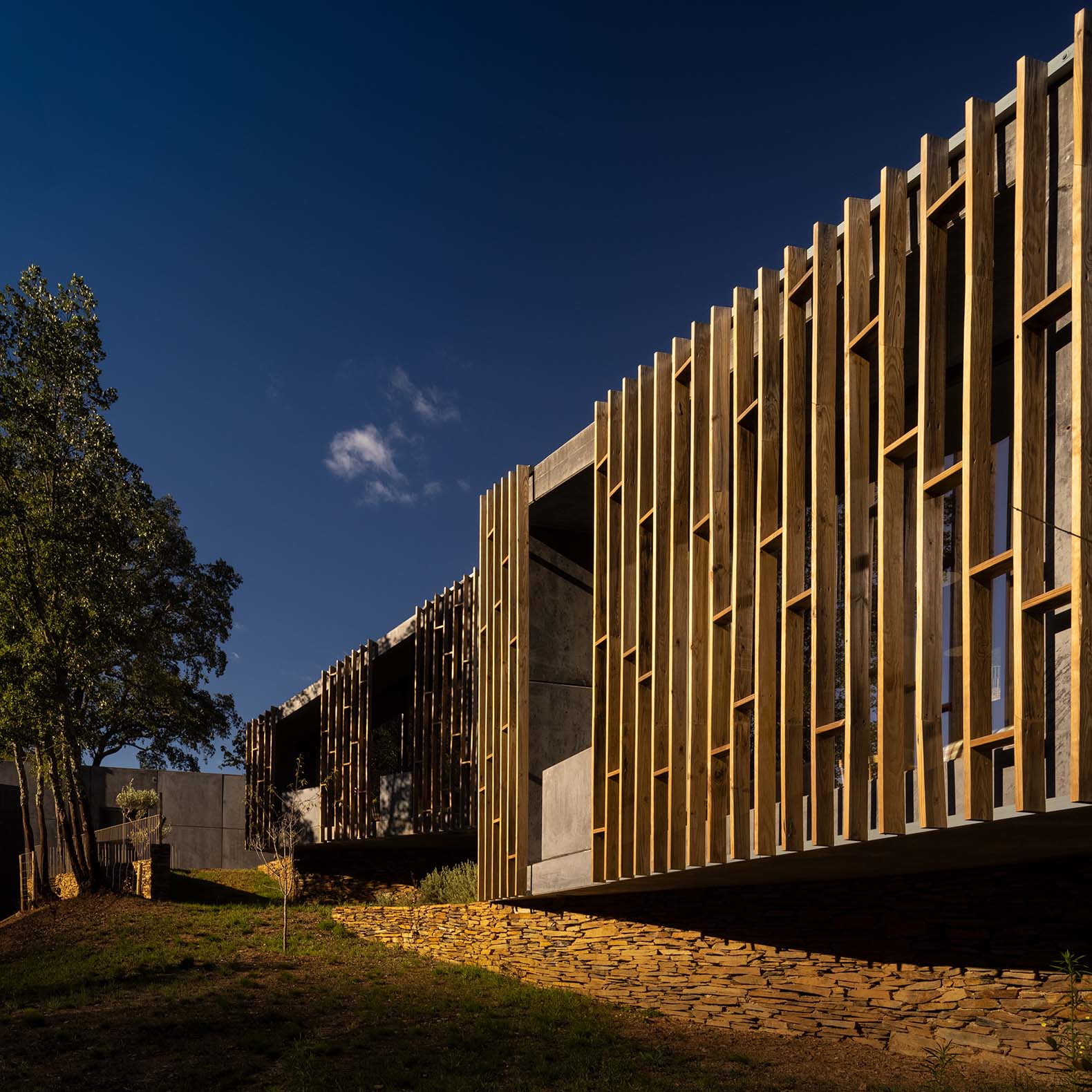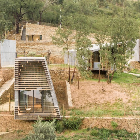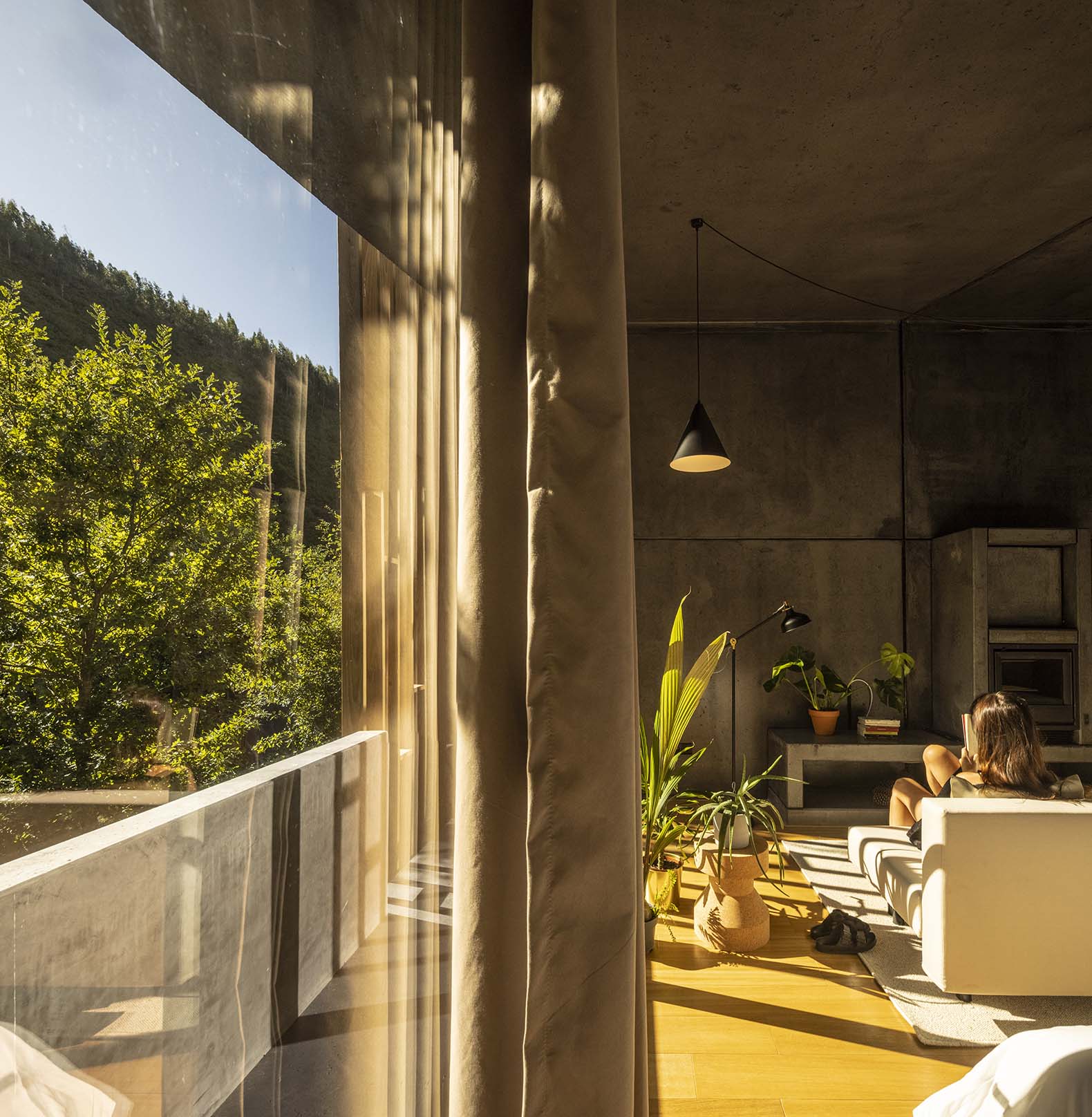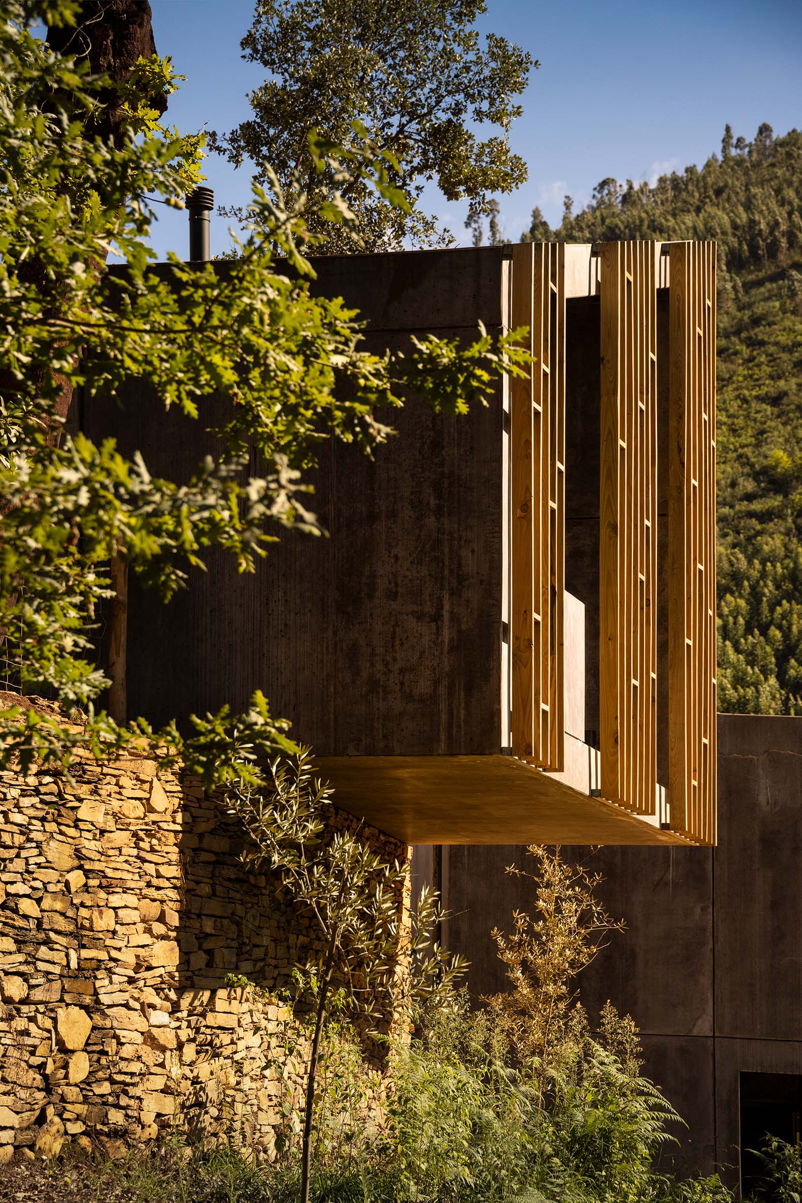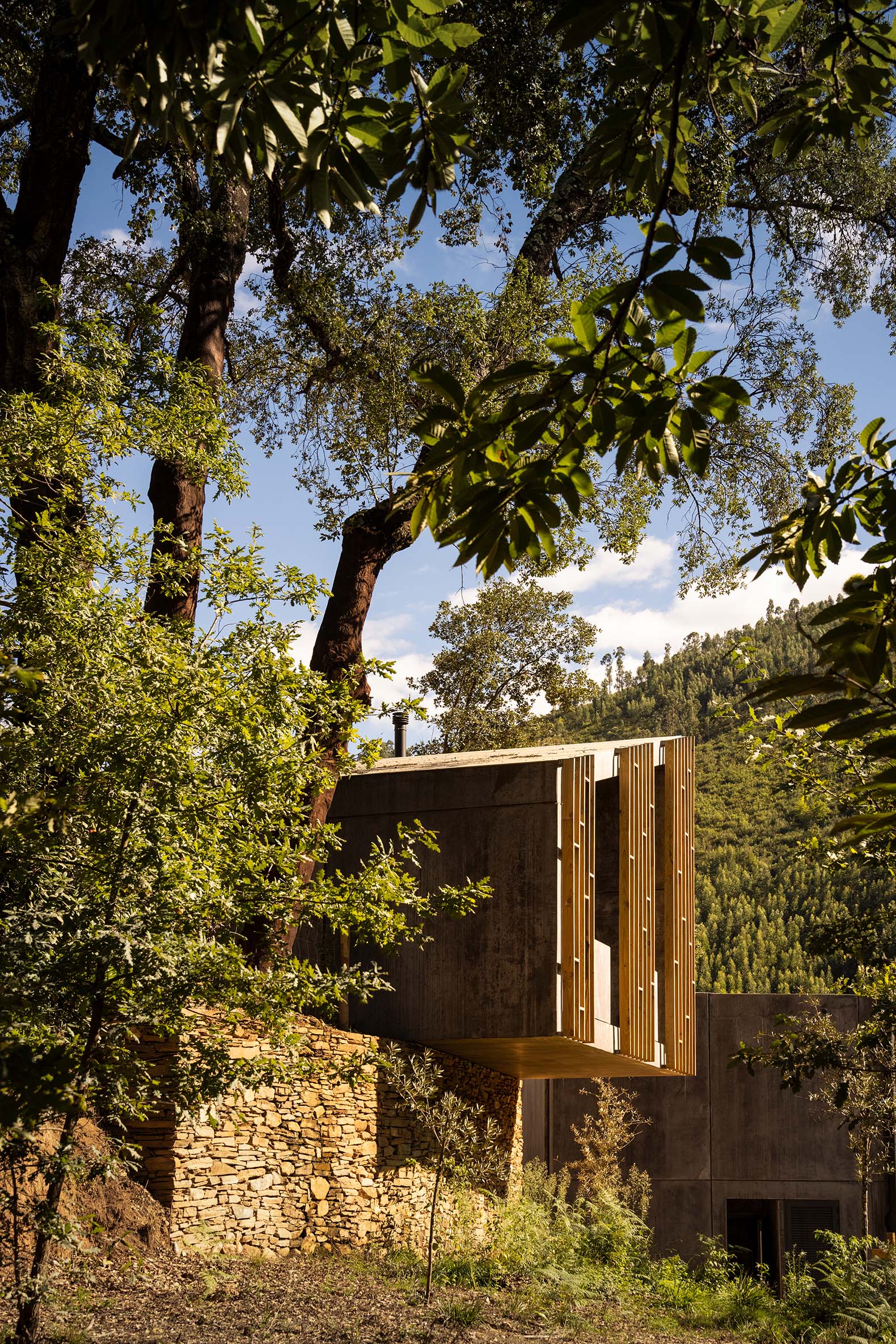 Se mantuvieron todos los árboles, las casas se implantaron cuidadosamente alrededor de ellos. El posicionamiento disperso de las unidades y sus distintas orientaciones crean diferentes hilos, despejando la vista desde el interior. Detrás de las piezas de madera que encierran los balcones podemos ver el bosque y, ocasionalmente, el río Paiva.
