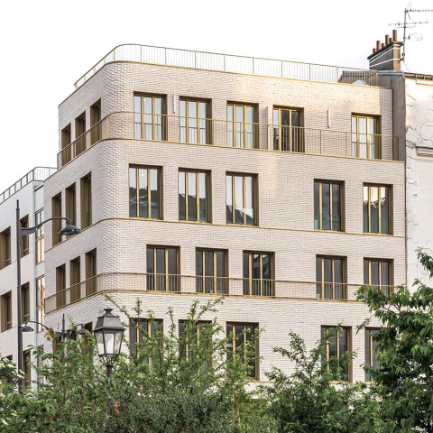 La carpintería es de madera en toda su altura y los ocultamientos así como los marcos, integrados en el espesor de la fachada, son de metal de colores cálidos. La esquina del edificio es redondeada, patrón que también encontramos en el patio. El edificio del lado de la rue Buzenval se destaca del edificio de la esquina para crear un contraste y adoptar una escala urbana contextual. La fachada se compone de un premuro liso tintado en masa de color blanco. Su aspecto liso y generoso contrasta con la rugosidad del ladrillo del edificio de la esquina.