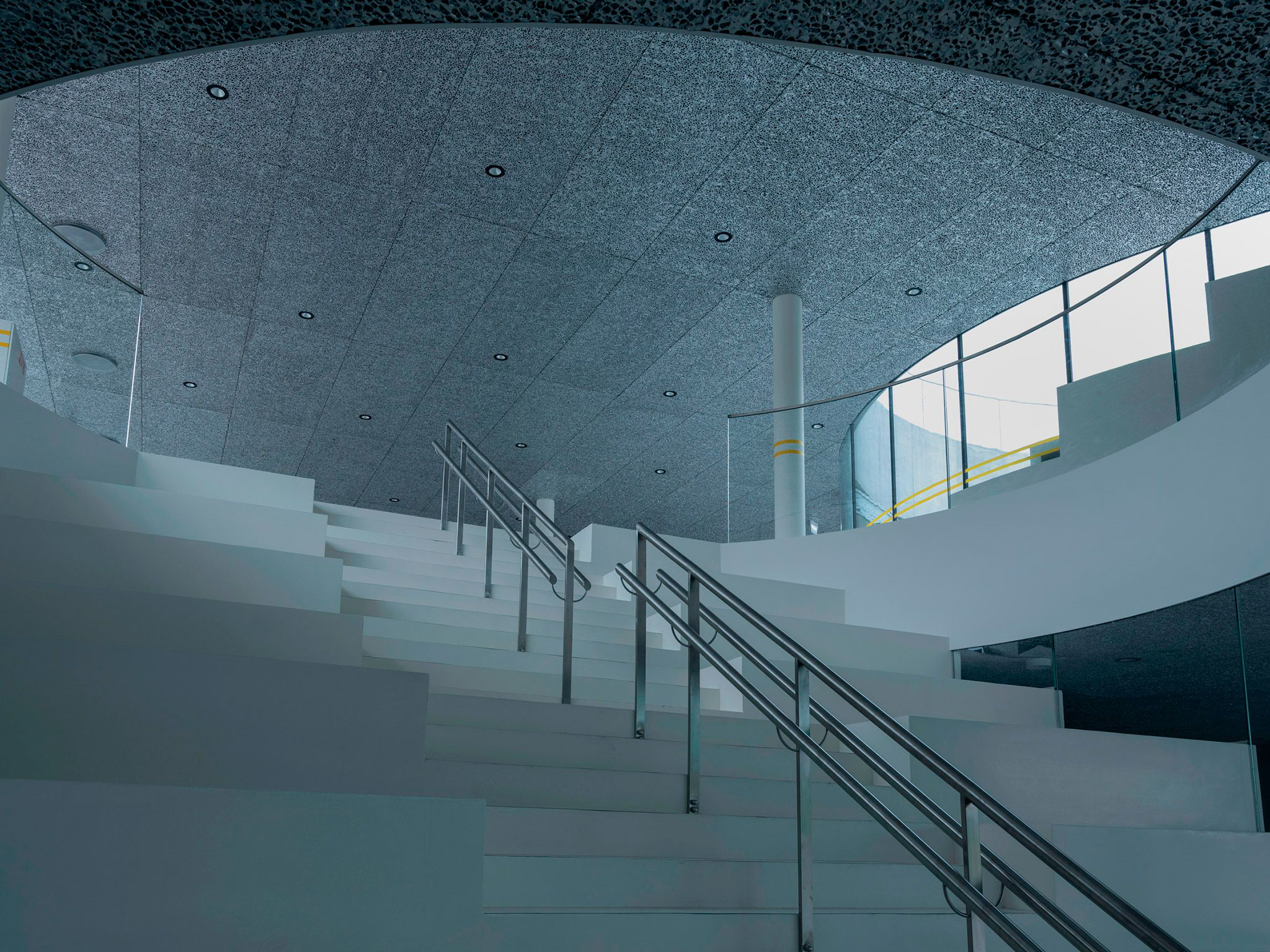 El museo, semienterrado, utiliza la tierra circundante como aislante natural para estabilizar la temperatura y reducir la demanda energética. Este enfoque minimiza el impacto visual y la huella de carbono, integrando el paisaje en la arquitectura. Su estructura combina hormigón armado y estructuras de acero, donde parte del cemento se sustituye por tierra local, reduciendo el carbono incorporado y anclando el edificio a su emplazamiento. En la parte superior, una cubierta de vegetación autóctona se integra con el parque, recuperando la biodiversidad, mientras que los paneles solares de vidrio alrededor de la claraboya central generan energía renovable y filtran la luz natural hacia el interior. Los elementos prefabricados y los materiales duraderos garantizan precisión, bajo mantenimiento y una larga vida útil. La envoltura protegida de la tierra mejora el rendimiento térmico, el confort acústico y la resiliencia, transformando el edificio en un sistema sustentable donde la estructura, el paisaje y la energía forman un solo organismo.