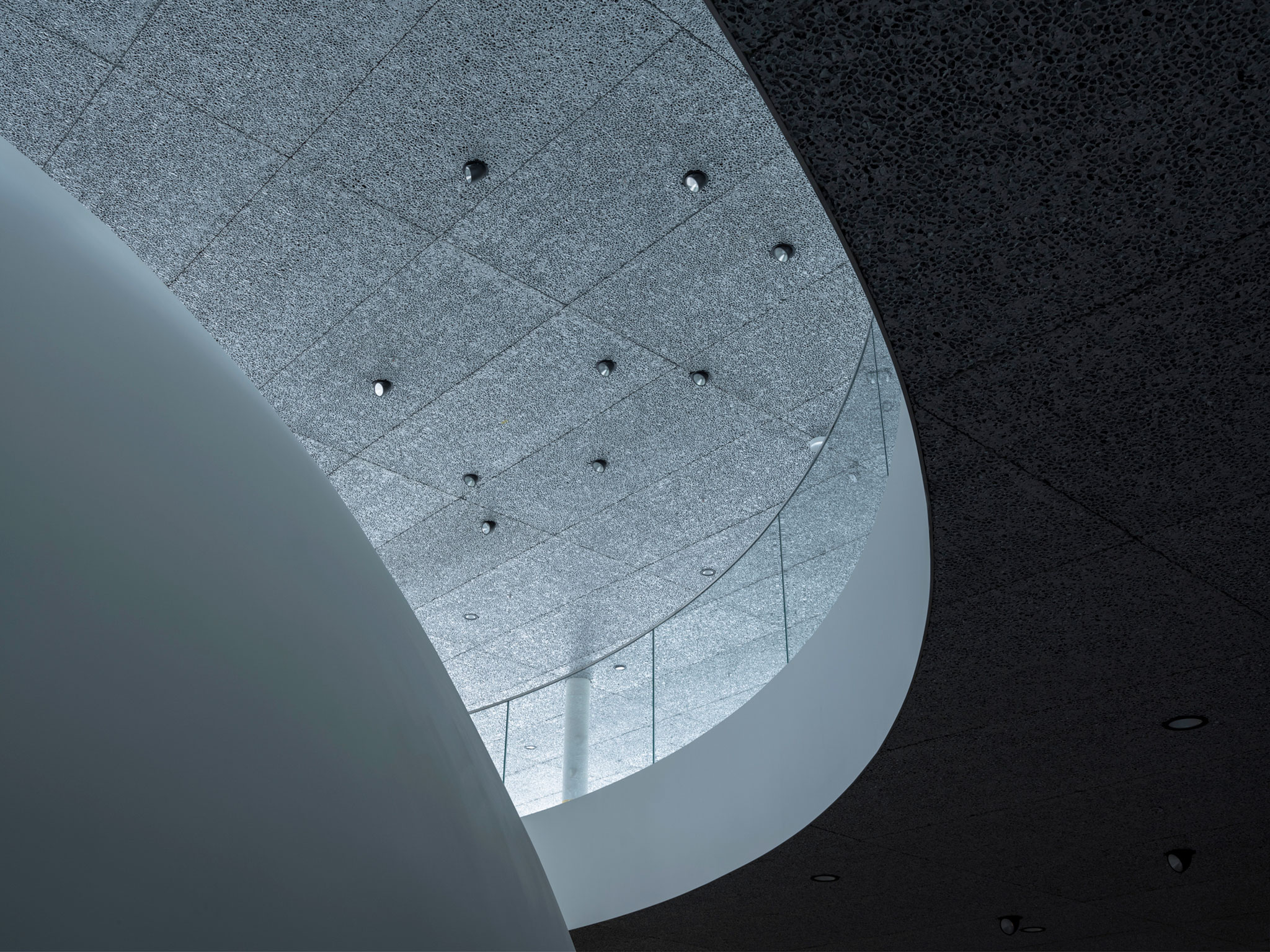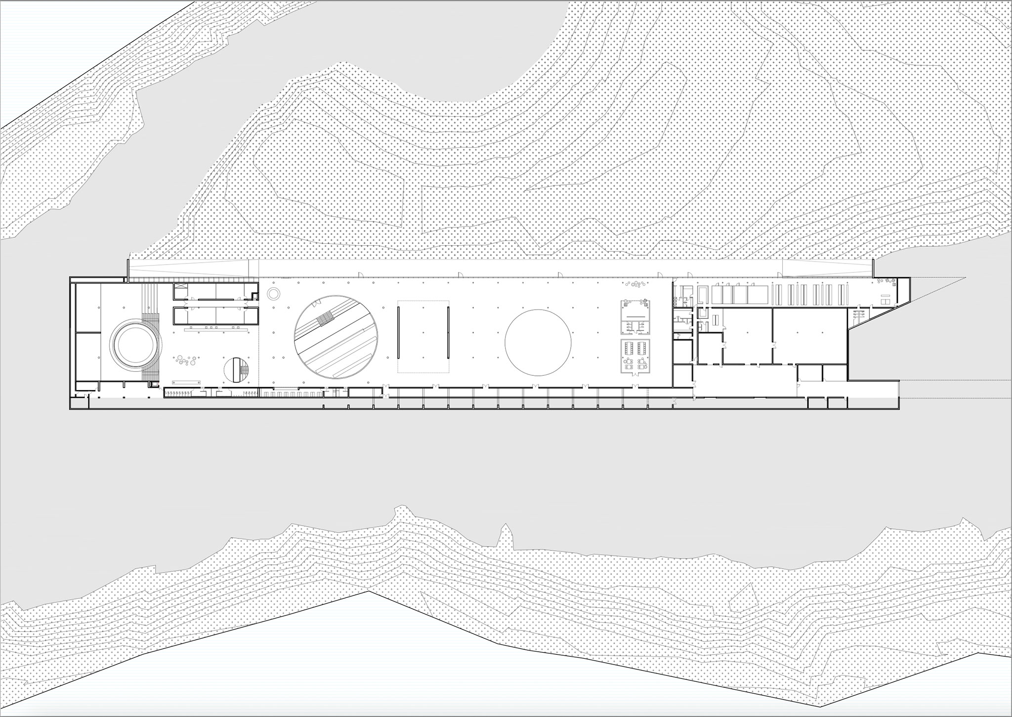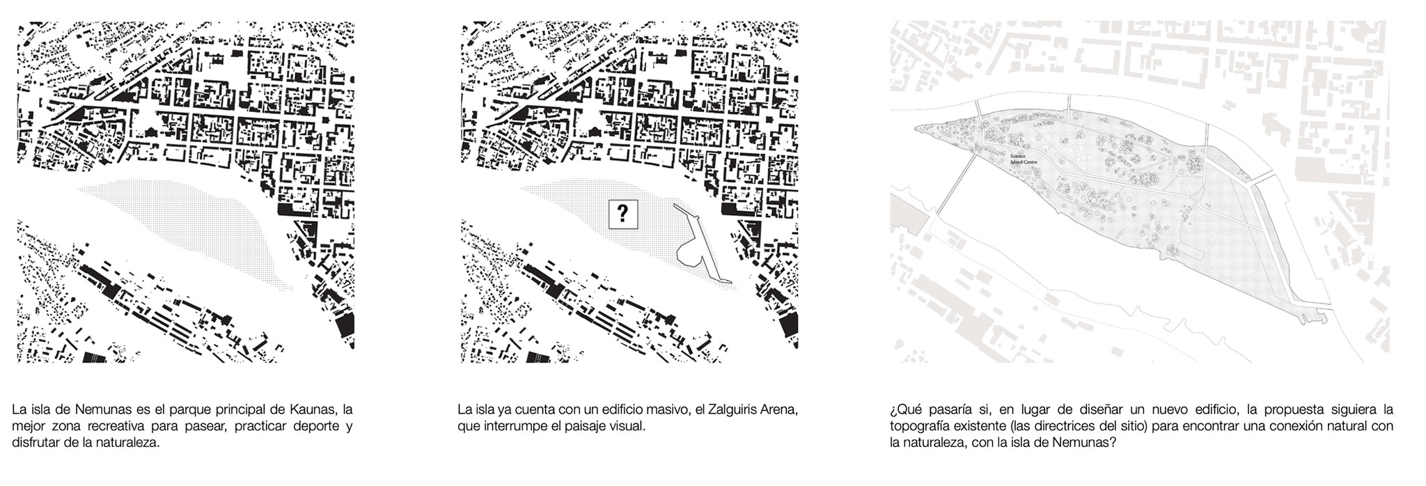 El proyecto partió de una pregunta: ¿qué pasaría si el nuevo museo pudiera extender la isla en lugar de ocuparla? En la isla Nemunas, ya dominada por el imponente Žalgiris Arena, el diseño adopta una estrategia de mínimo impacto, integrando el edificio en el terreno para preservar las vistas y el espacio abierto. El museo se convierte en parte del paisaje, no en un objeto más. Su cubierta es una prolongación del parque, accesible para todos y marcada por aberturas circulares que aportan luz natural y ventilación natural al interior. El programa se redefinió: en lugar de un museo de ciencias tradicional, la Isla de las Ciencias se dedica a las Ciencias Ambientales, convirtiéndose en la primera de su tipo en Europa. Organizada en zonas de "Frente" y "Trasera", todos los espacios reciben luz y vistas, desvaneciendo las fronteras entre naturaleza y arquitectura. Los visitantes experimentan los fenómenos naturales —luz, viento, temperatura y estaciones— a través del propio edificio, transformando el museo en un organismo vivo y educativo.