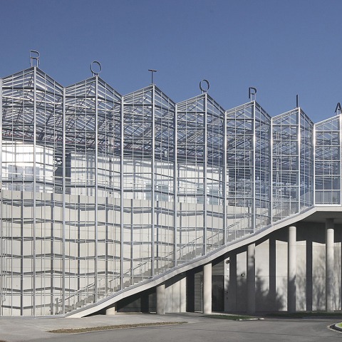 Agrotopia es una orgullosa escultura transparente de acero y vidrio, que subraya tanto su función agrícola como pública. Para ello, la arquitectura se compone de una esbelta construcción de invernadero que se destaca contra el cielo y descansa sobre la base de hormigón de los cobertizos de cajas.