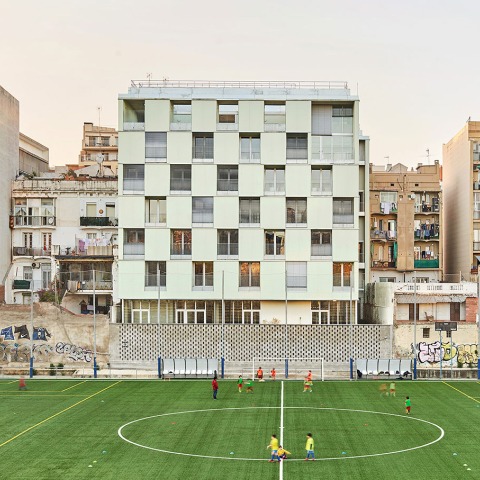 El proyecto se ubica en una manzana singular del Eixample, fragmentada antiguamente por el paso de las vías del tren y actualmente abierta a nuevos espacios libres. Dos cuerpos separados definen un gran patio central que funciona como pulmón verde y espacio de comunicaciones. El bloque a calle entre medianeras consolida el frente de manzana y el segundo bloque se concibe como un edificio aislado, separándose incluso de los límites de la parcela para dar respuesta a los vacíos existentes evitando situaciones de fricción con los edificios vecinos.