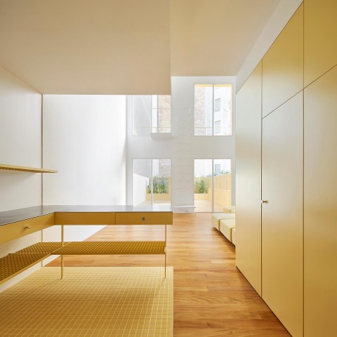Para revertir la falta de luz natural, se ha optado por usar materiales de colores claros que potencien el reflejo de la luz en algunas zonas. La madera tropical de grapia permite dar continuidad al plano del suelo desde el interior hasta la terraza. En el plano vertical se opta por paredes blancas y revestimientos gres porcelánico de tonalidad amarillo pastel. Escaleras, balcón, y elementos de mobiliario se han realizado en chapa reticular para favorecer que desaparezcan y que la luz pueda penetrar en todos los rincones de la casa.