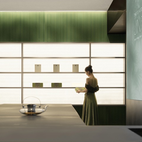 Aurora Design trató de inspirarse en la cultura del té, que disfruta de una historia de miles de años, para presentar una nueva idea de diseño, con la esperanza de crear una nueva imagen de marca para Jin Tea Space y transmitir una interpretación moderna de una tienda arraigada en la cultura tradicional del té.