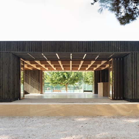 El edificio está proyectado para poder abrirse ampliamente, como un patio que sirviera de refugio del mal tiempo o del sol para disfrutar del aire libre. Primer proyecto en el sector maderero del pino carrasco, apoyado por los municipios forestales, fibois paca, el Ayuntamiento, el proyecto razona con su entorno, encontrando luego naturalmente su lugar en el lugar.