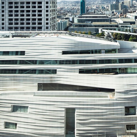 La icónica fachada este de la ampliación diseñada Snøhetta, inspirada en parte por las aguas y la niebla de la Bahía de San Francisco, está compuesta por más de 700 paneles de polímeros reforzados con fibra de vidrio únicos y de fabricación local. A lo largo del día, el movimiento de la luz y la sombra, anima la superficie ondulada de manera natural. La fachada cuenta con cristales de silicato del Condado de Monterey incrustados en la superficie reflejan la luz cambiante.