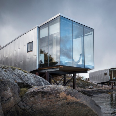 El acristalamiento está hecho a medida para el proyecto y las grandes vidrios permitan vistas sin obstáculos de la naturaleza y los elementos exteriores. Todos los detalles, también en el interior, están cuidadosamente diseñados y personalizados para el proyecto. Las cabañas están pensadas para ofrecer a sus huéspedes refugio y comodidad al mismo tiempo que subrayan la dramática experiencia de los elementos exteriores; El mar, el paisaje, las luces cambiantes, el clima y las diferentes estaciones. Sobre todo, las cabañas se esfuerzan por cumplir con los requisitos funcionales de los huéspedes, con amplio espacio para el equipaje, un cómodo baño y una cocina / comedor.