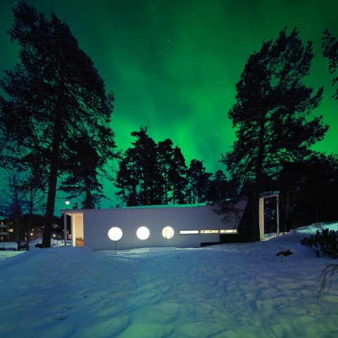 Como los mástiles estructurales entre las cubiertas de los barcos, una estufa de metal blanco separa un espacio del otro y sirve como división entre la cama y el resto de la habitación. Una serie de tres ventanas circulares se colocan en la fachada, en alusión a los miradores de los buques en el mar. Los suelos de tablones y las claraboyas paralelas crean la sensación de una casa en un puerto entre los bosques de los alrededores.