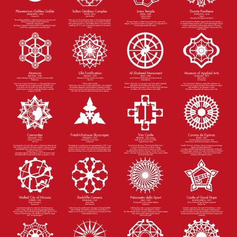 El diseño utiliza los planos de importantes ejemplos de arquitectura internacional para crear patrones únicos para los copos de nieve.