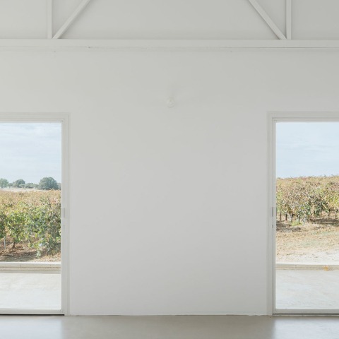 Estructuralmente, los muros de carga exteriores sostienen cinco cerchas metálicas de gran tamaño que se extienden sobre cuatro vanos organizando el programa desde lo más público y exterior hasta lo más privado e interior. Estos vanos se componen de un porche delantero, cocina, comedor y sala de estar, y finalmente dormitorios y baños. La zona pública se abre al paisaje con dos grandes puertas acristaladas pivotantes que enmarcan el viñedo mientras que las estancias privadas buscan la intimidad con pequeños y profundos huecos de ventana.