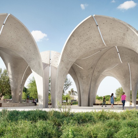 Construido con pétalos de concreto diseñados cuidadosamente para asentarse ligeramente sobre la tierra, el Pabellón BHP, el pabellón principal, forma una geometría que recolecta y canaliza el agua de lluvia hacia un sistema de captación de agua en todo el sitio. Los pabellones en todo el parque brindan sombra y refugio, al mismo tiempo que invitan a los visitantes a visualizar el ciclo del agua en Confluence Park y cómo se relaciona directamente con la cuenca del río San Antonio.