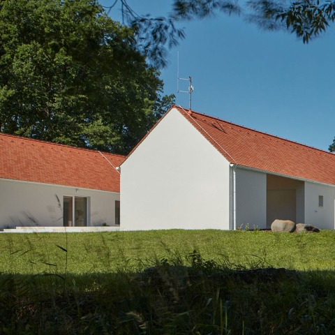 Trabajamos con la forma arquetípica del tejado a dos aguas y las proporciones tradicionales, buscando sus variaciones espaciales. No hay que pensar demasiado en la materialidad de la casa, seguimos la tradición y la experiencia. El color blanco y naranja, las paredes enlucidas y las baldosas de cerámica de cola de castor aparecen en el paisaje.