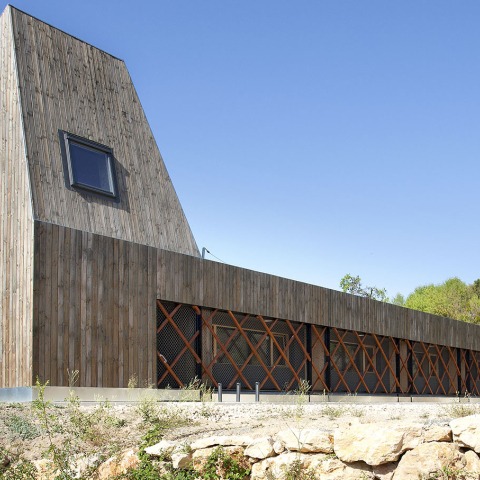 Se pretendía que el edificio, de unos 280 metros cuadrados, se viese como un “elemento natural”, y dado que iba a poder ser visto tanto desde los diferentes frentes como desde una posición elevada era necesario encontrar un sistema de revestimiento que permitiera tanto su uso en fachadas como en las cubiertas. La solución fue un revestimiento continuo que permitía solucionar la impermeabilidad del edificio en un segundo nivel: un revestimiento de madera con sistema ventilado en el caso de la cubierta. La madera empleada es pino Douglas termo tratado, coloreado por proceso de impregnación.