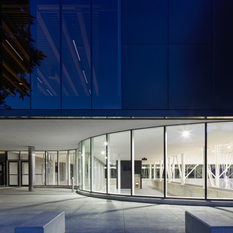 El nivel inferior cuenta con una fachada totalmente acristalada de muros cortina, que proporciona vistas directas desde el nivel peatonal para observar las actividades que tienen lugar dentro de las nuevas instalaciones. Las esquinas redondeadas crean una forma ovalada para el nivel inferior totalmente acristalado, inyectando una mayor sensación de fluidez en los patrones de circulación alrededor del edificio. Directamente encima de la entrada principal del complejo, los paneles de aluminio del nivel superior se mezclan perfectamente con el vidrio tintado oscuro, resaltando las actividades que se desarrollan en las salas multifuncionales del complejo, incluyendo danza, improvisación, teatro, esgrima y más.