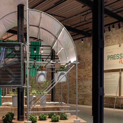 Al descomponer y recombinar el vocabulario arquitectónico del invernadero, Pressure Cooker invita a los visitantes a reconsiderar cómo la comida, la arquitectura y las nuevas concepciones del espacio pueden intersectar. La instalación se acompaña de material multimedia y de audio que recorre las fases de investigación de la exposición, invitando a los visitantes a unirse al equipo de investigación en el recorrido, a la vez que ofrece una perspectiva de la metodología y la visión del proyecto.