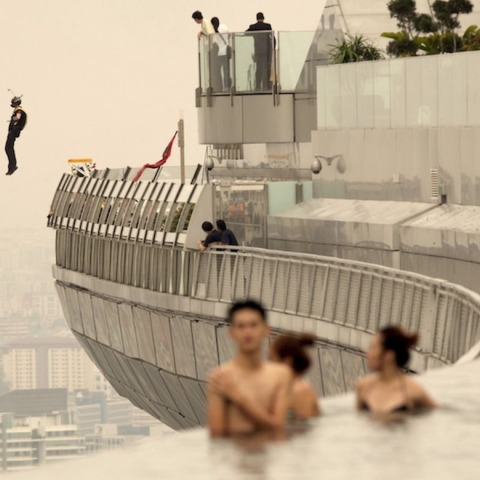 El día de Año Nuevo, el rascacielos Marina Bay Sands fue elegido como trampolín para realizar en Singapur una prueba más de BASE jumping. Siete saltadores BASE profesionales, participaron en esta experiencia extrema llena adrenalina para dar la bienvenida al Año Nuevo.