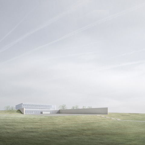 El edificio está integrado en el paisaje, que se caracteriza por amplios prados y campos, que srán integrados como elementos arquitectónicos. Dos muros de contención realizados in situ de hormigón abujardado, acotan una explanada delante de la entrada principal del edificio. Esta plaza sirve como un foro para diversos eventos al aire libre, como conciertos abiertos. La entrada principal conduce al vestíbulo iluminado con luz natural, desde donde se accede a la gran sala de eventos. Si bien el nivel inferior de la sala se hunde en la tierra, el nivel de la galería superior, que está esmaltada en todos los lados, se eleva por encima del punto más alto del terreno. El salón de actos ofrece espacio para 3.500 personas y se puede utilizar para una amplia gama de eventos, incluyendo eventos deportivos. La construcción de acero del techo se extiende sin columnas en toda la longitud de la sala.