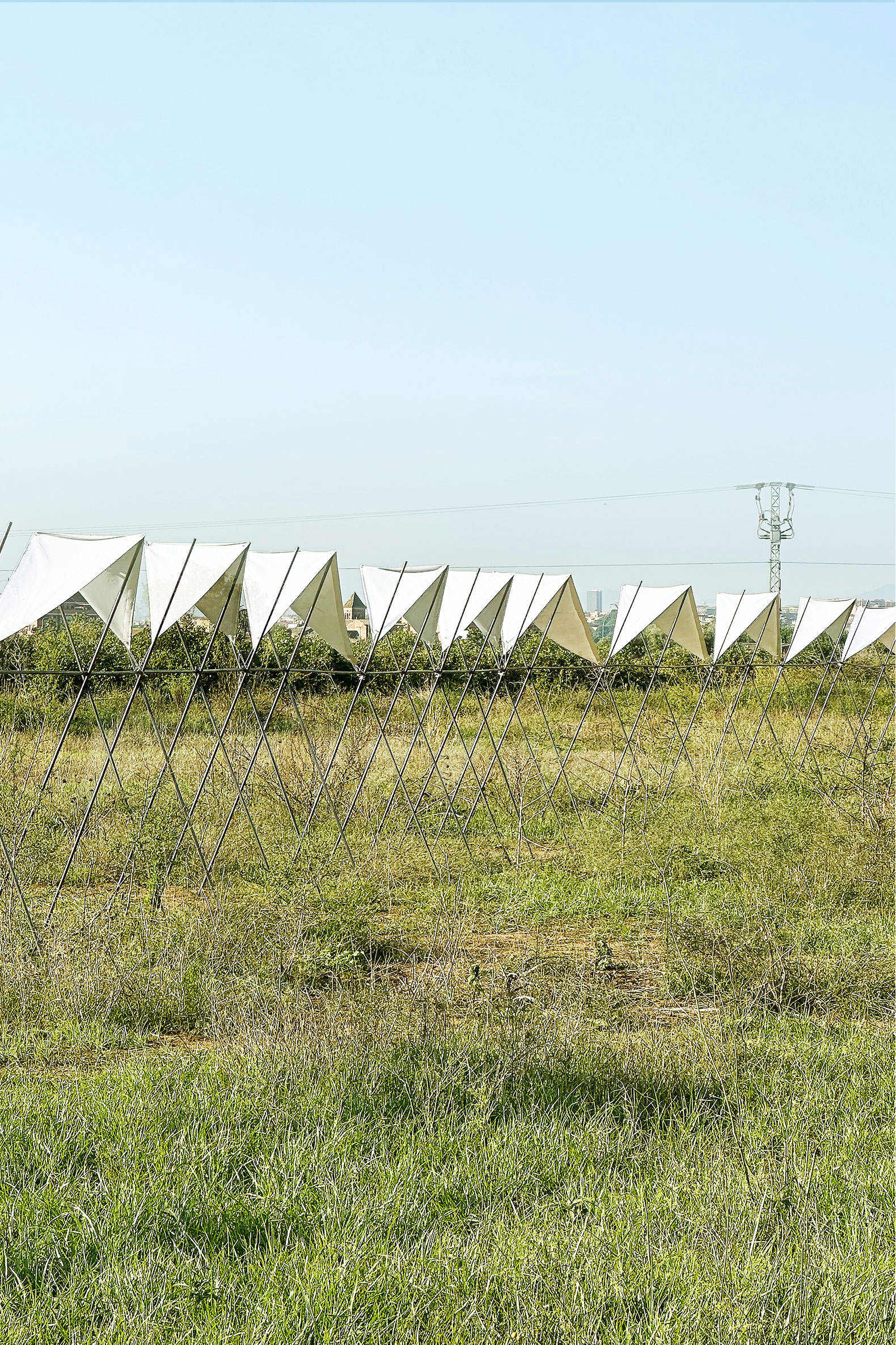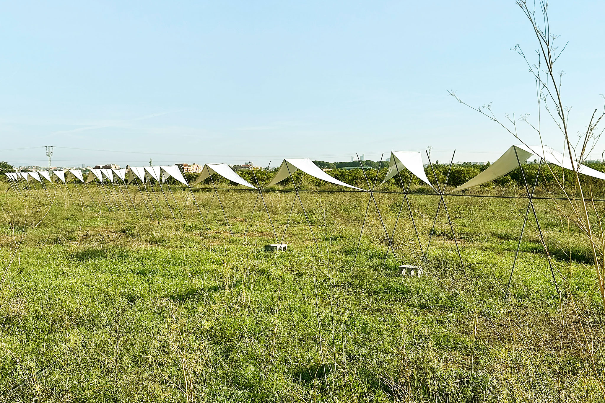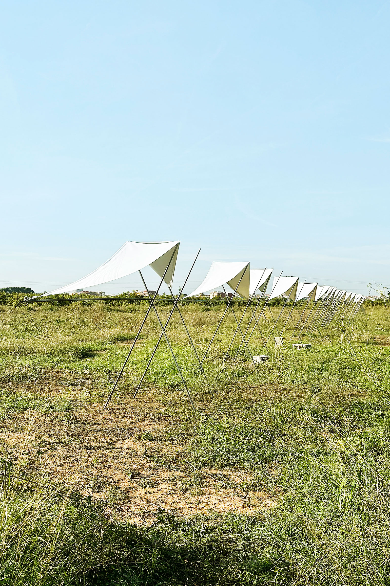 La cubierta está realizada con tela textil tensionada y adaptada al suelo sobre tubos redondos de acero corrugado, generando un juego de luces y sombras que remite a los ritmos del cultivo, las protecciones estacionales y los cuidados del campo.