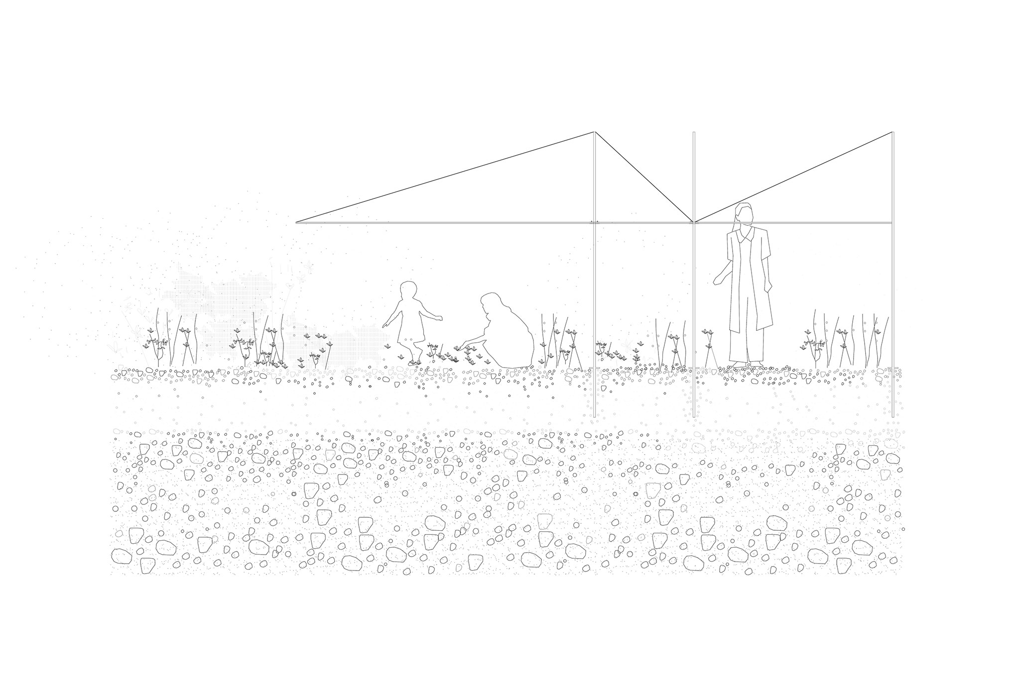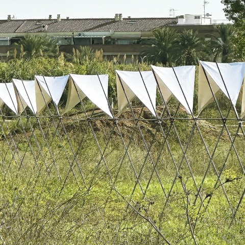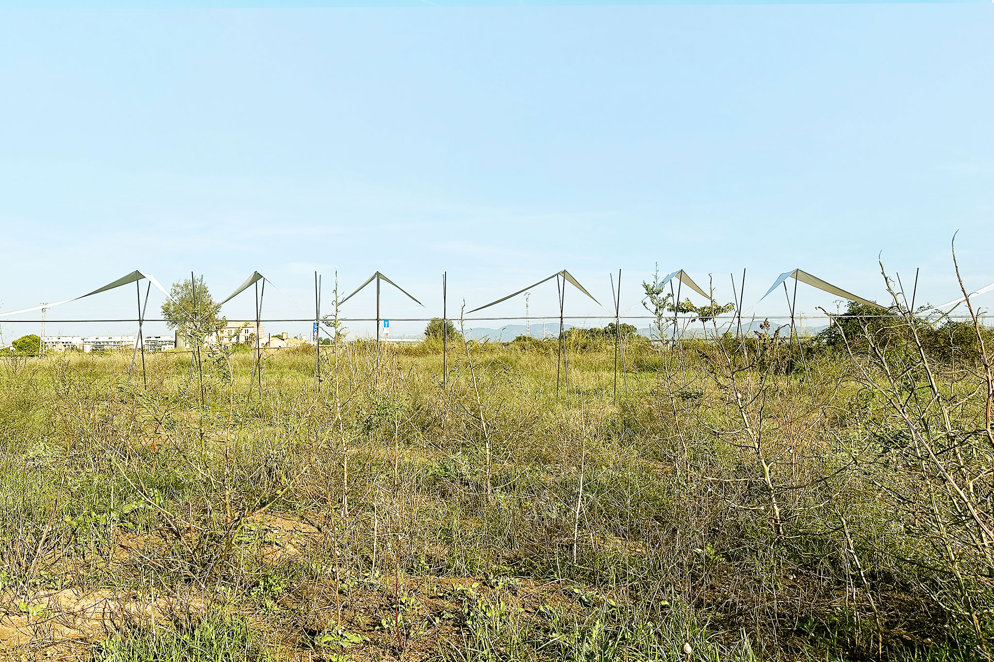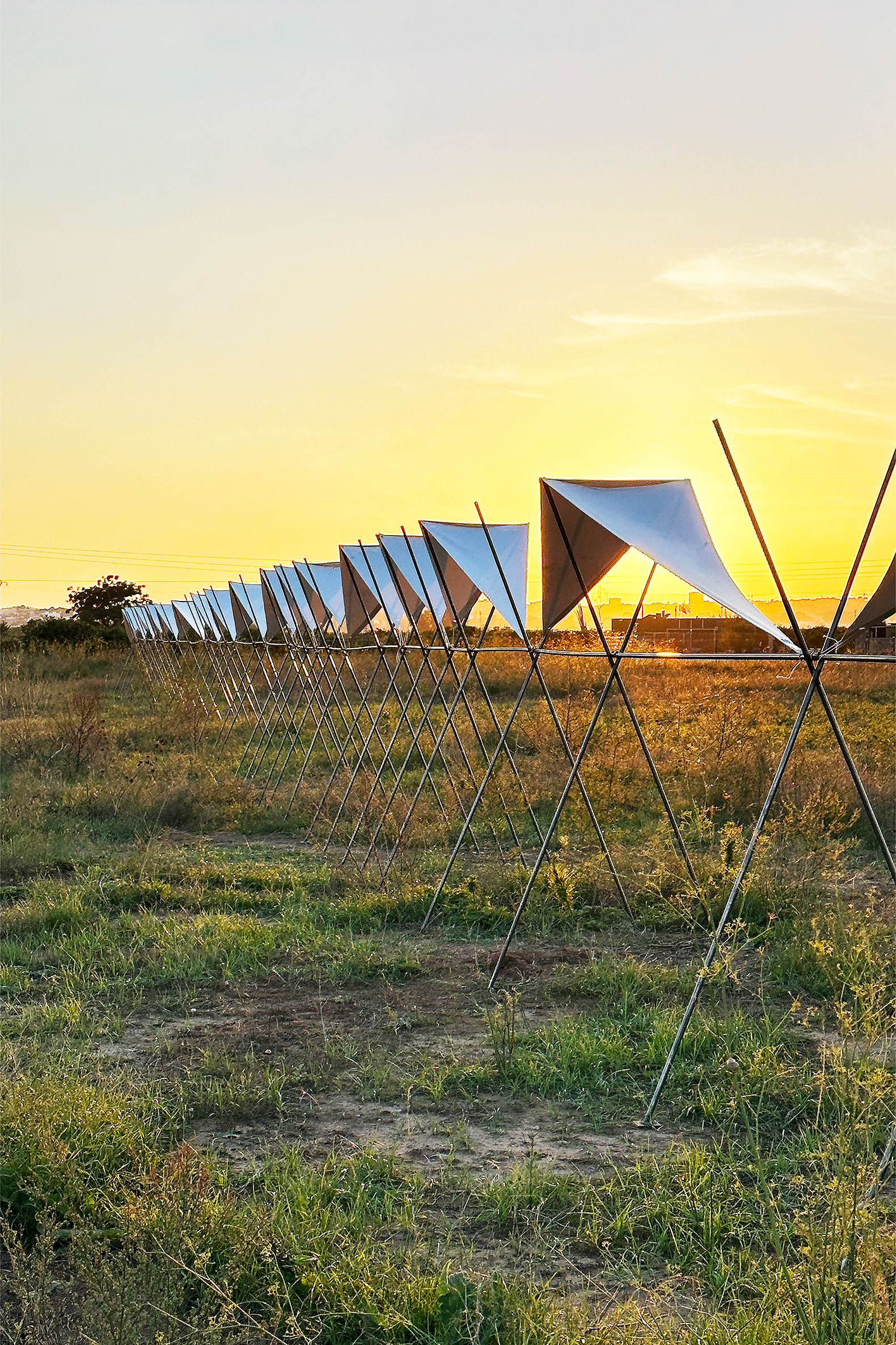 La cubierta está realizada con tela textil tensionada y adaptada al suelo sobre tubos redondos de acero corrugado, generando un juego de luces y sombras que remite a los ritmos del cultivo, las protecciones estacionales y los cuidados del campo.