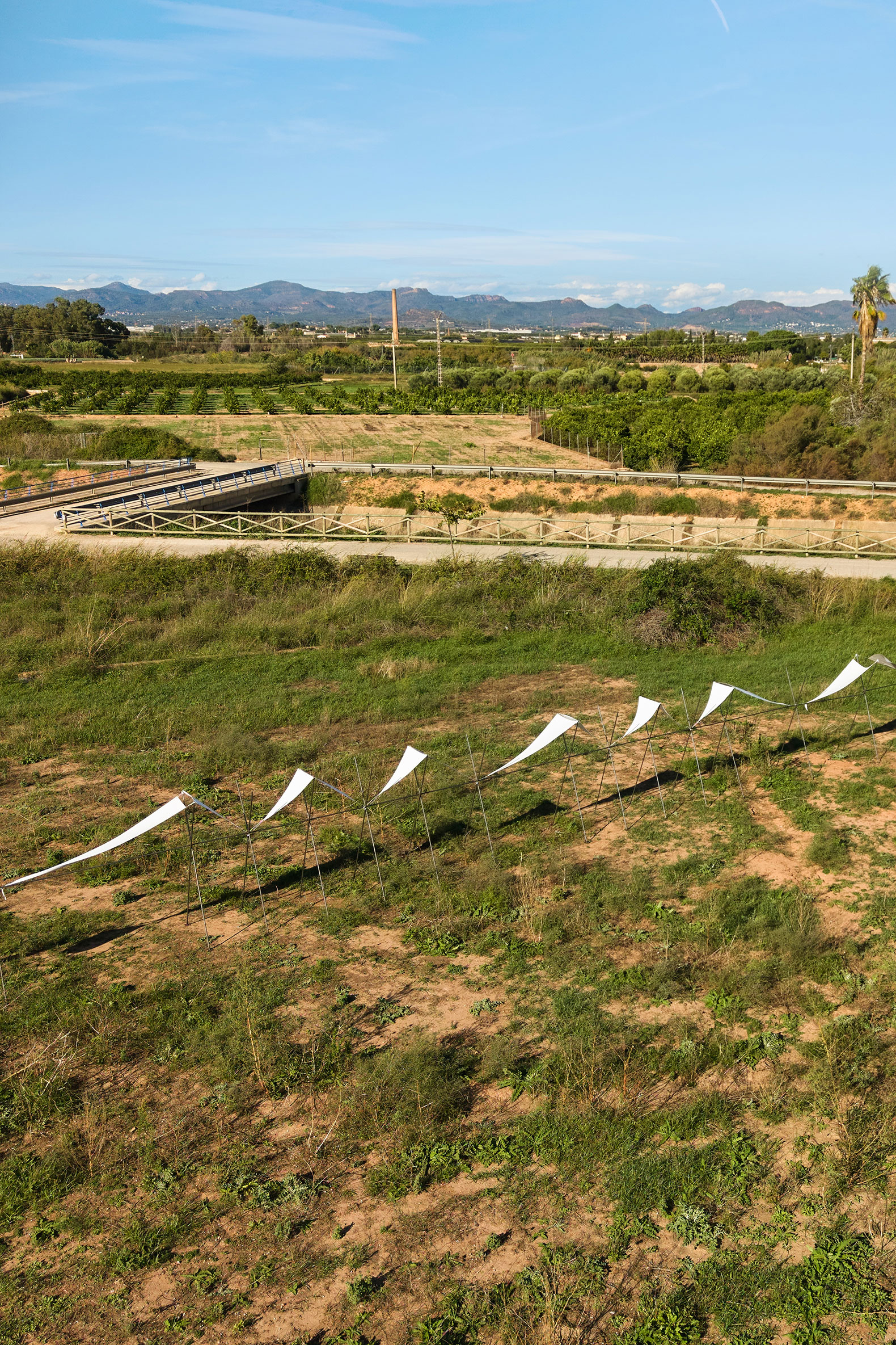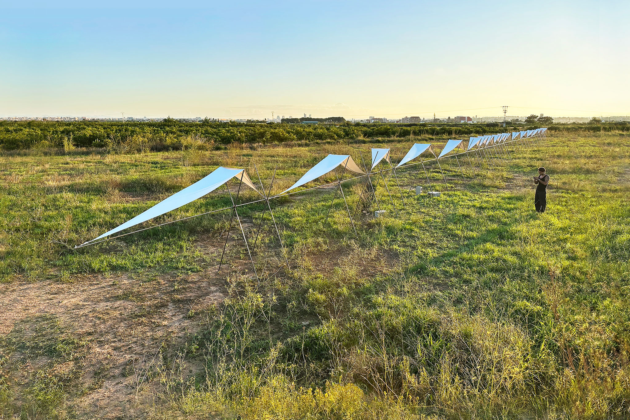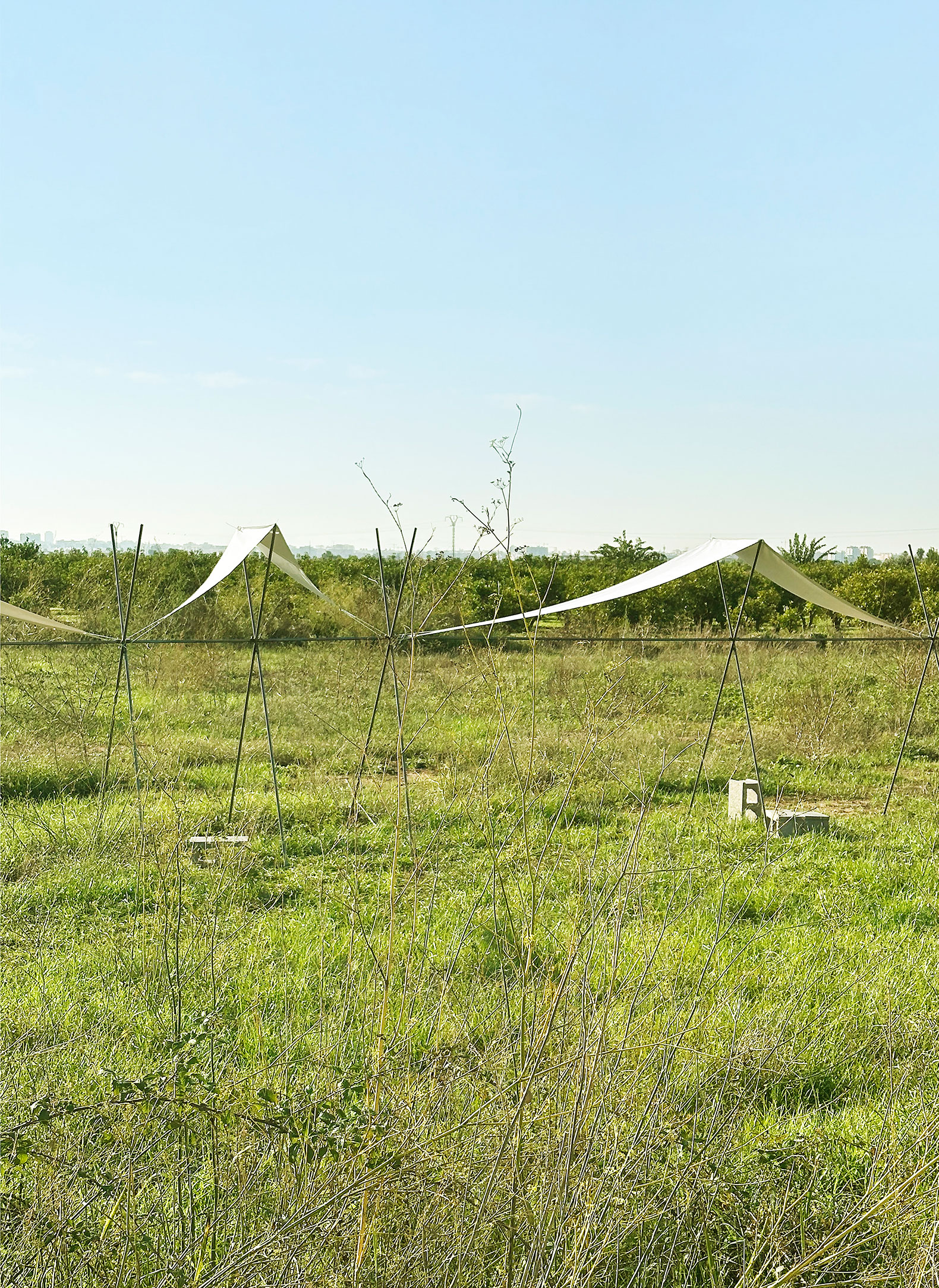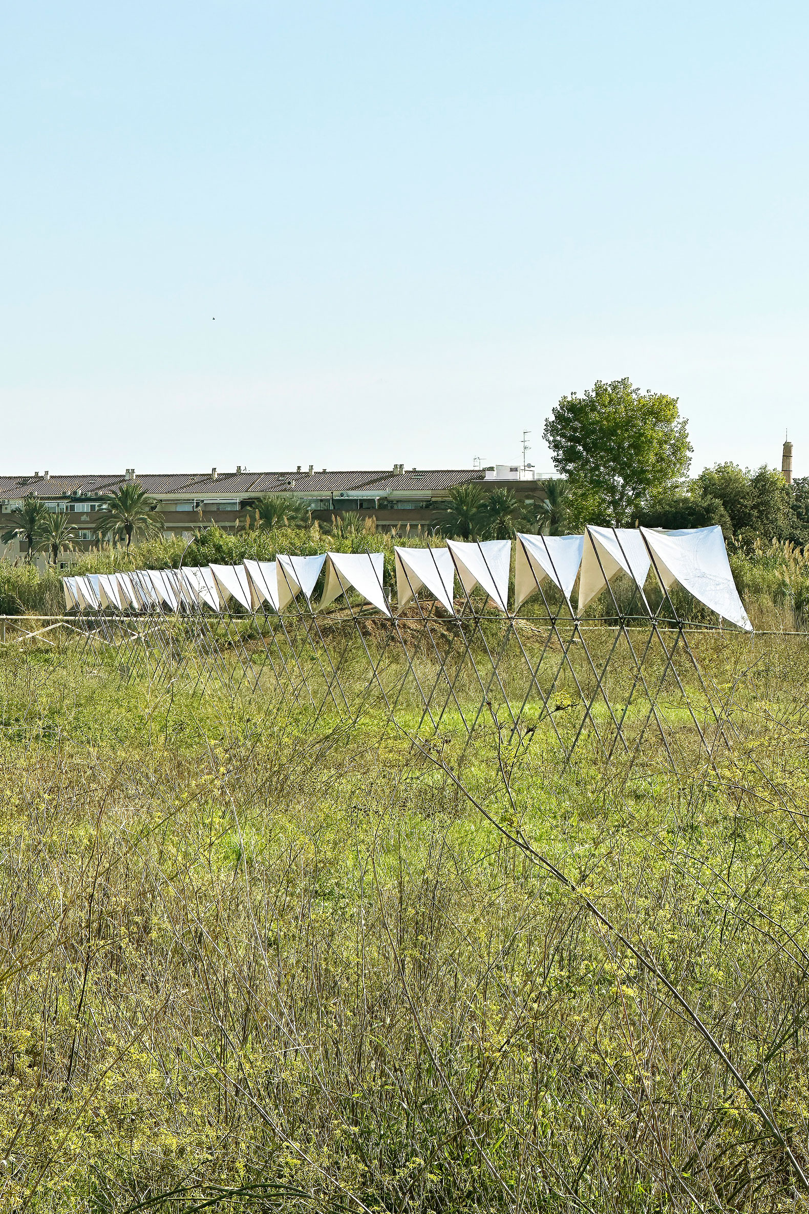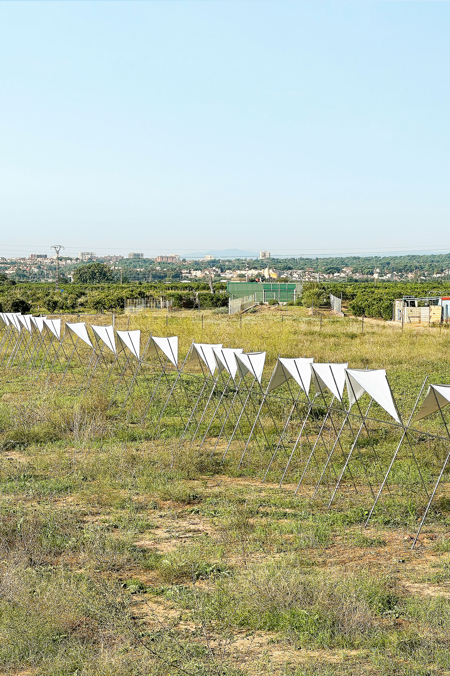 El pabellón 100 metros lineales se inserta en el paisaje de la huerta valenciana como una línea sutil y evocadora, construida a partir de la repetición rítmica de un pórtico reinterpretado. Esta estructura, inspirada en las tradicionales tomateras de madera que durante generaciones han sostenido el cultivo de tomates en la región, se adapta al presente mediante el uso de redondos de acero corrugado: un material contemporáneo, reciclable y reversible que mantiene la ligereza y la honestidad constructiva del original.