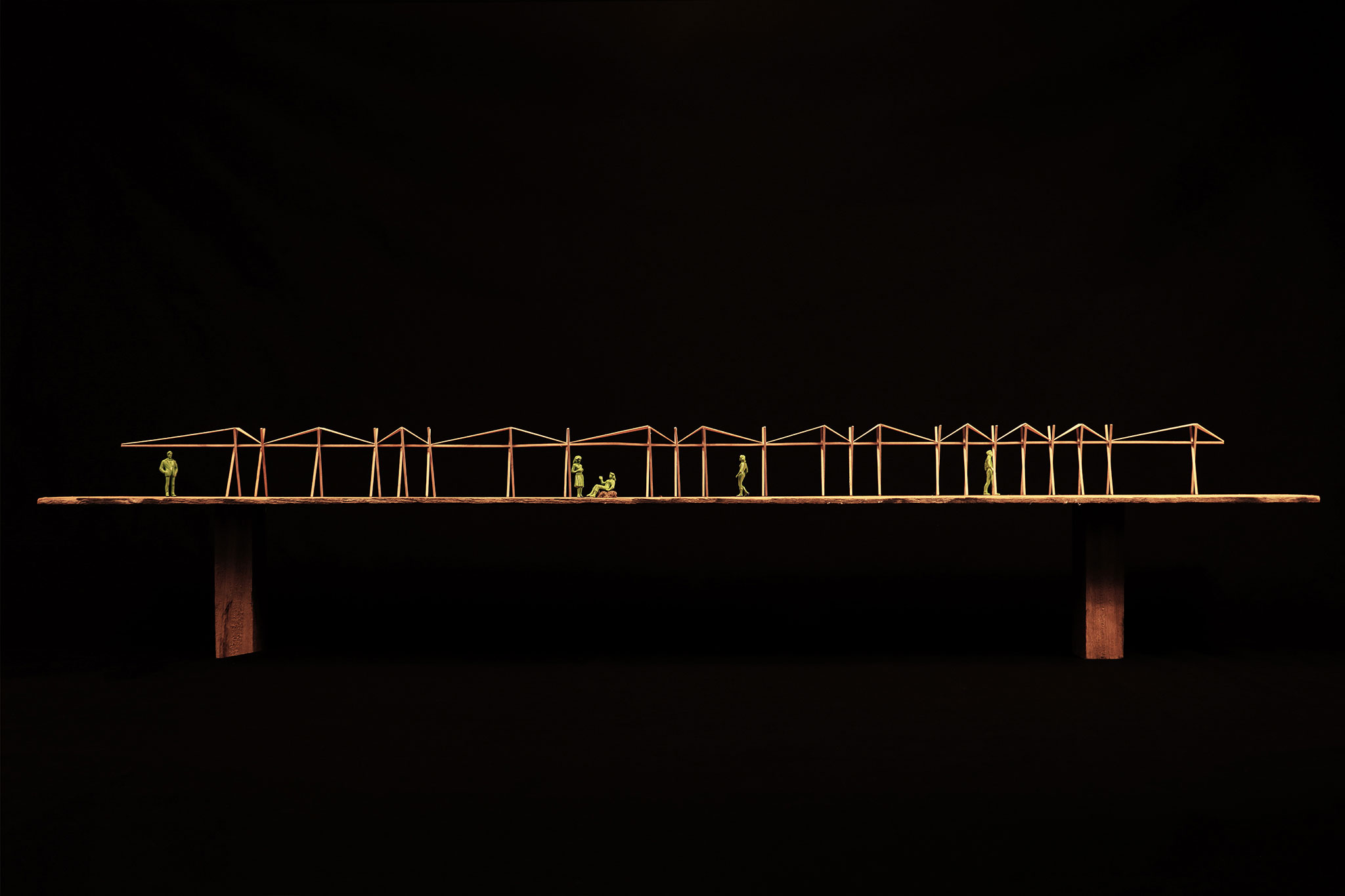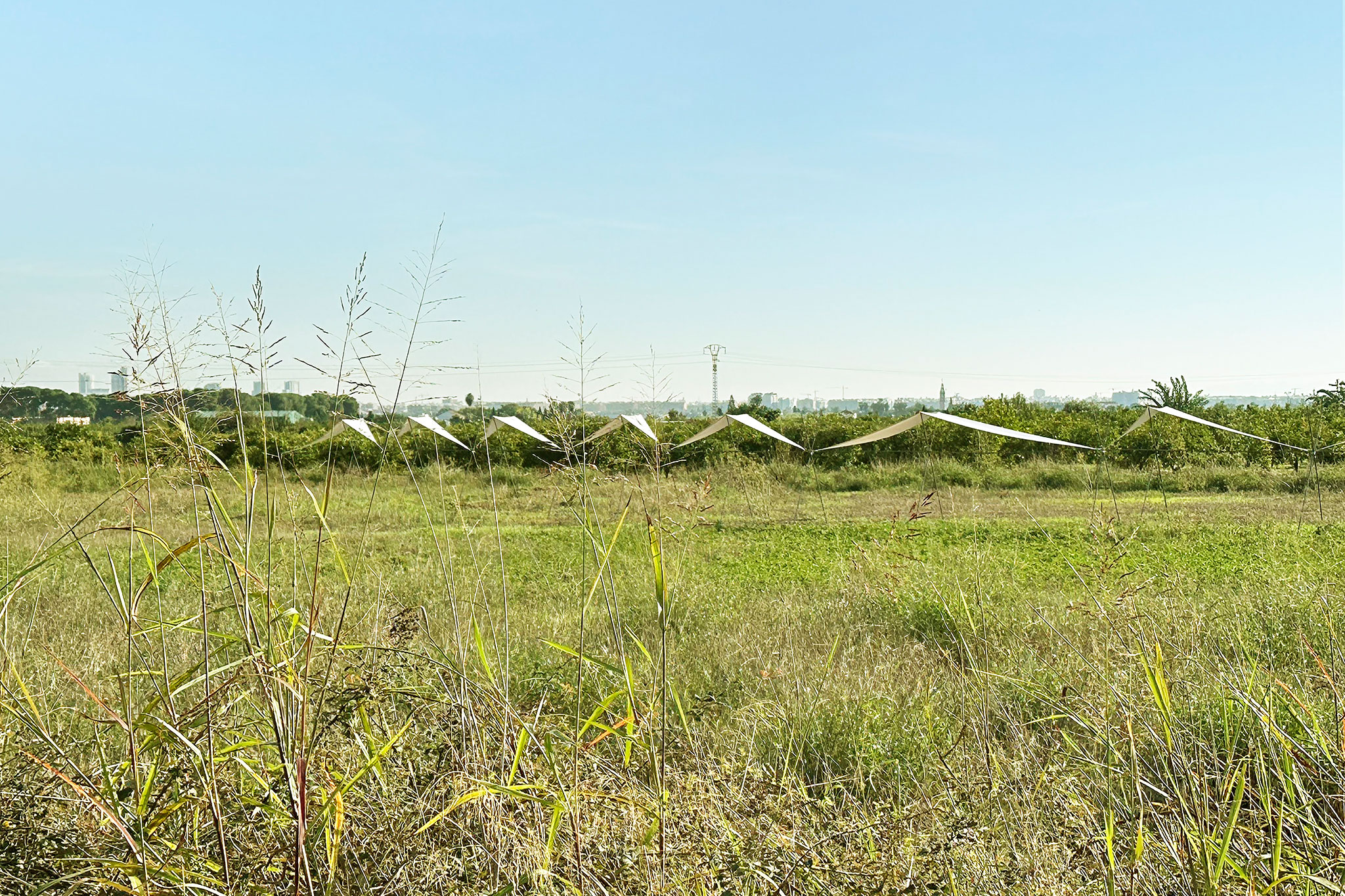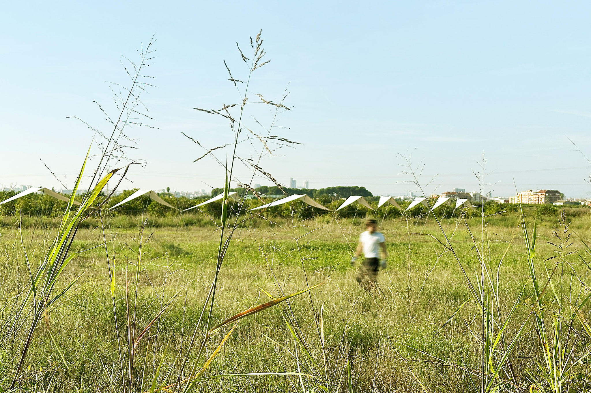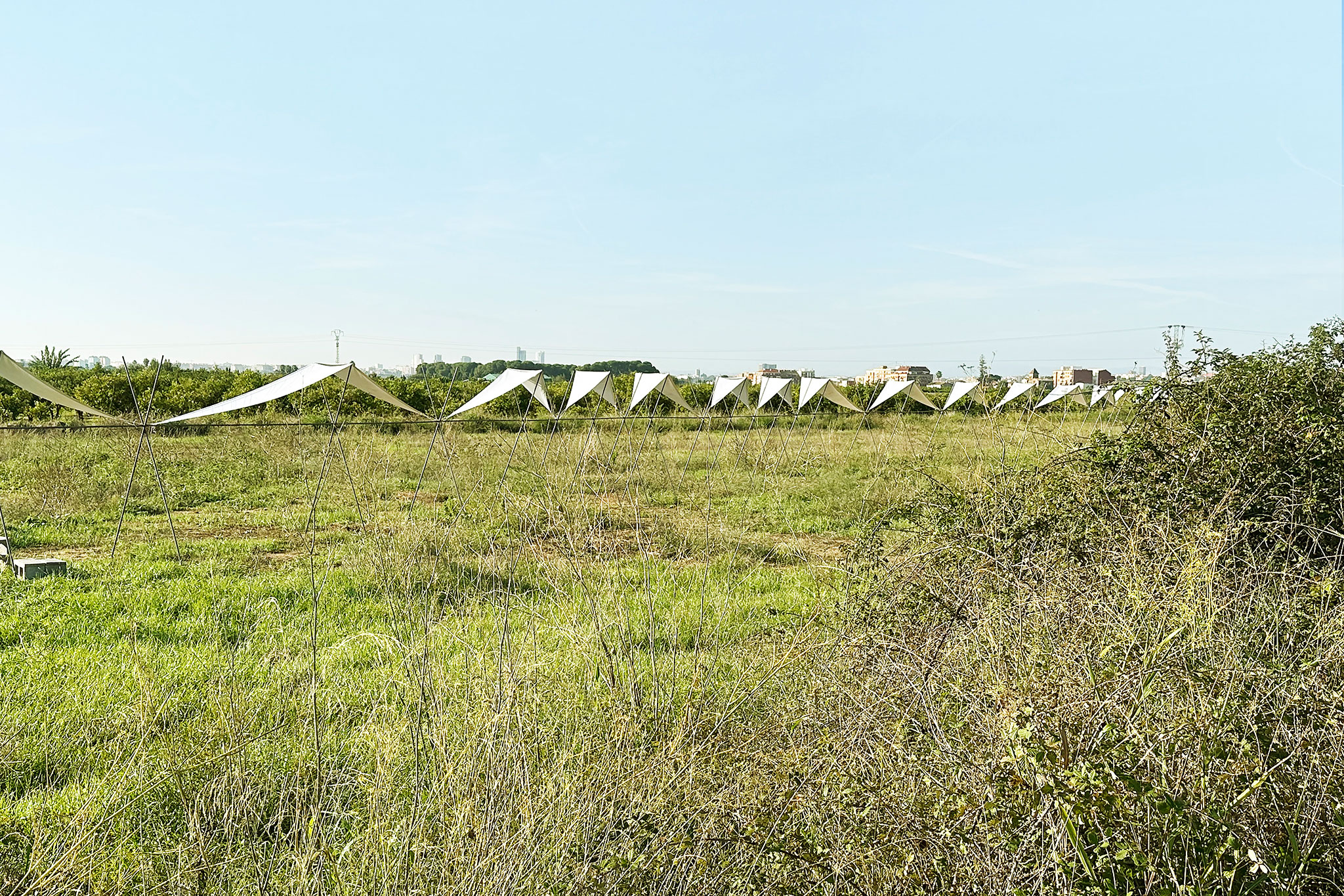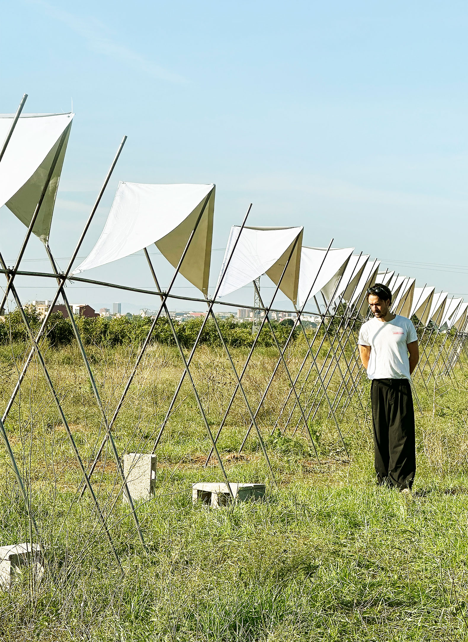 El pabellón 100 metros lineales se inserta en el paisaje de la huerta valenciana como una línea sutil y evocadora, construida a partir de la repetición rítmica de un pórtico reinterpretado. Esta estructura, inspirada en las tradicionales tomateras de madera que durante generaciones han sostenido el cultivo de tomates en la región, se adapta al presente mediante el uso de redondos de acero corrugado: un material contemporáneo, reciclable y reversible que mantiene la ligereza y la honestidad constructiva del original.