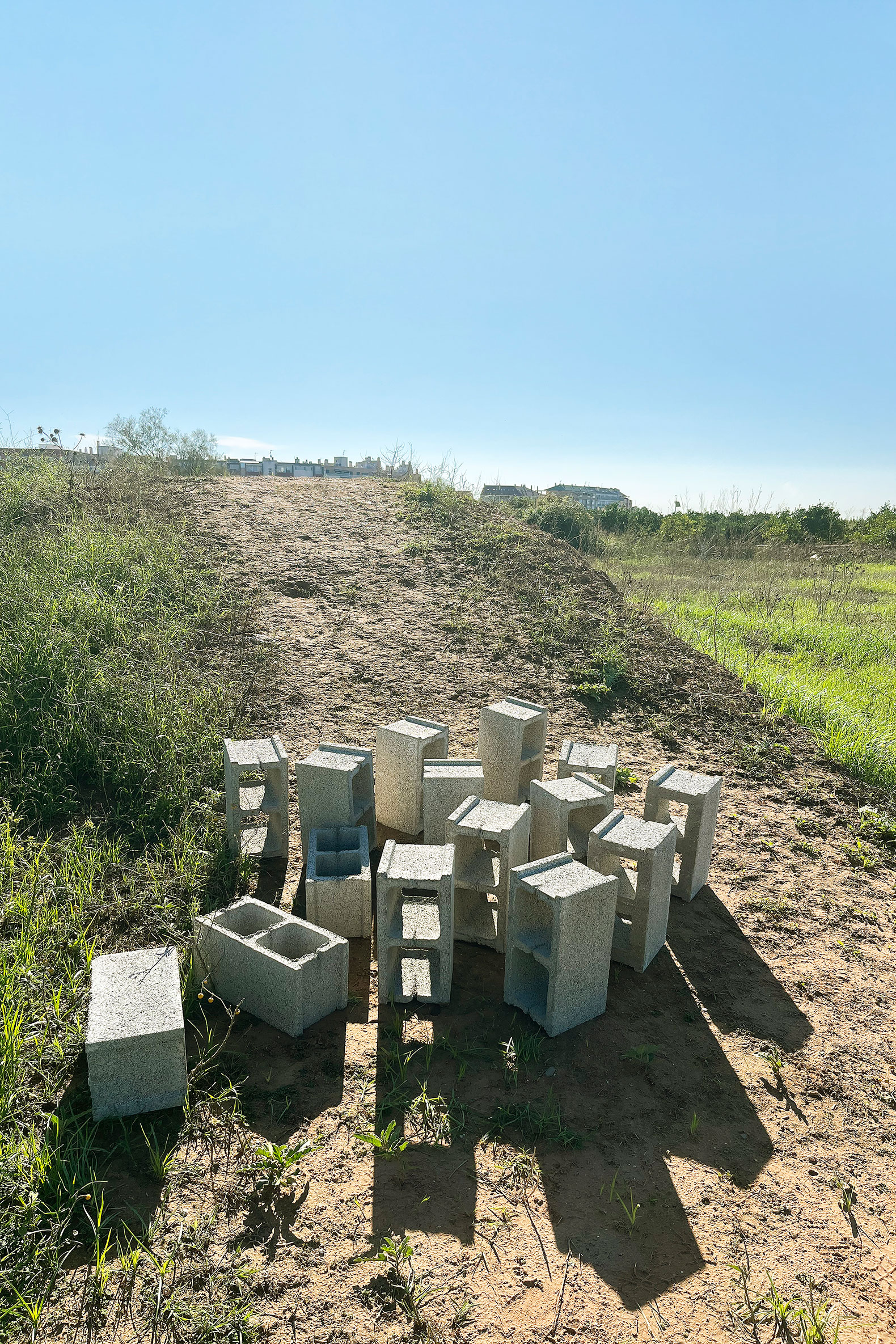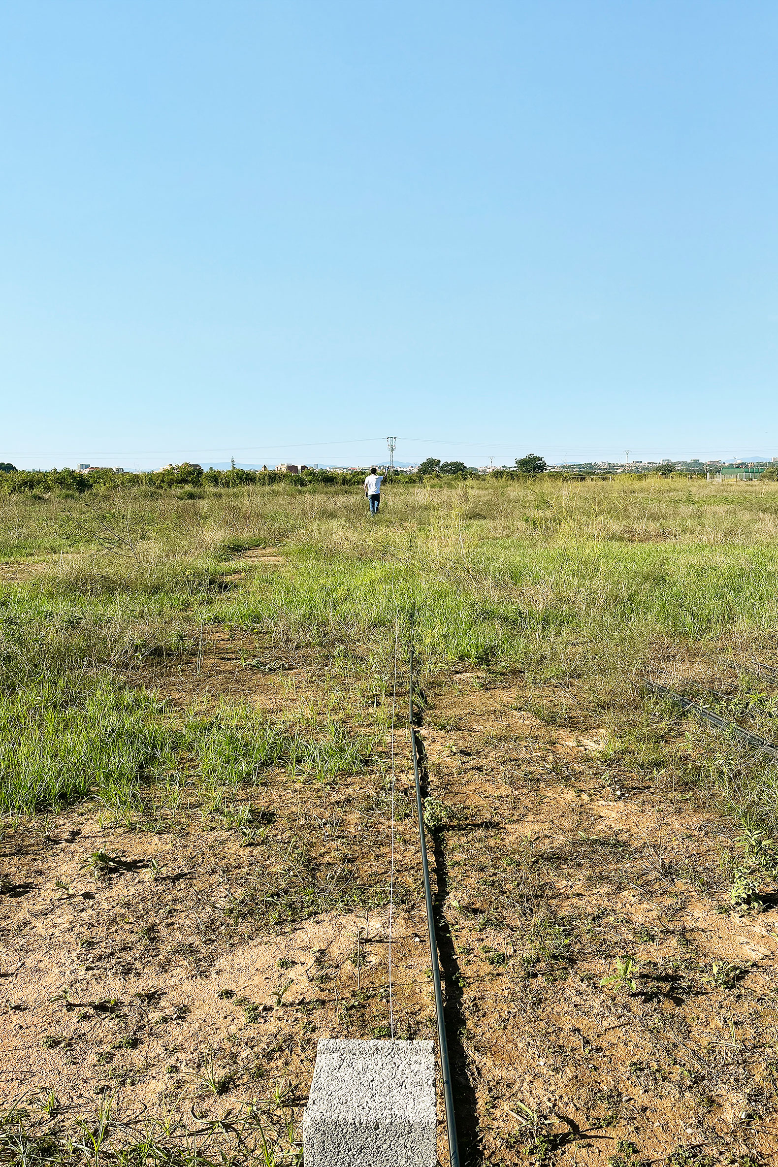 La propuesta establece un diálogo entre memoria agrícola y arte contemporáneo, articulando una línea de 100 metros que no impone una forma cerrada, sino que activa el territorio mediante un gesto mínimo pero poderoso. Esta línea, construida por la reiteración casi musical del módulo, no solo invita a recorrer, sino a mirar, habitar y escuchar la huerta.