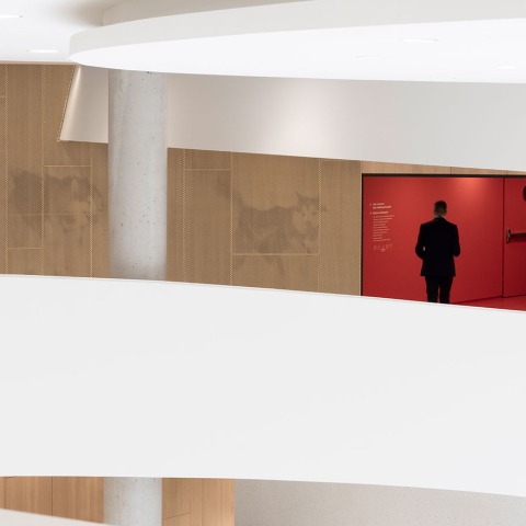 Todos los programas están organizados en torno a la rampa, lo que proporciona estructura mientras guía la circulación de visitantes. A lo largo de la rampa, se encuentran espacios para recepción, seguridad y check-in, guardarropas, salas multifuncionales y salas de comisiones, lo que permite al visitante descubrir no solo la evolución de nuestra democracia, sino también su funcionamiento en tiempo real, a través de ventanas y paneles informativos que ofrecen una inmersión en debates parlamentarios. La interacción de los esquemas de iluminación y color confiere al sendero una calidad de museo, con cambios tonales de blanco a azul a rojo, una referencia al salón azul y al salón rojo de la Asamblea Nacional. Un túnel, que alberga la obra de Jonathan Villeneuve Le Specter des Lumière, conduce a un ascensor que proporciona acceso a los pisos superiores del edificio del Parlamento.