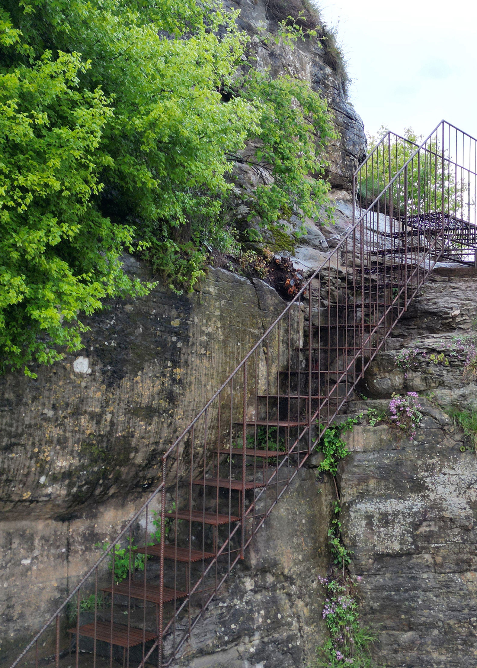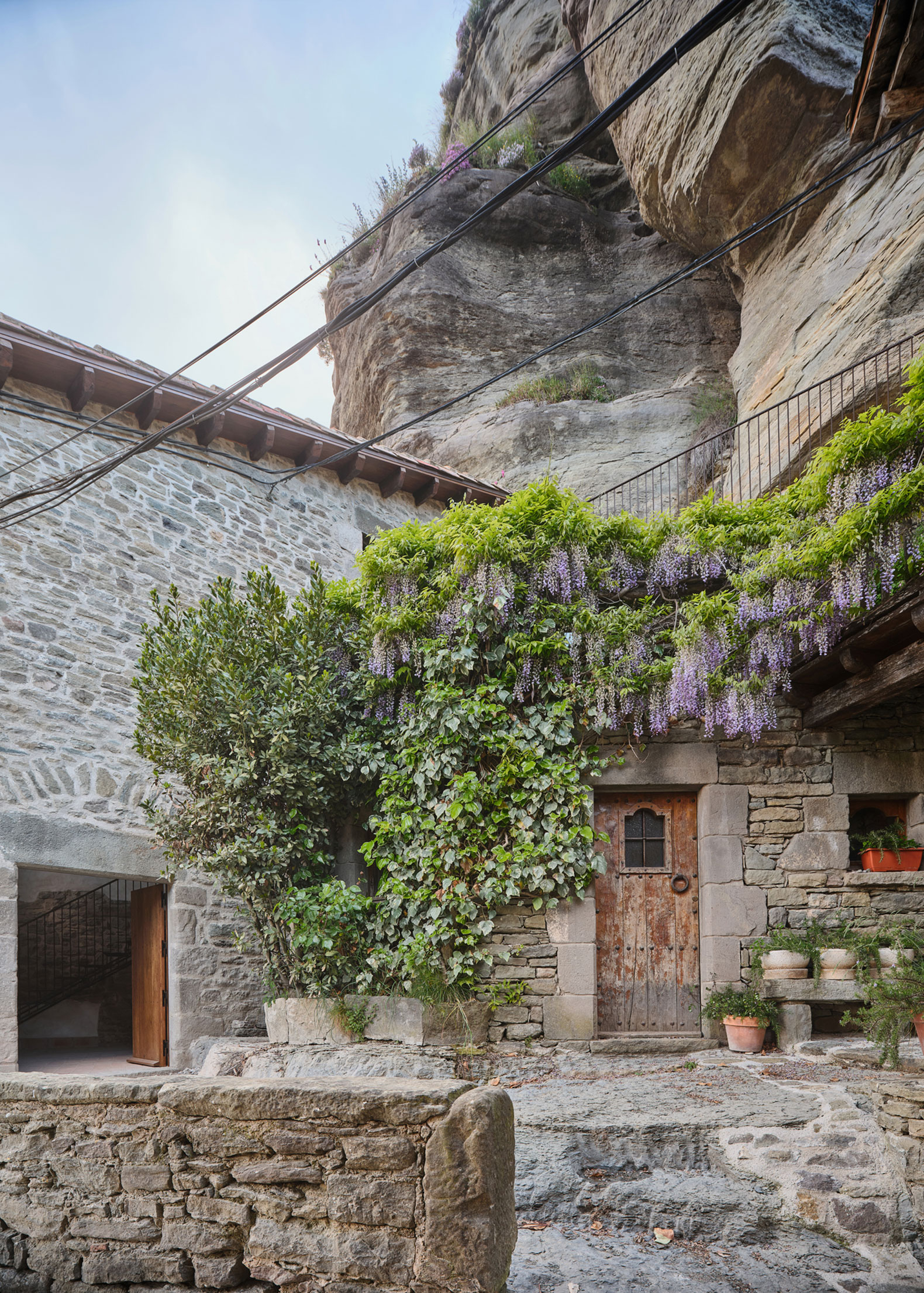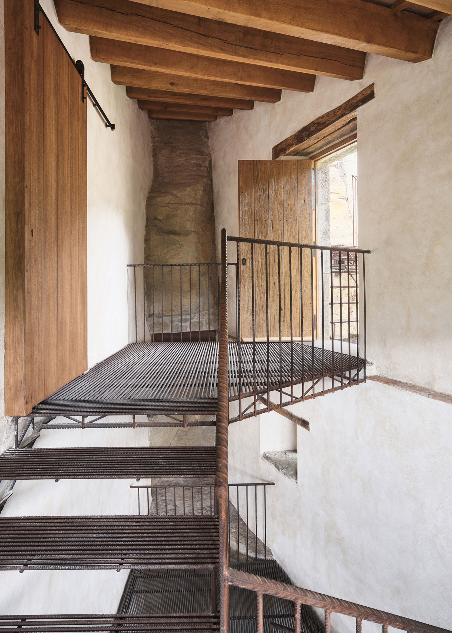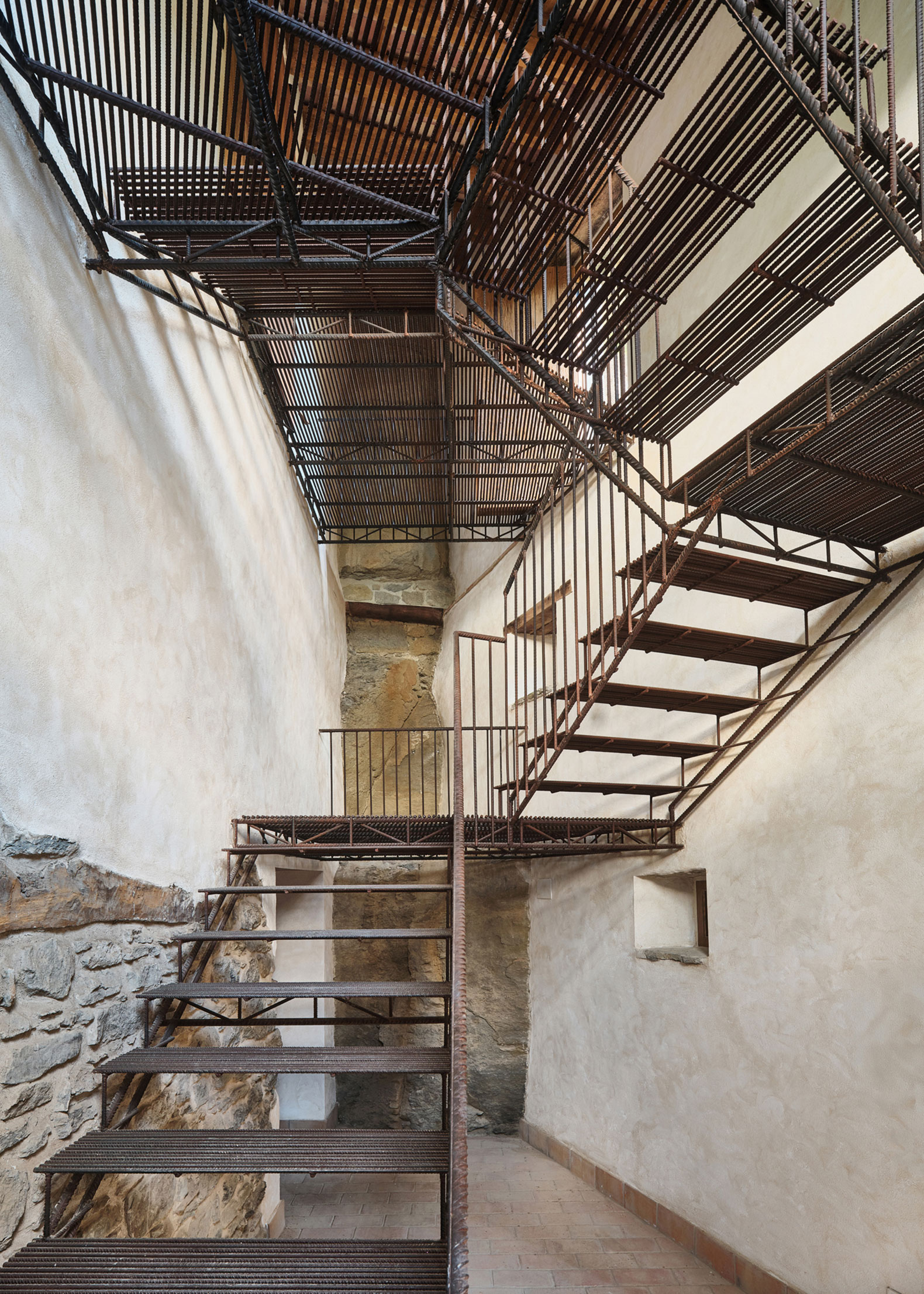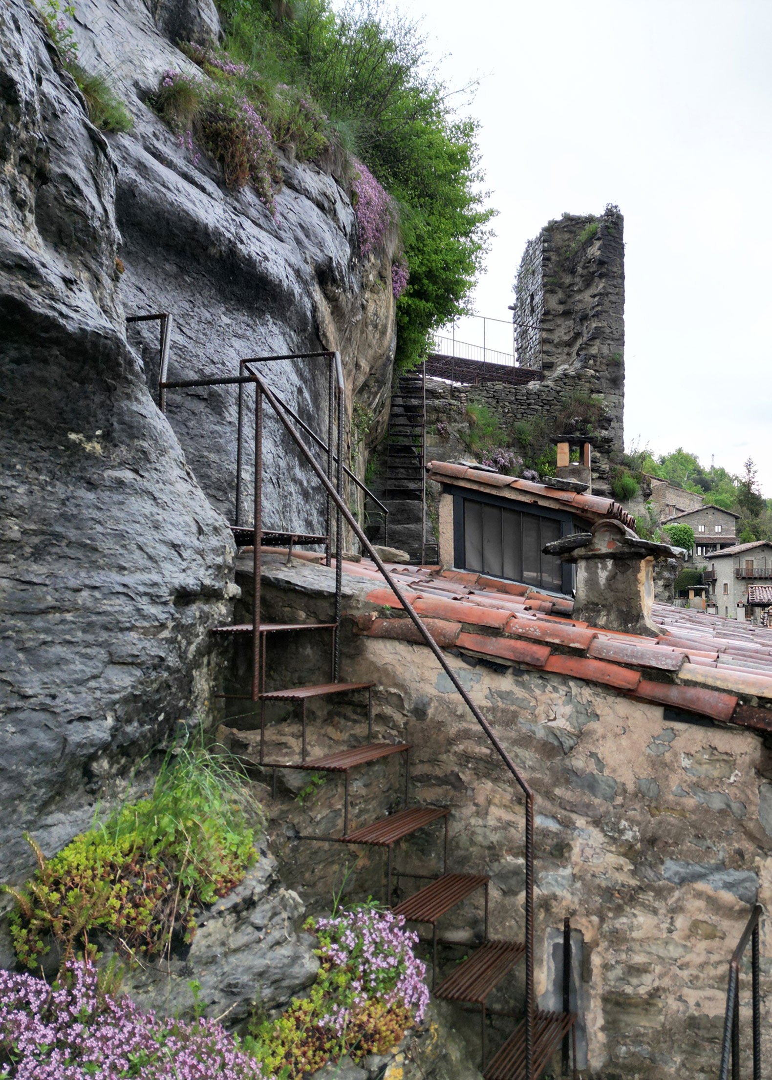 Se plantea un nuevo acceso a través de la finca de Can Saltiri, que permite salvar el desnivel existente entre la calle y el primer peldaño conservado en la roca, situado entre el peñasco y la medianera del edificio de la calle del Fossar. A partir del vaciado interior de la finca, se propone una escalera que resigue los niveles originales y pone en valor elementos preexistentes, como la chimenea o la roca de la medianera. La conexión con el arranque de las escaleras originales se realiza mediante una pasarela volada sobre la finca vecina. El siguiente desnivel, de unos tres metros, se resuelve con un tramo de escaleras ancladas directamente a la roca, que dan acceso a un camino situado detrás de las cubiertas de las fincas colindantes. Finalmente, un último tramo de escaleras, que resigue la traza de las escaleras de piedra originales, conduce a una plataforma de observación situada en el interior del trazado de los muros de la antigua torre, desde donde se pueden contemplar tanto los restos arqueológicos como el paisaje que rodea Rupit.