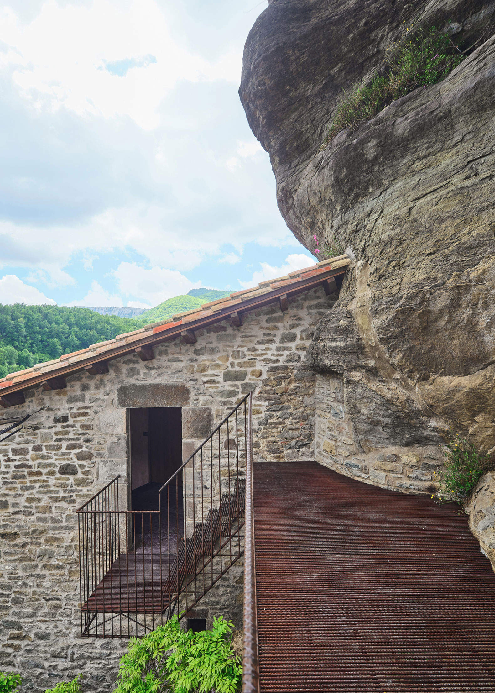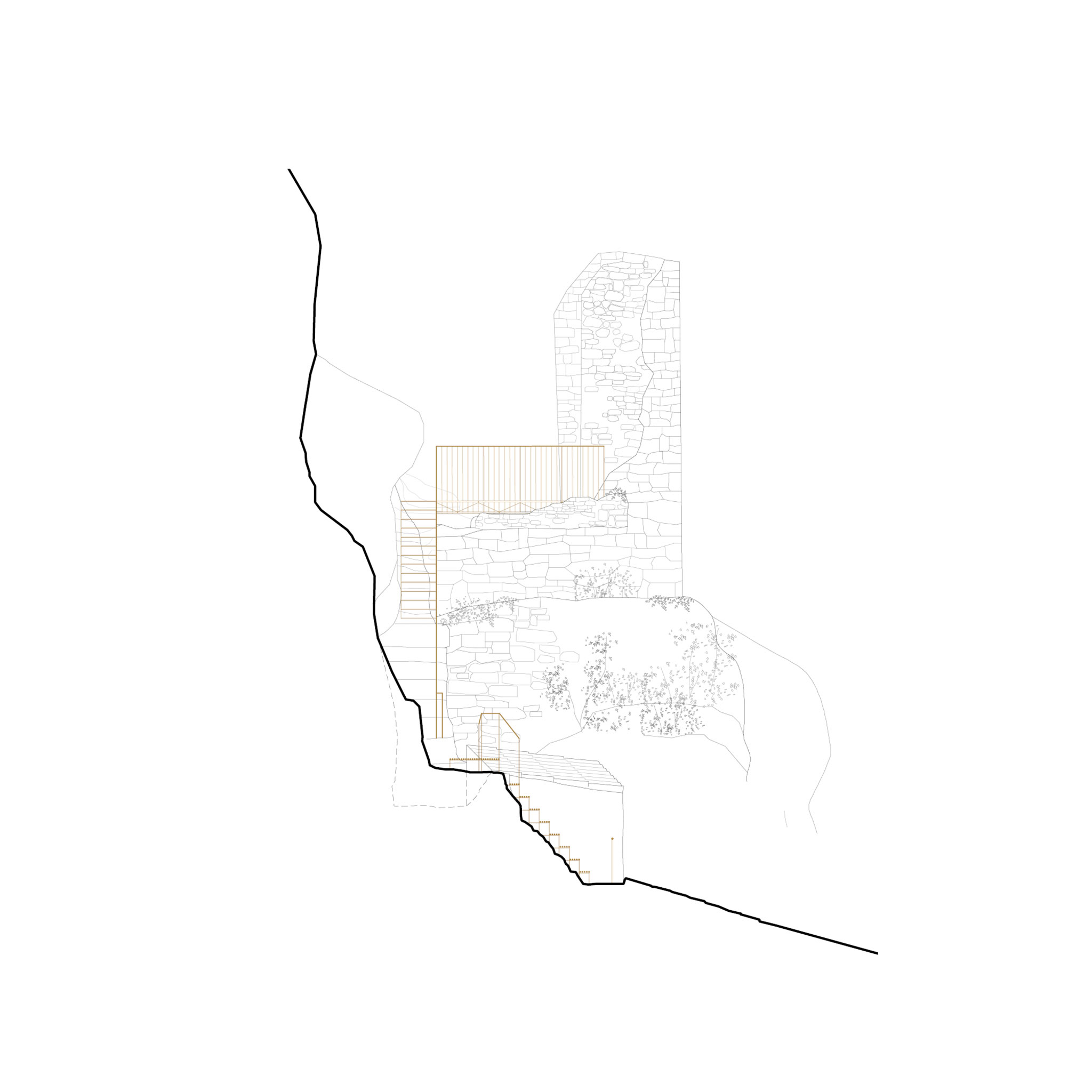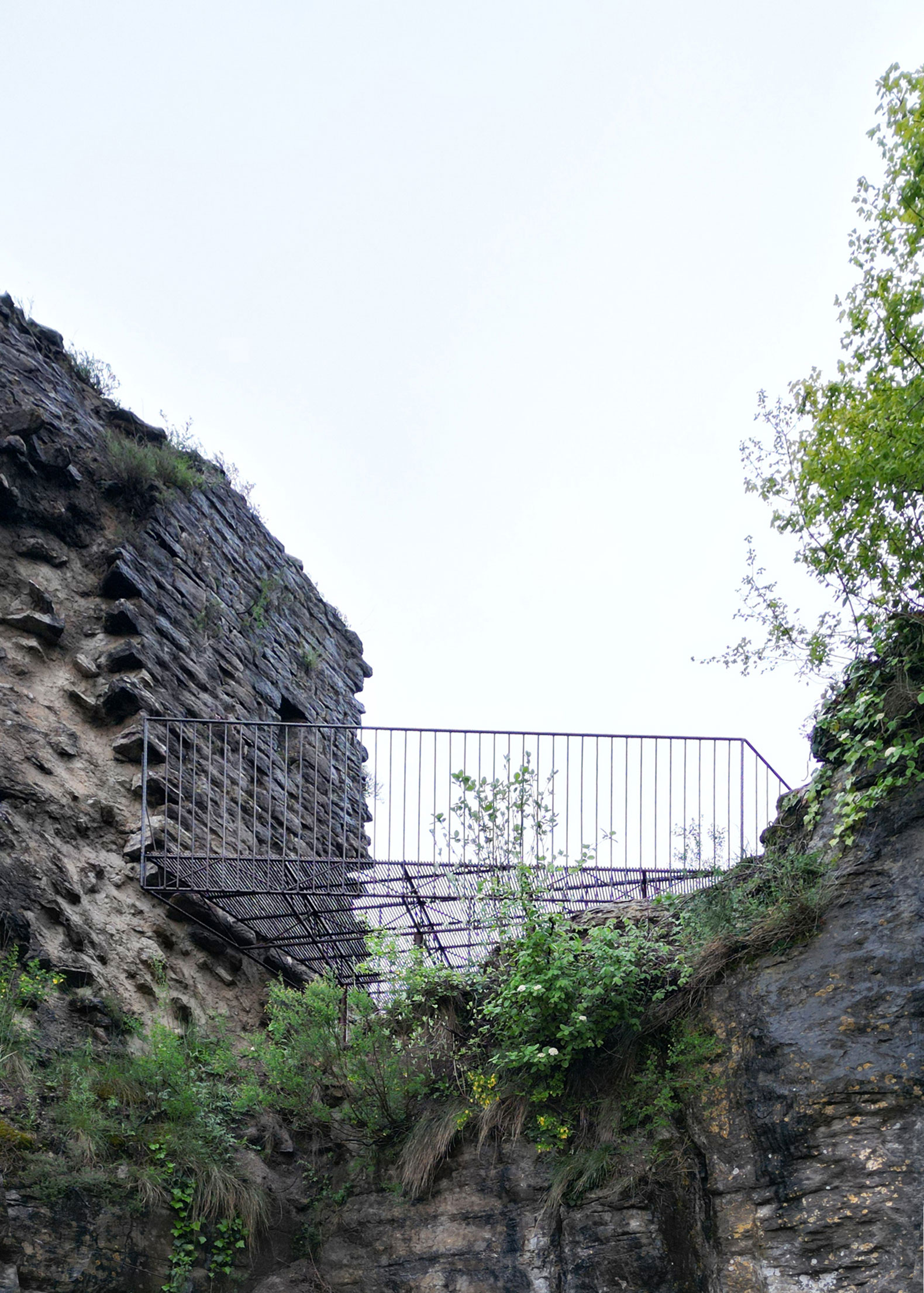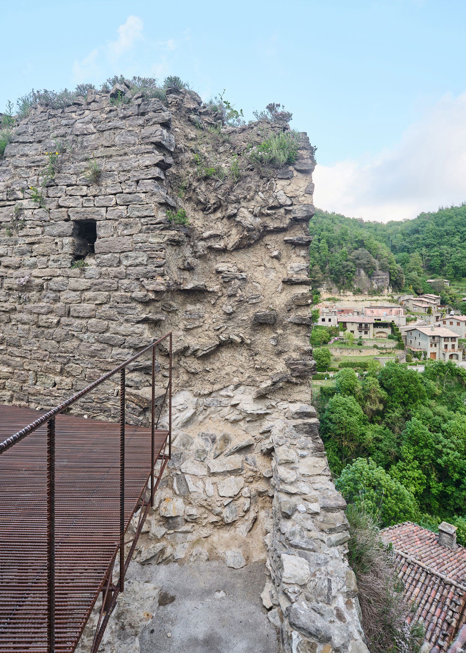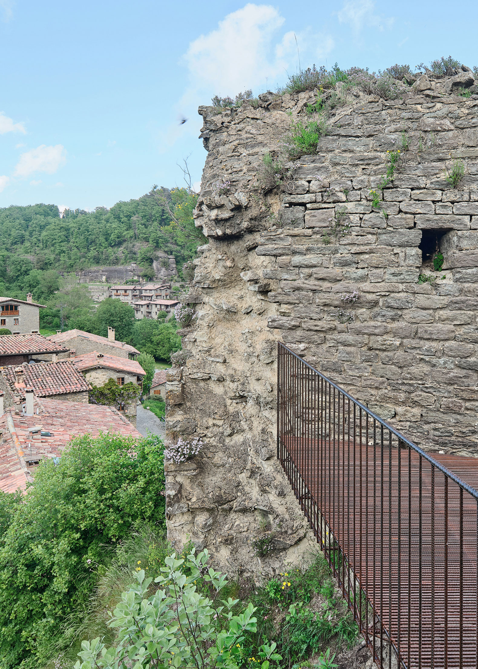 El proyecto tiene como objetivo mejorar el acceso al Castillo de Rupit desde el núcleo urbano y acondicionar un recorrido entre los restos existentes, garantizando la seguridad de los visitantes y poniendo en valor el conjunto arqueológico y paisajístico. Se propone una intervención respetuosa con el entorno, de carácter ligero y mínima afectación con las preexistencias que permita mejorar la comprensión histórica del lugar y reforzar su integración urbana. El itinerario se desarrolla en cuatro tramos que culminan en un mirador y se resuelve utilizando un único material, barras de acero corrugado de diámetro 12 y 25 mm que forman una estructura discontinua de pasarelas que se adapta al perfil de la roca.