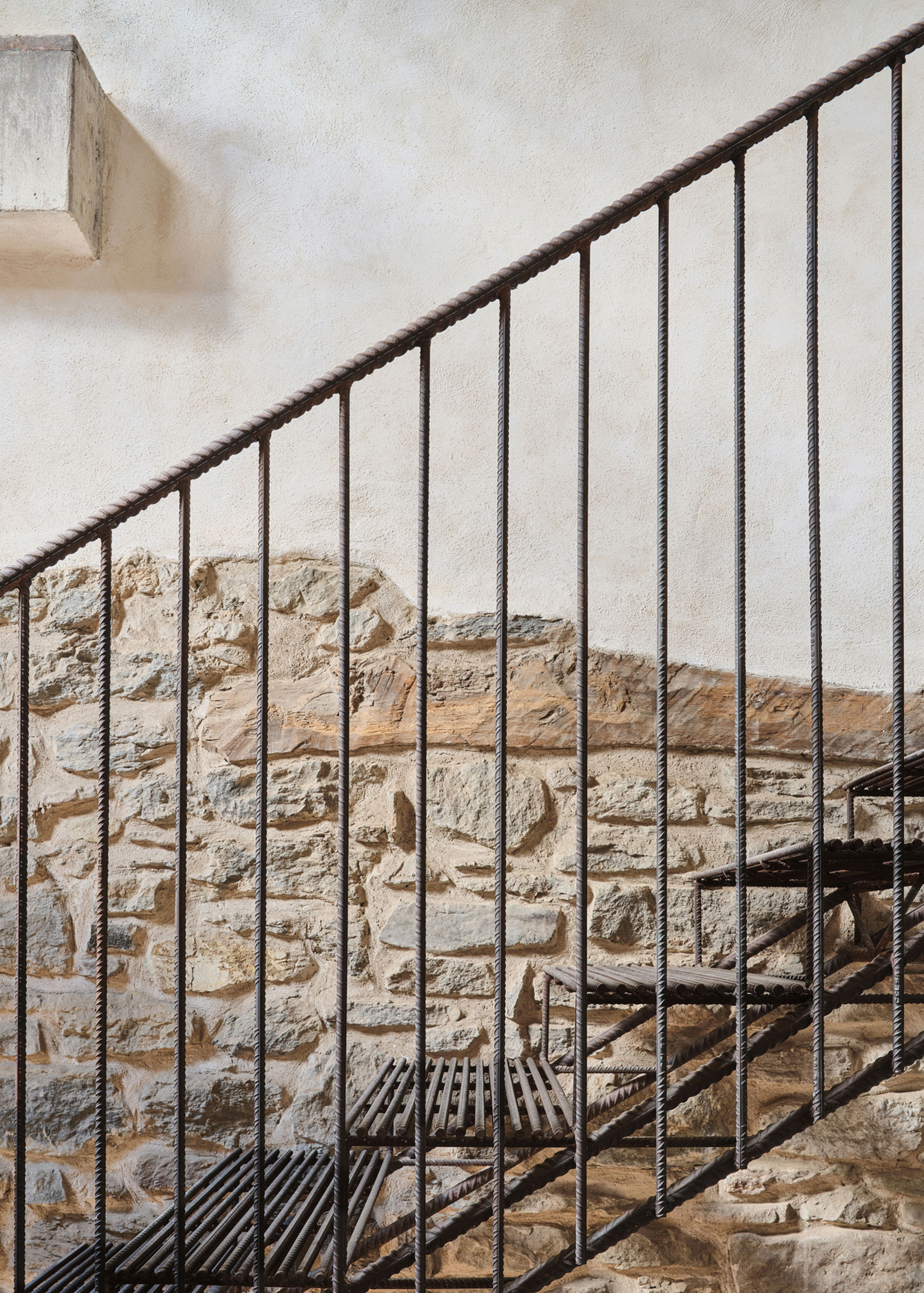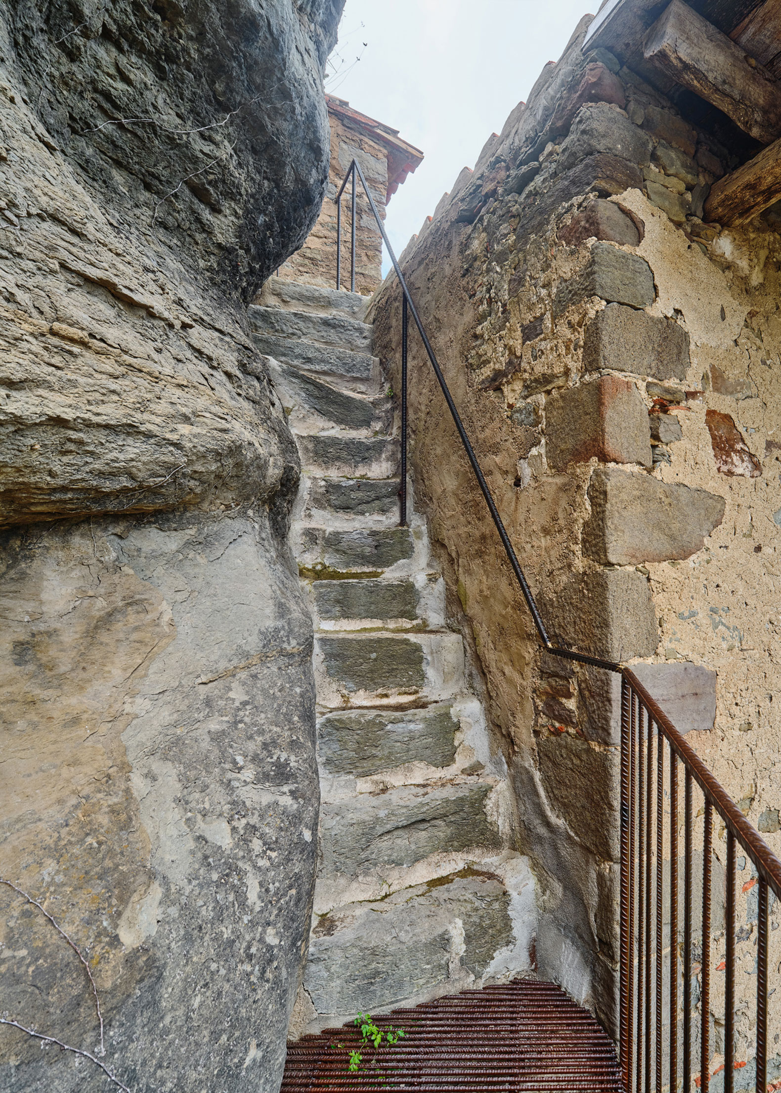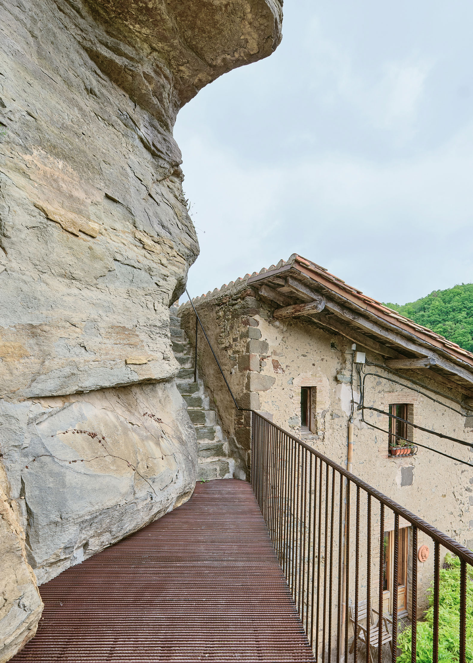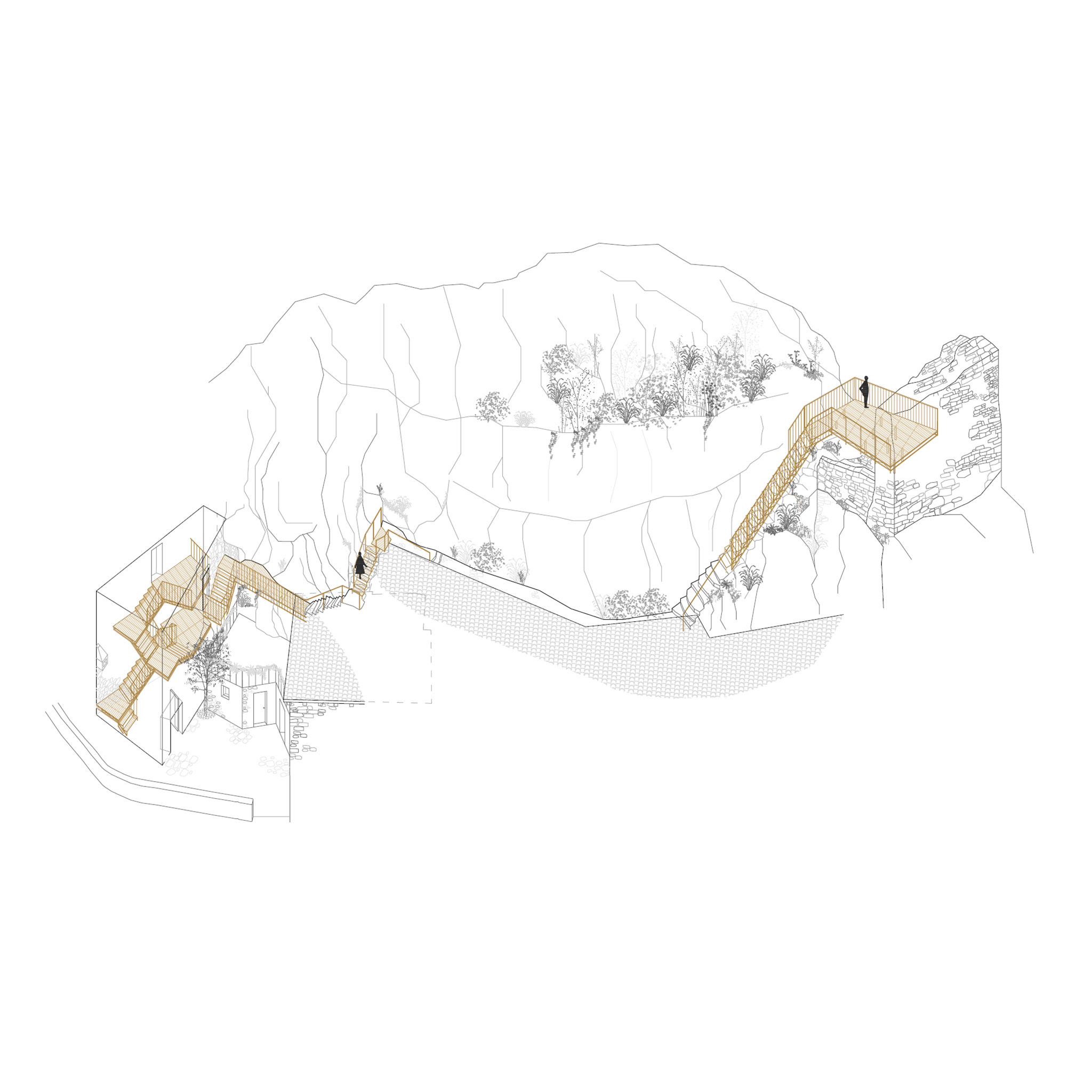 Carles Enrich Studio propone para «Can Saltiri» una intervención sutil que se desarrolla a lo largo de cuatro tramos ascendentes hasta culminar en un mirador. Entre los puntos clave del recorrido destaca una pasarela volada sobre la finca vecina que conecta el nuevo acceso con el arranque de las escaleras originales talladas en la roca.