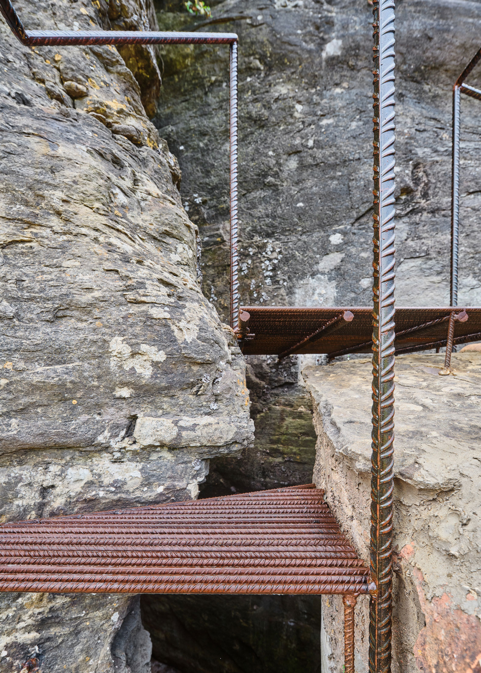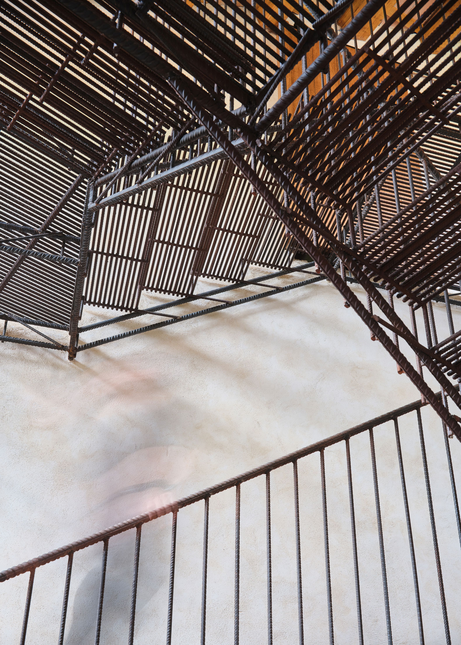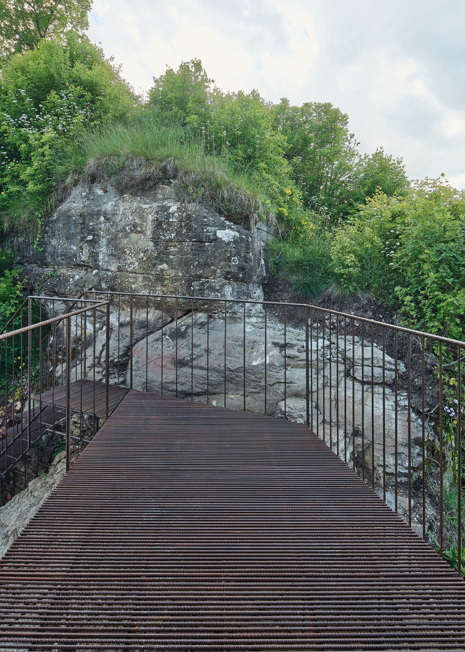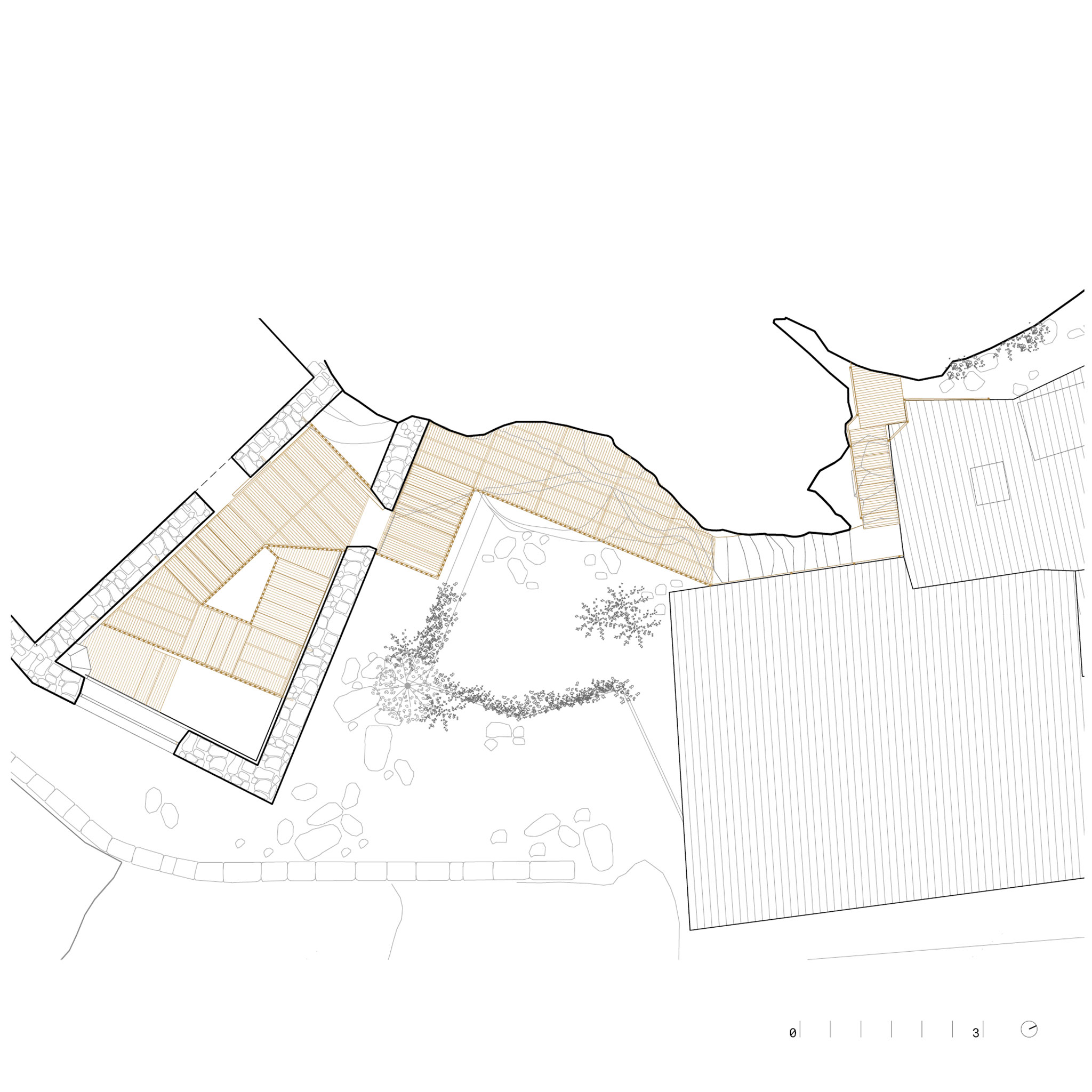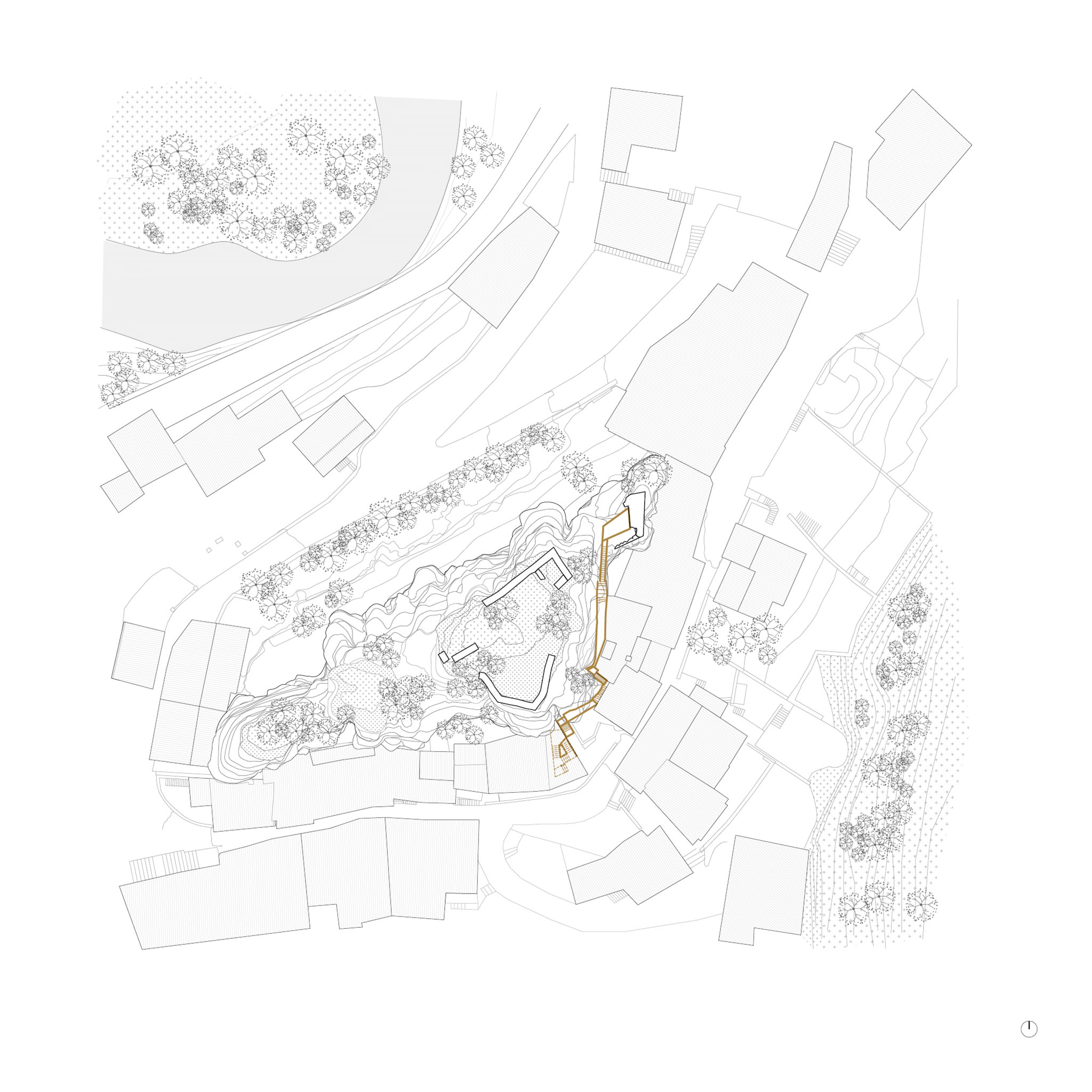 Carles Enrich Studio propone para «Can Saltiri» una intervención sutil que se desarrolla a lo largo de cuatro tramos ascendentes hasta culminar en un mirador. Entre los puntos clave del recorrido destaca una pasarela volada sobre la finca vecina que conecta el nuevo acceso con el arranque de las escaleras originales talladas en la roca.