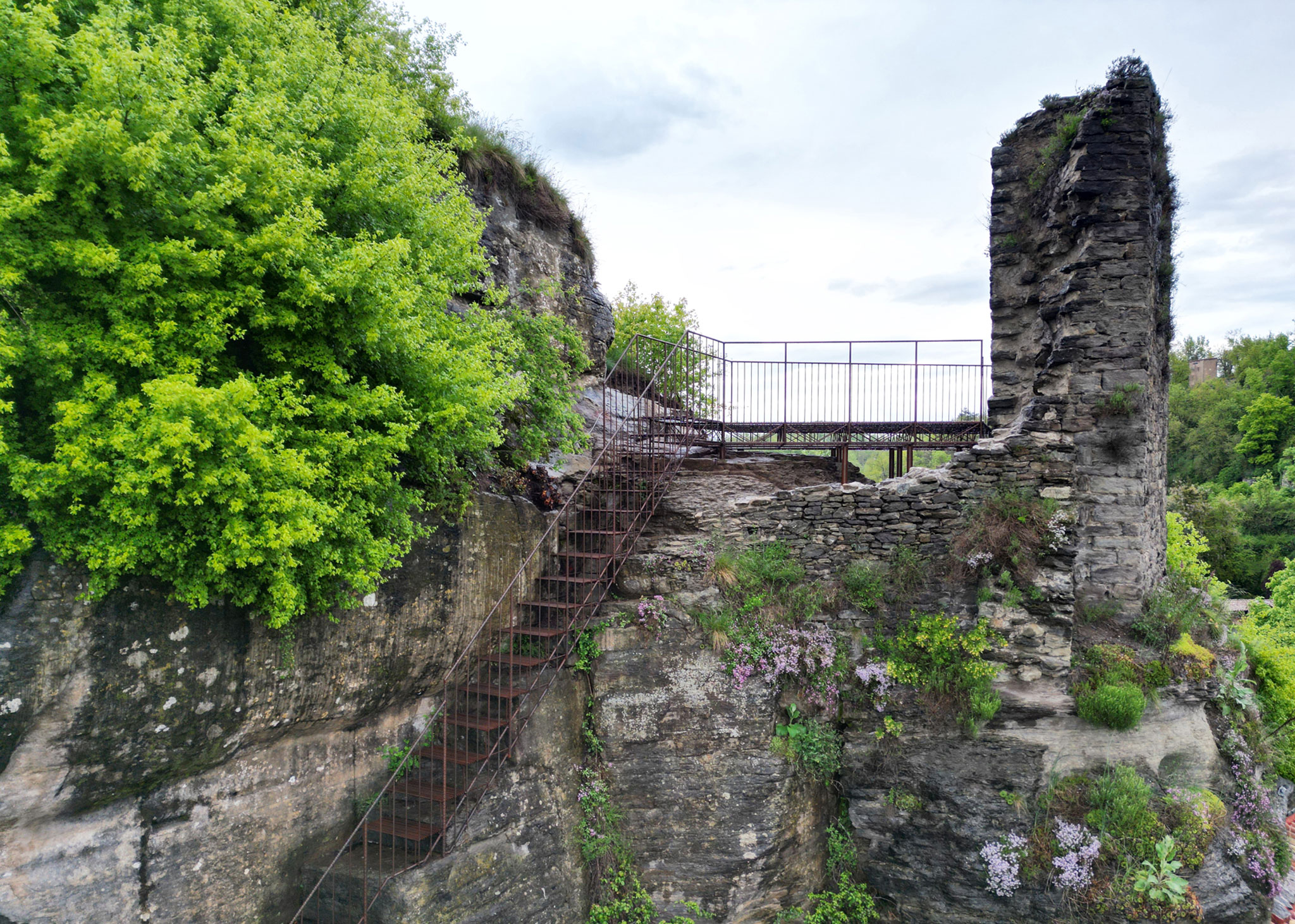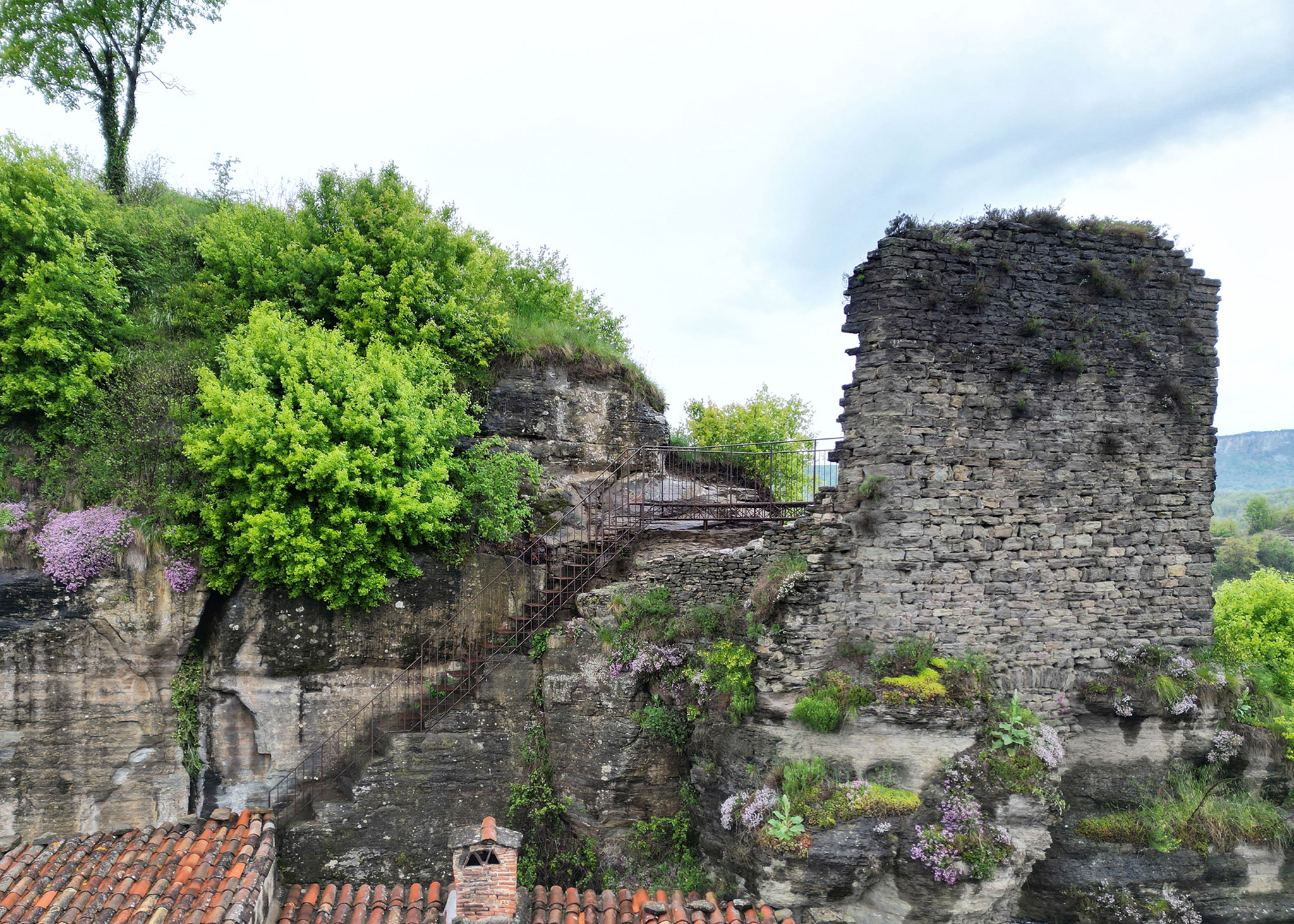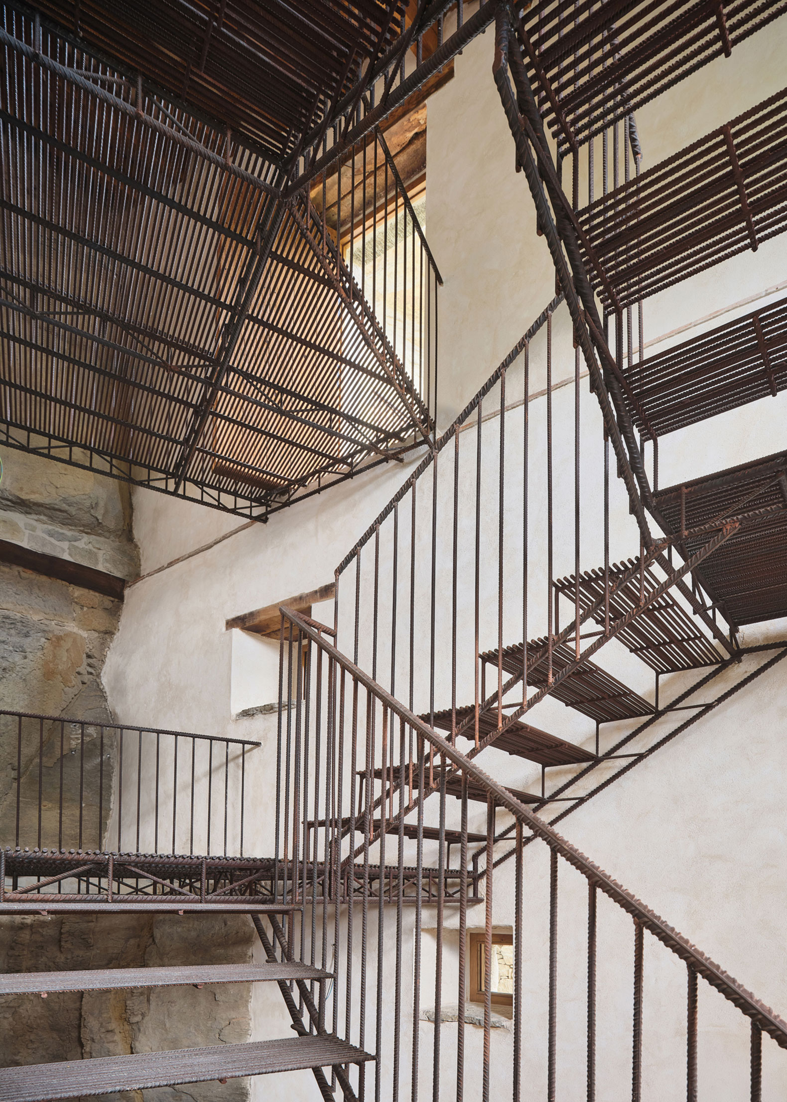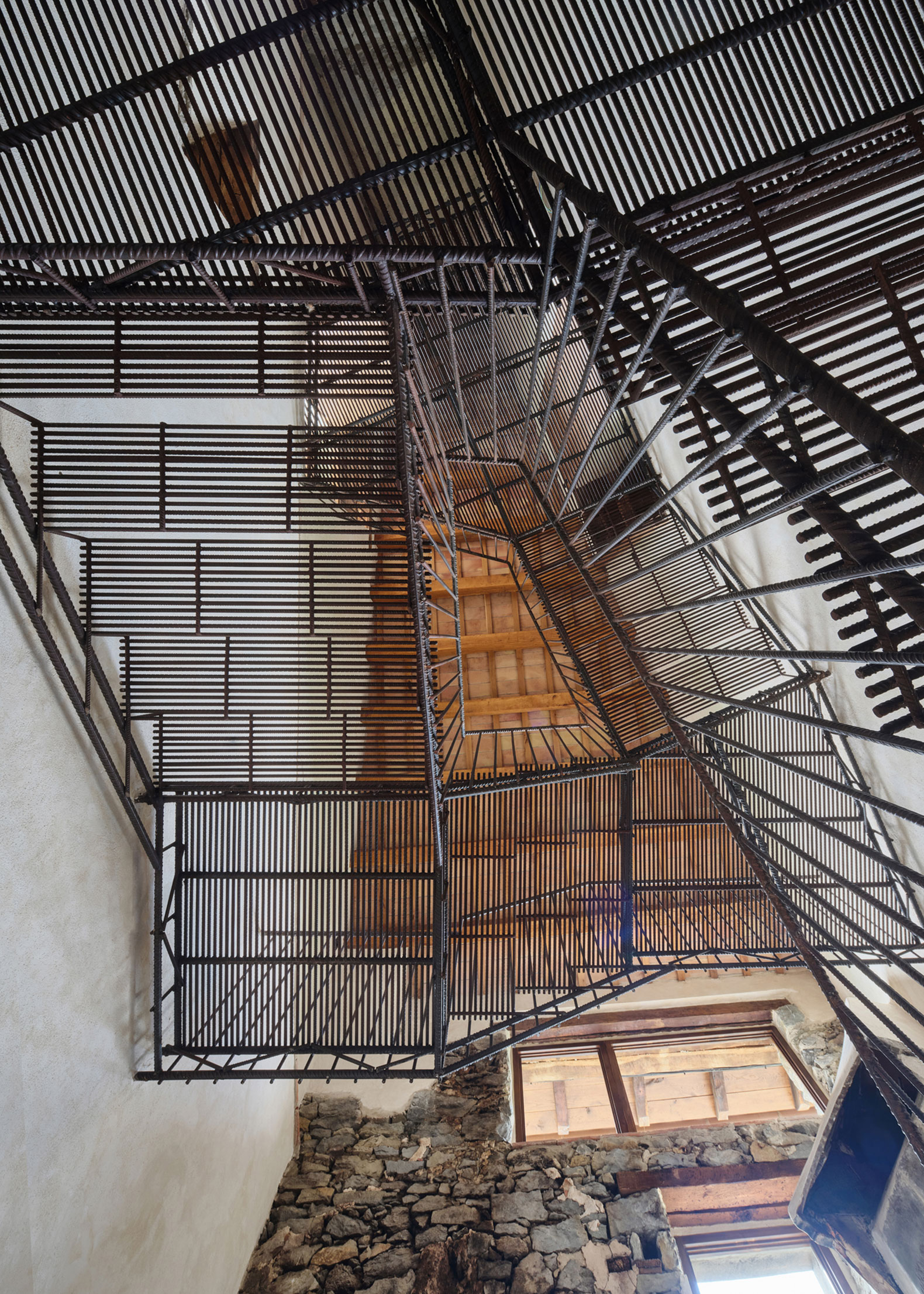 Constructivamente, el proyecto destaca por una estructura ligera y discontinua de pasarelas de acero corrugado que se adaptan a la topografía rocosa del lugar. El itinerario incluye una escalera anclada a la piedra que respeta las preexistencias y finaliza en una plataforma de observación situada en el interior de la antigua torre.