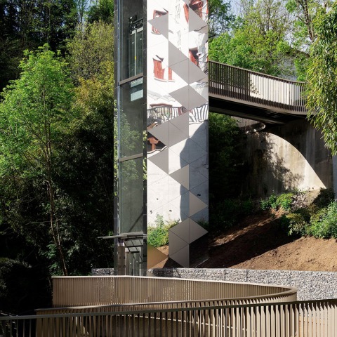 El acceso inferior al ascensor se realiza a través de una pasarela, de planta curvilínea, construida en hormigón con un canto reducido. La estructura vertical del ascensor, realizada con pantallas de hormigón y estructura metálica, está envuelta por dos frentes transparentes de vidrio y por otros dos opacos, conformados por triángulos metálicos que juegan con los reflejos del entorno. La parte superior se conecta mediante una pasarela.