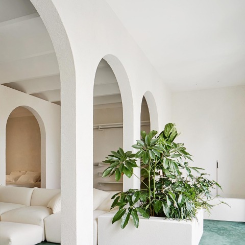 La fachada posterior porticada sirve para dotar de una estructura lógica al proyecto. La repetición de esta geometría en los muros de carga consecutivos y divisorios da como resultado un espacio único que conserva mentalmente los límites originales. Entorno a la estructura, los usos desbordan los límites físicos, en algunos casos rodeándola y en otros tropezando. El sofá, la bañera, la habitación, la ducha y el vestidor encuentran su sitio sobre un mullido tapiz verde.