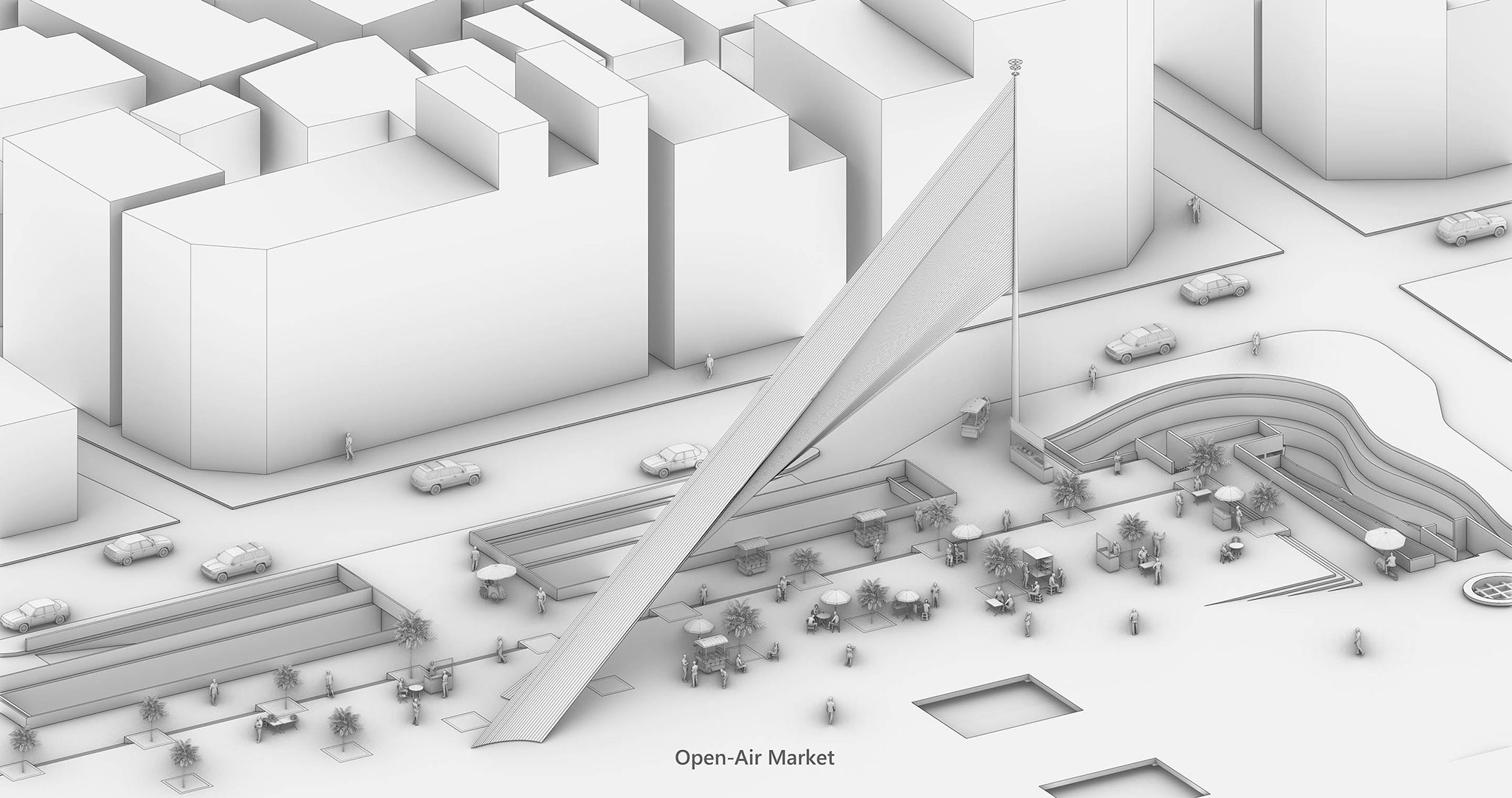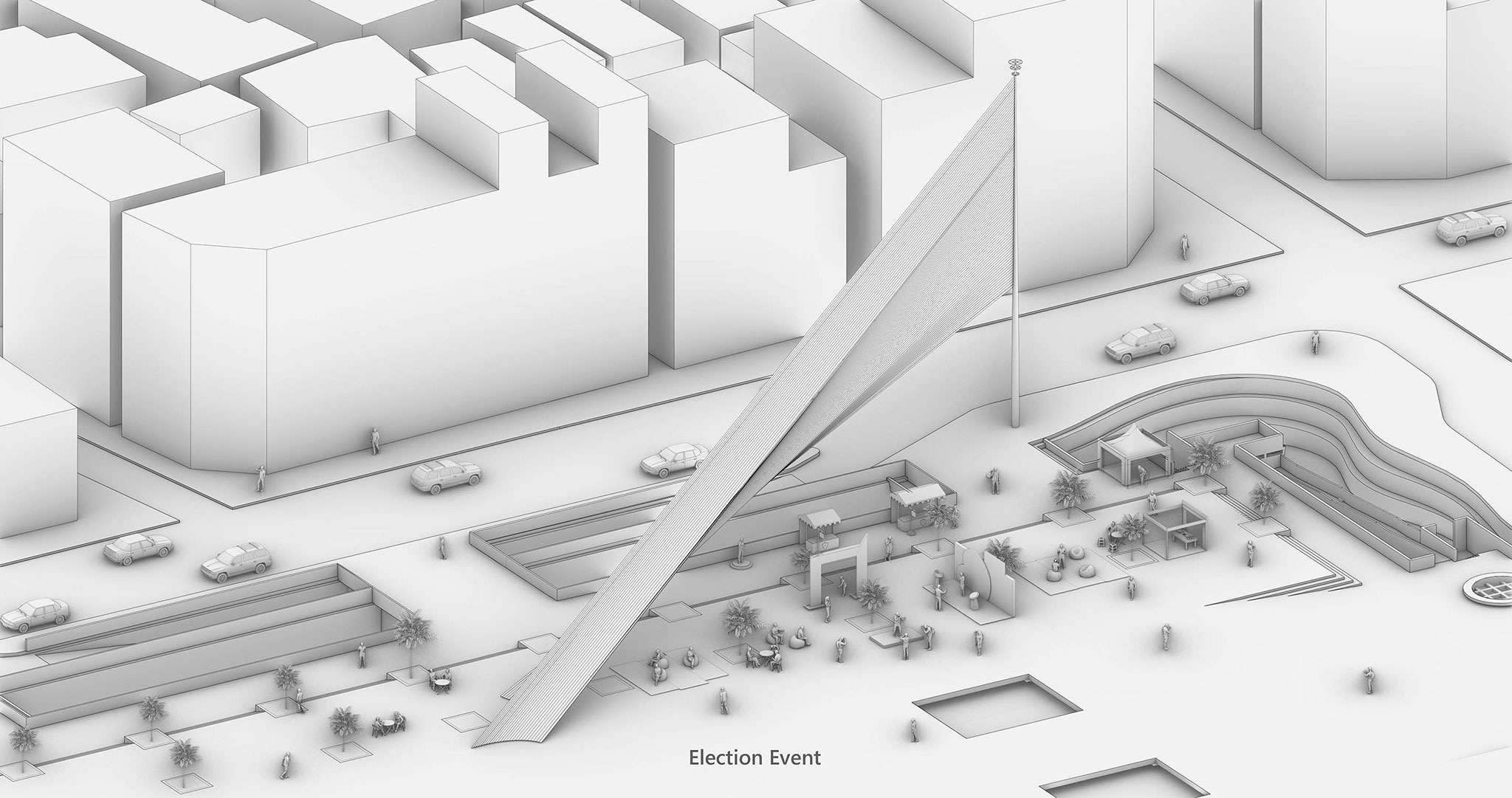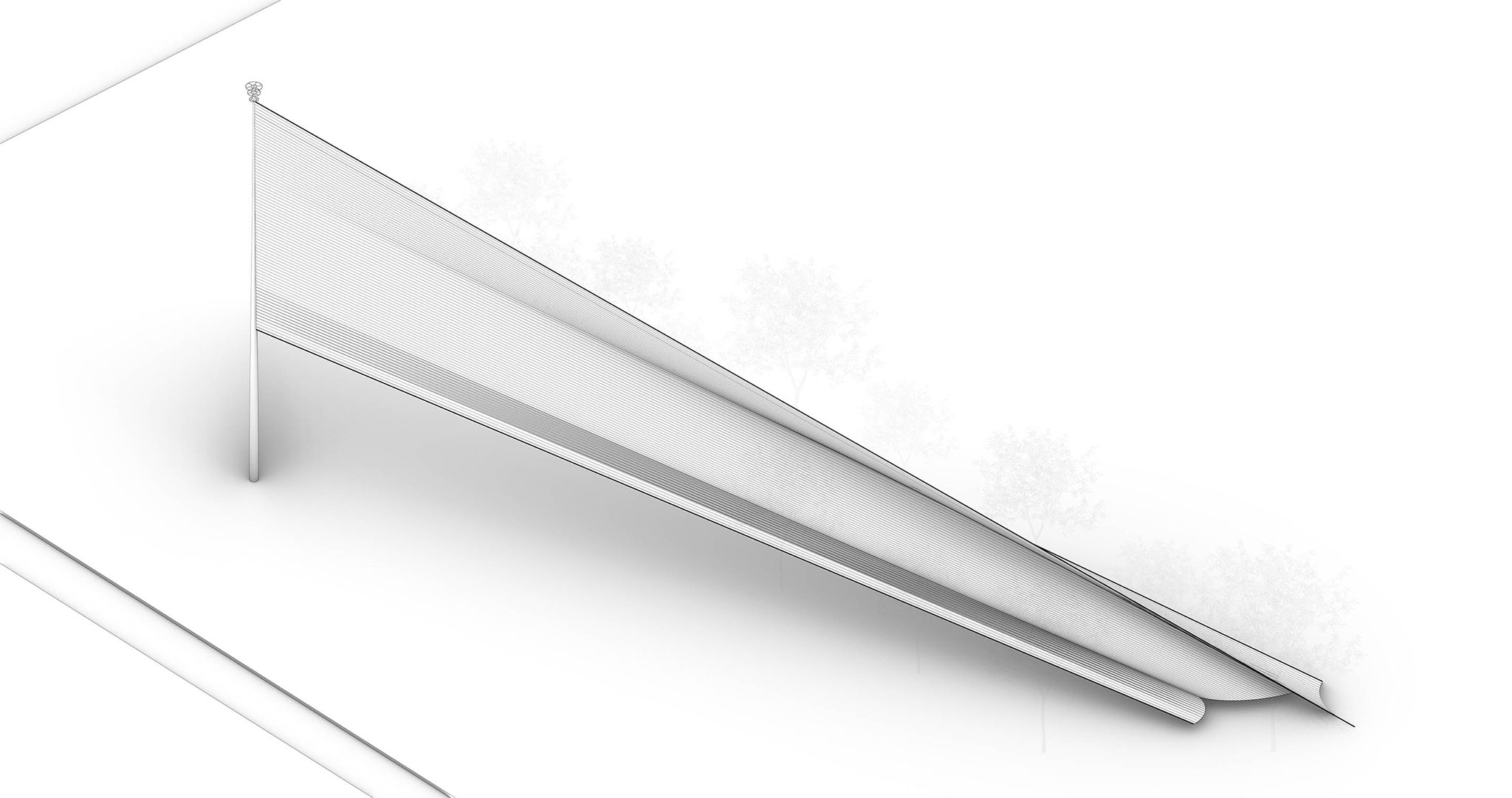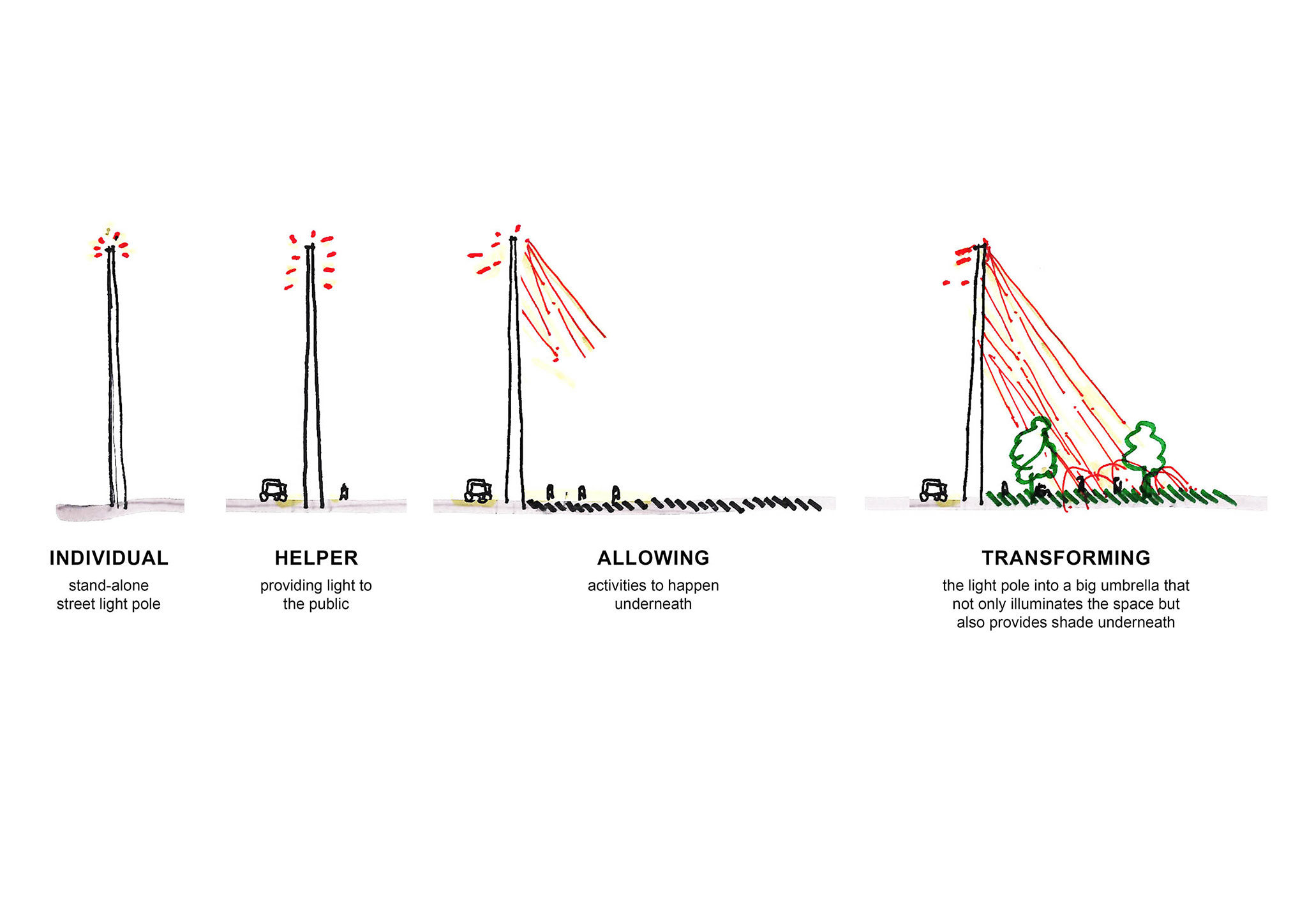 En respuesta, el diseño explora estratégicamente la relación entre los postes de alumbrado público y los árboles, la luz y la sombra, y la infraestructura y la naturaleza, utilizando el alumbrado público existente como estructura principal del pabellón. En lugar de introducir nuevos cimientos o construcciones permanentes, el proyecto minimiza el consumo de materiales y adopta un enfoque arquitectónico alternativo: transforma la infraestructura urbana existente en catalizadores espaciales y sociales para la vida cívica.