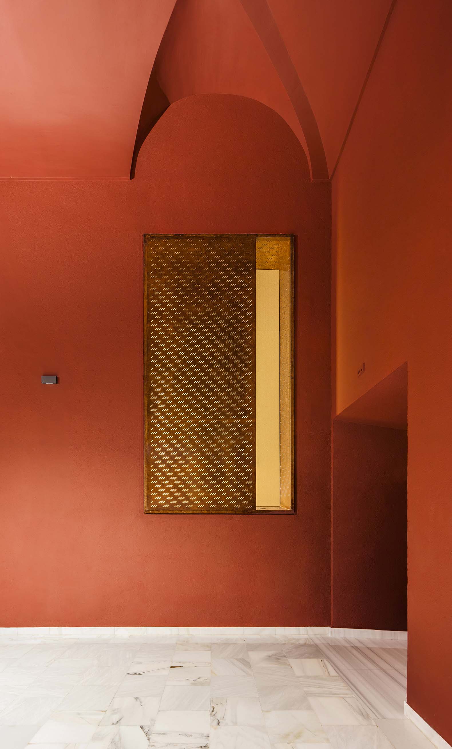 En el vestíbulo de entrada se añade un nuevo elemento: un almacén también triangular que dialoga con la geometría de la cabina de proyección y que, al igual que esta, ayuda a dirigir la circulación hacia el fondo de la sala. La serliana existente se conserva y, al unificar todas las superficies en un único tono rojo, aparece como una pieza singular que recibe al visitante y revela la nueva sala tras densas cortinas de terciopelo que remiten a universos cinematográficos amplios que van desde Luis Buñuel a David Lynch, de Pedro Almodóvar a Aki Kaurismäki.