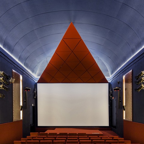 Las ventanas del antiguo hospital evocan gotas de lluvia, creando sensación de exterioridad, reforzada por una bóveda azul que recuerda el cielo nocturno y la recuperación del rojo clásico en elementos que aluden a cines históricos como el Skandia y el Doré. Superficies absorbentes suavizan la luz y transforman la percepción del volumen interior. En el vestíbulo se añade un mueble triangular que guía la circulación y dialoga con la cabina de proyección. La serliana unificada en rojo revela la sala tras cortinas de terciopelo, evocando universos cinematográficos de Buñuel a Kaurismäki.
