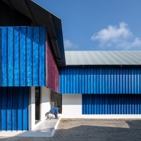 El taller de costura ocupa gran parte del edificio. Queríamos crear un atrio alto donde el aire pudiera circular durante las horas de trabajo. Todo el edificio y los espacios interiores están hechos de materiales básicos como estructuras de acero y aberturas de vidrio que permiten la entrada de luz natural desde el lado norte del edificio. Pero cuando se vuelve hacia el exterior del edificio, la fachada sólida superpuesta está diseñada para proteger el espacio de trabajo del sol del sur durante el día. La fachada de tablero inteligente se pintará con tinte de madera azul y se dividirá por madera dura teñida de rojo azulado en cada lado. Es similar a coser ropa volteando deliberadamente las costuras. y se basa en la técnica del plisado a 2 caras para crear una percepción diferente en cada lado del edificio.