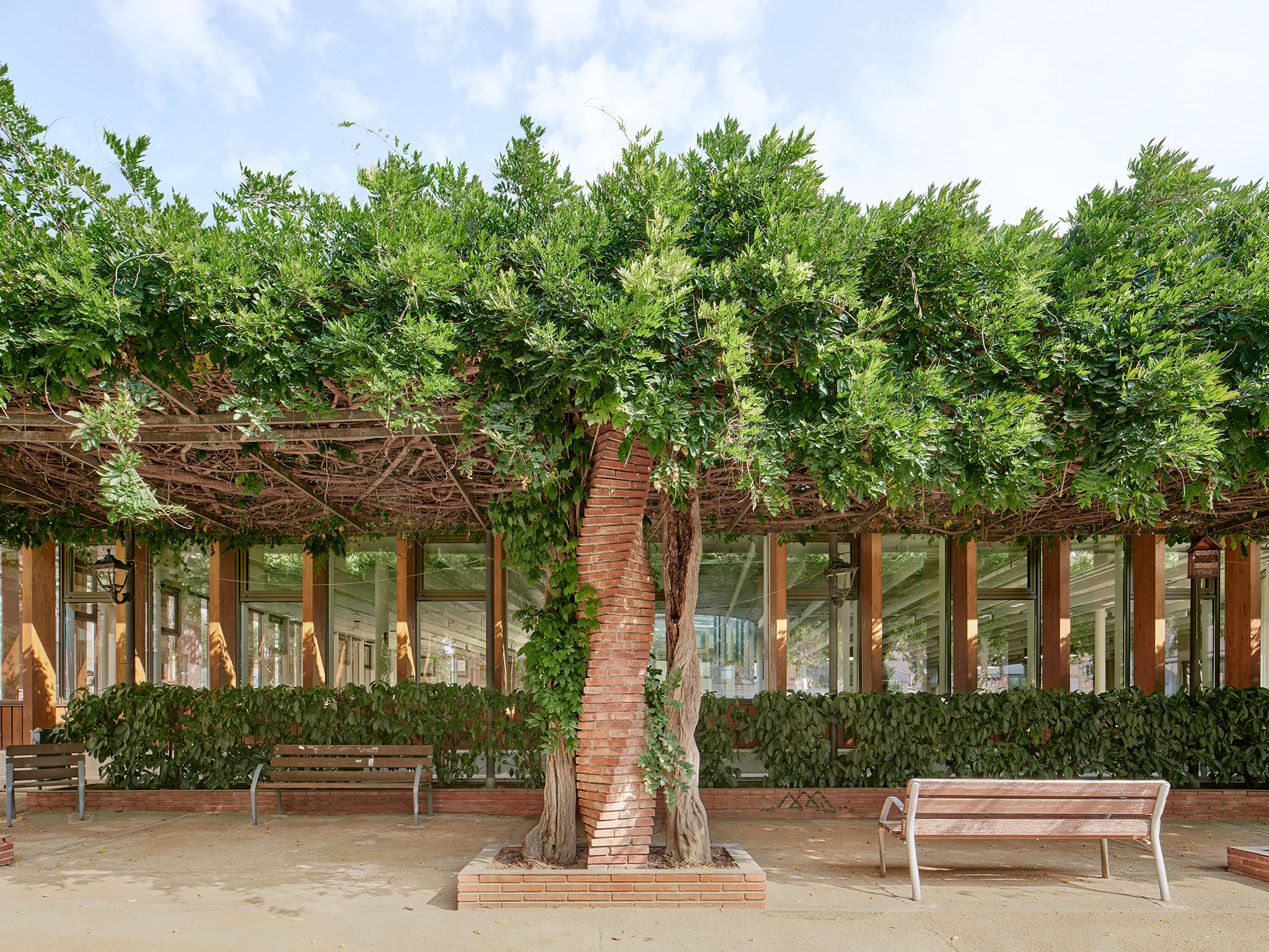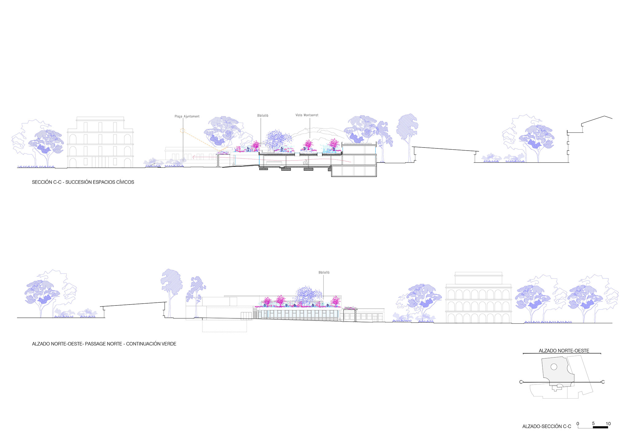 El edificio completa con la fachada norte el pasaje que conduce al parque municipal y a los edificios históricos, la escuela de arte y oficios y el Ayuntamiento. Como no añadimos un edificio de dos plantas, la ampliación no entra en competencia con la morfología del edificio existente ni con la escuela de Arte y Oficios. Su fachada a poniente se fusiona con la pérgola de glicina existente que forma parte del patrimonio paisajístico y le sirve de filtro solar natural. La silueta del Montserrat aparece desde la nueva cubierta-mirador.