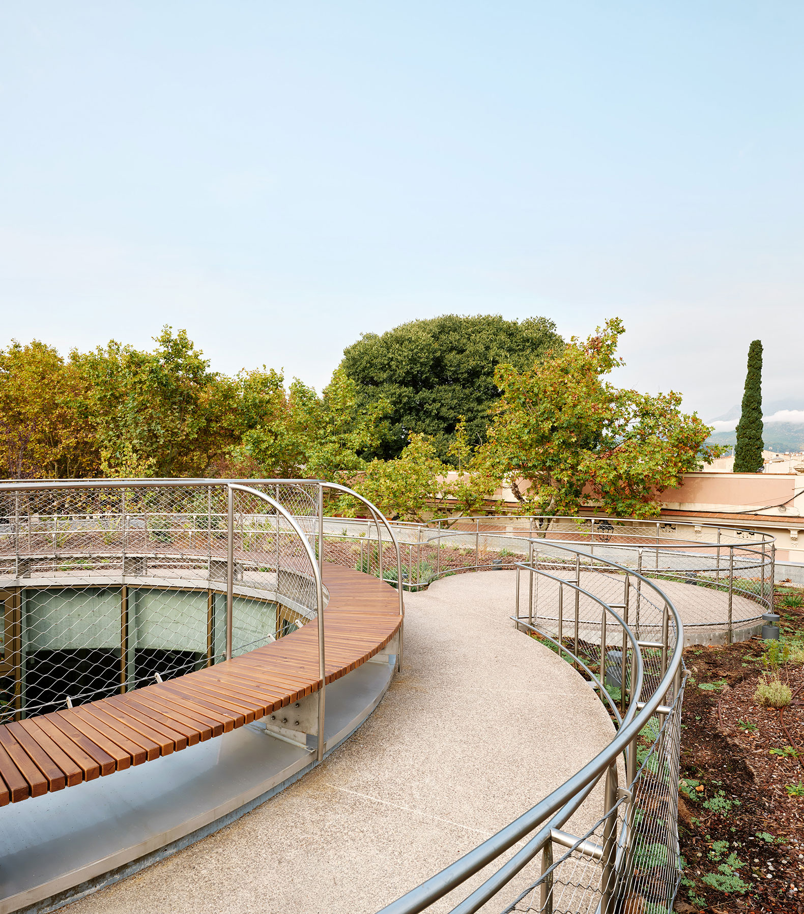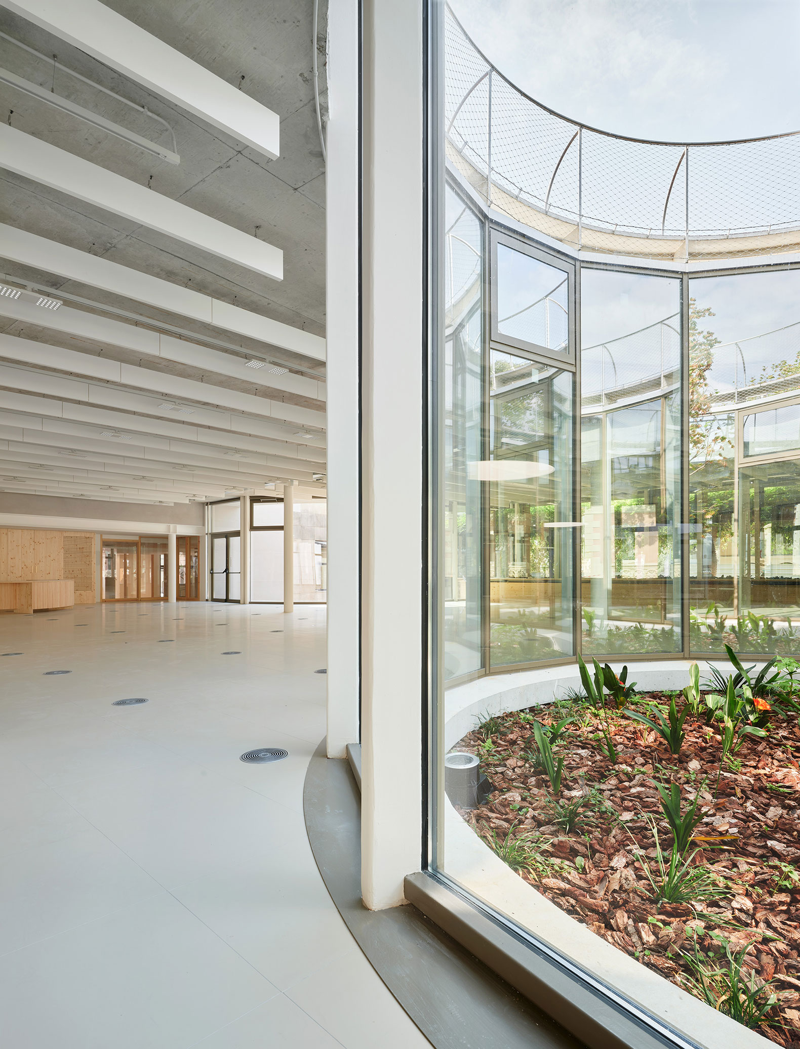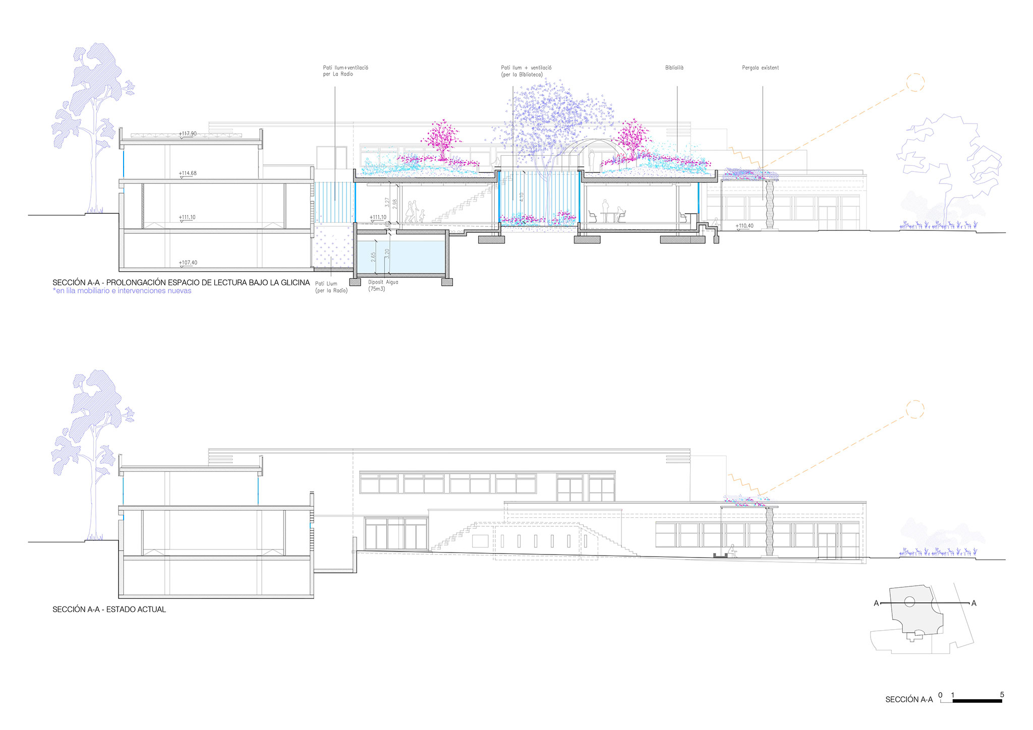 La ampliación conecta la cubierta con la primera planta y se integra en la imagen urbana. Una de sus fachadas se fusiona con una pérgola de glicina preexistente, integrándose sutilmente en la imagen del paisaje urbano existente y sirviendo de filtro solar natural. La ampliación se realiza en un solo nivel, en relación visual directa con el jardín exterior, bajo esta cubierta ecológica soportada por una trama de pilares cilíndricos y perforada por tres patios que inundan de luz natural el espacio interior de lectura.