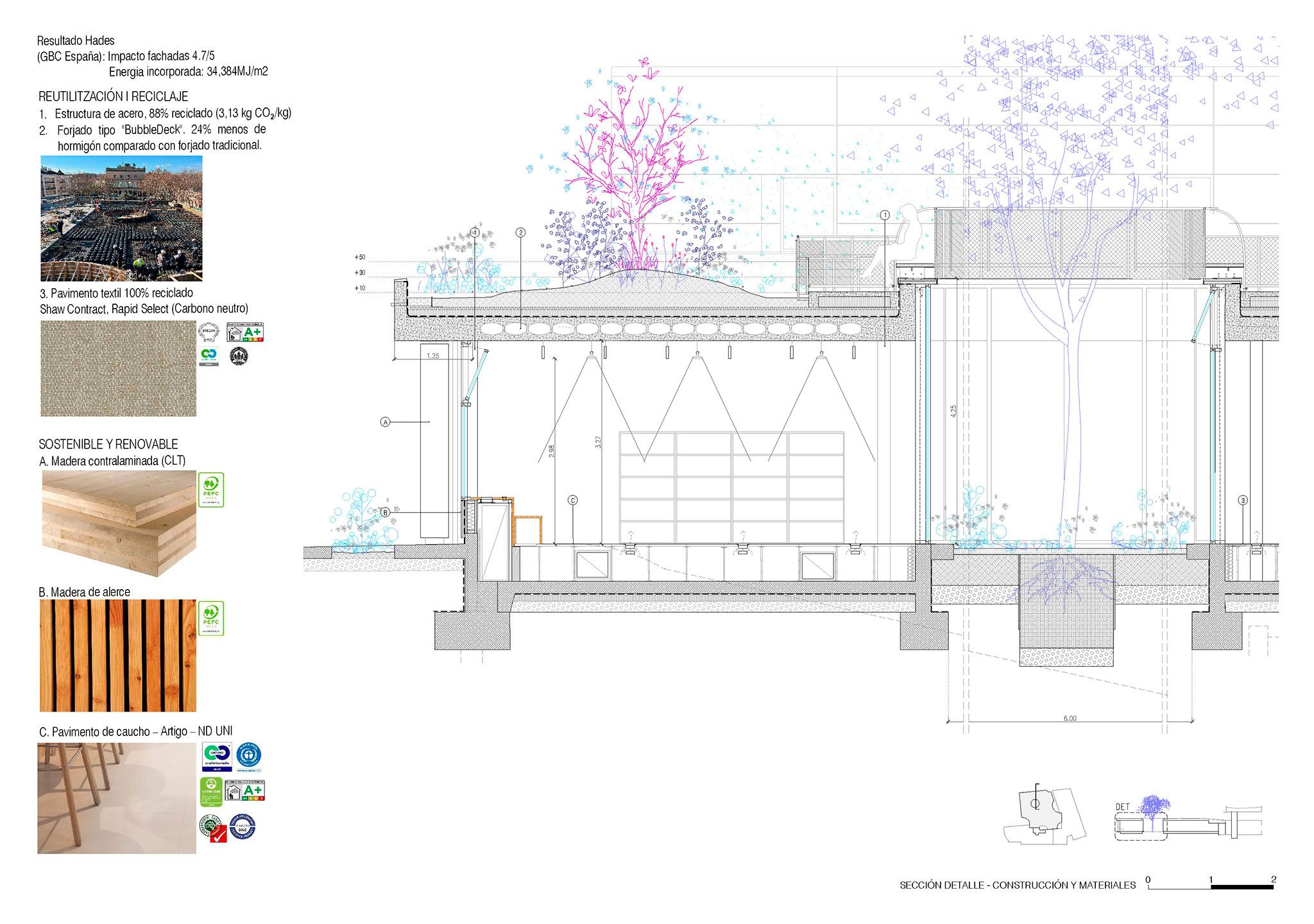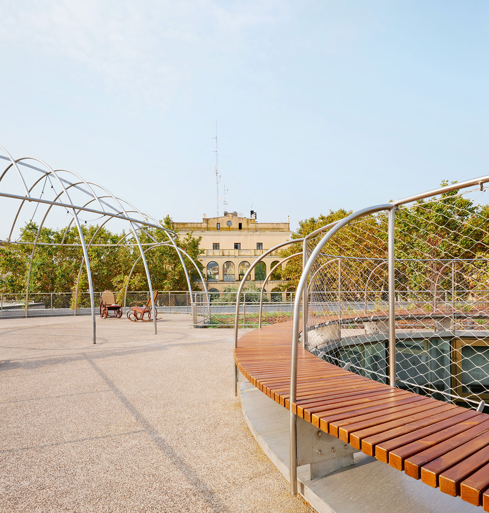 Una cubierta gruesa ecológica de 1007 m² cubre todo el solar disponible. No dejamos residuos, espacios para «urbanizar» sino que añadimos espacio verde en el que ahora hay un aparcamiento. Esta cubierta verde es un espacio de lectura exterior controlado, accesible desde el primer piso, tanto desde a escuela de música como desde la biblioteca y por tanto es un «plus» 1007 m² de espacio para actividades de recreo (por ejemplo el Bibliolilà), una superficie gratuita (financiada con el presupuesto de urbanización).