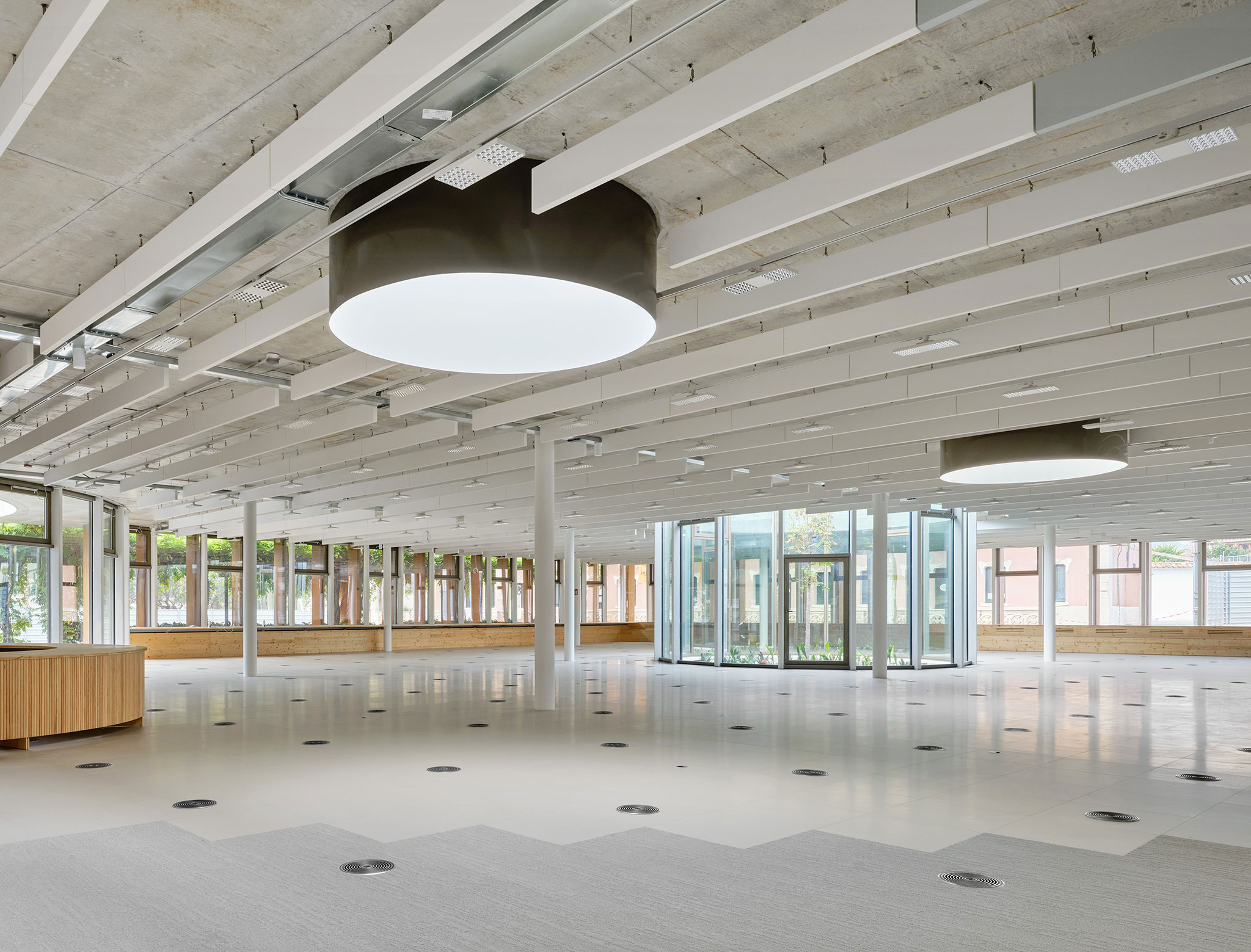 La cubierta ecológica cubre la nueva zona general, ubicada toda al mismo nivel y con relación visual directa con el jardín exterior. Una trama de pilares redondos y tres patios genera un paisaje interior de lectura donde se introduce.