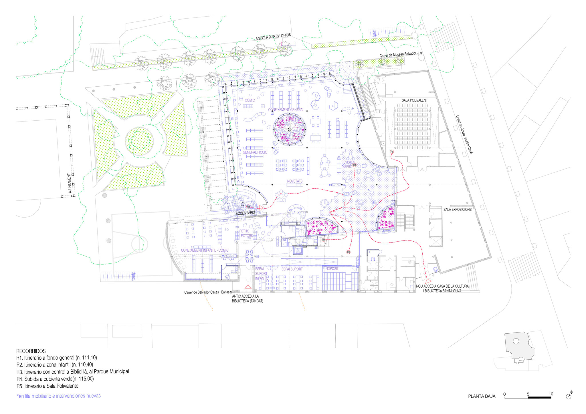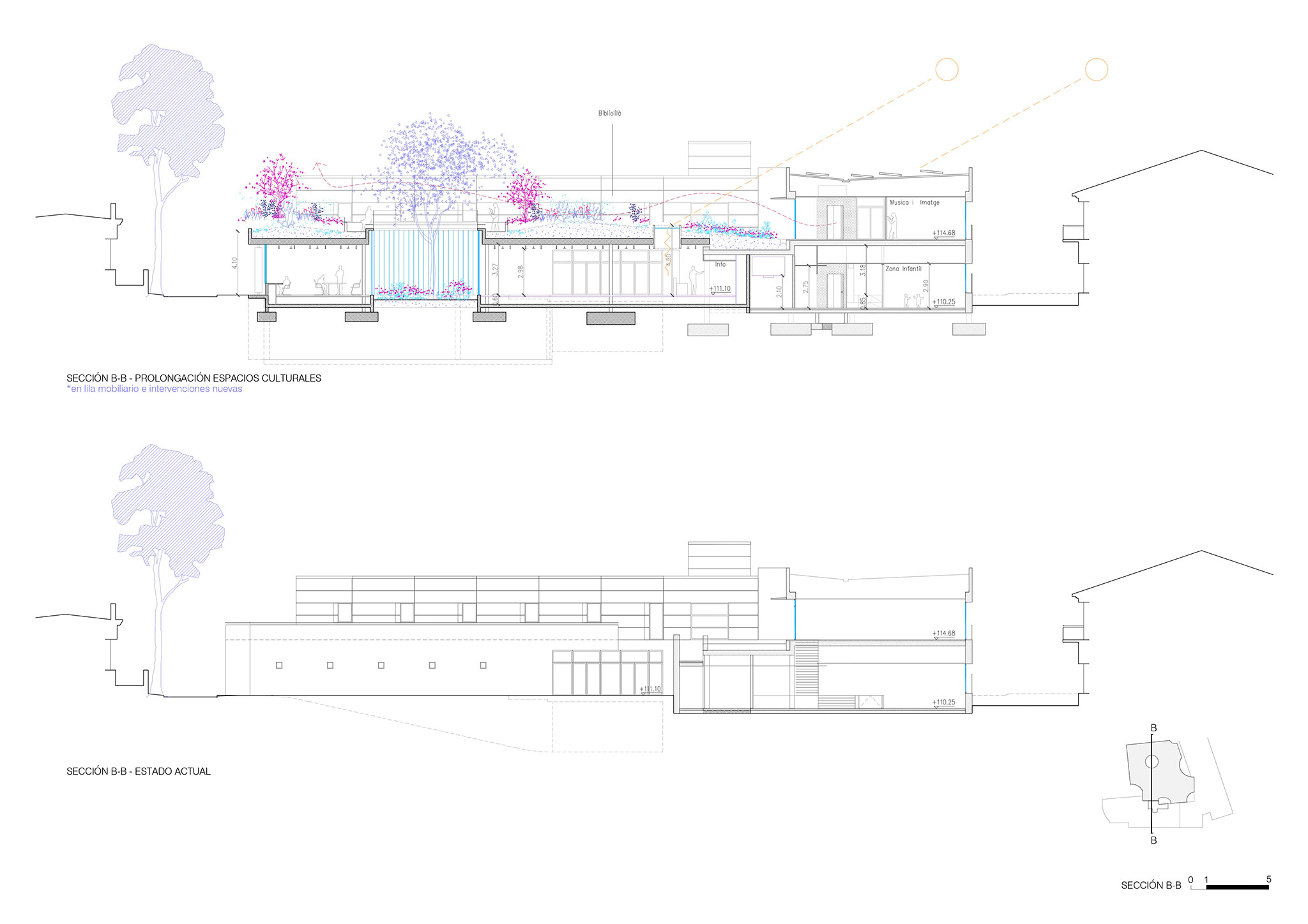 La Casa de la Cultura, situada en una de las esquinas de este espacio público, tiene diferentes dependencias, una de ellas la biblioteca, que es motivo del encargo de ampliación asumido por Coll-Leclerc. El proyecto se desarrolla en una sola planta con una gran cubierta verde accesible de 1.007 m² que cubre todo el solar y despliega un nuevo jardín, complemento de las actividades de la biblioteca y del Centro de Cultura.