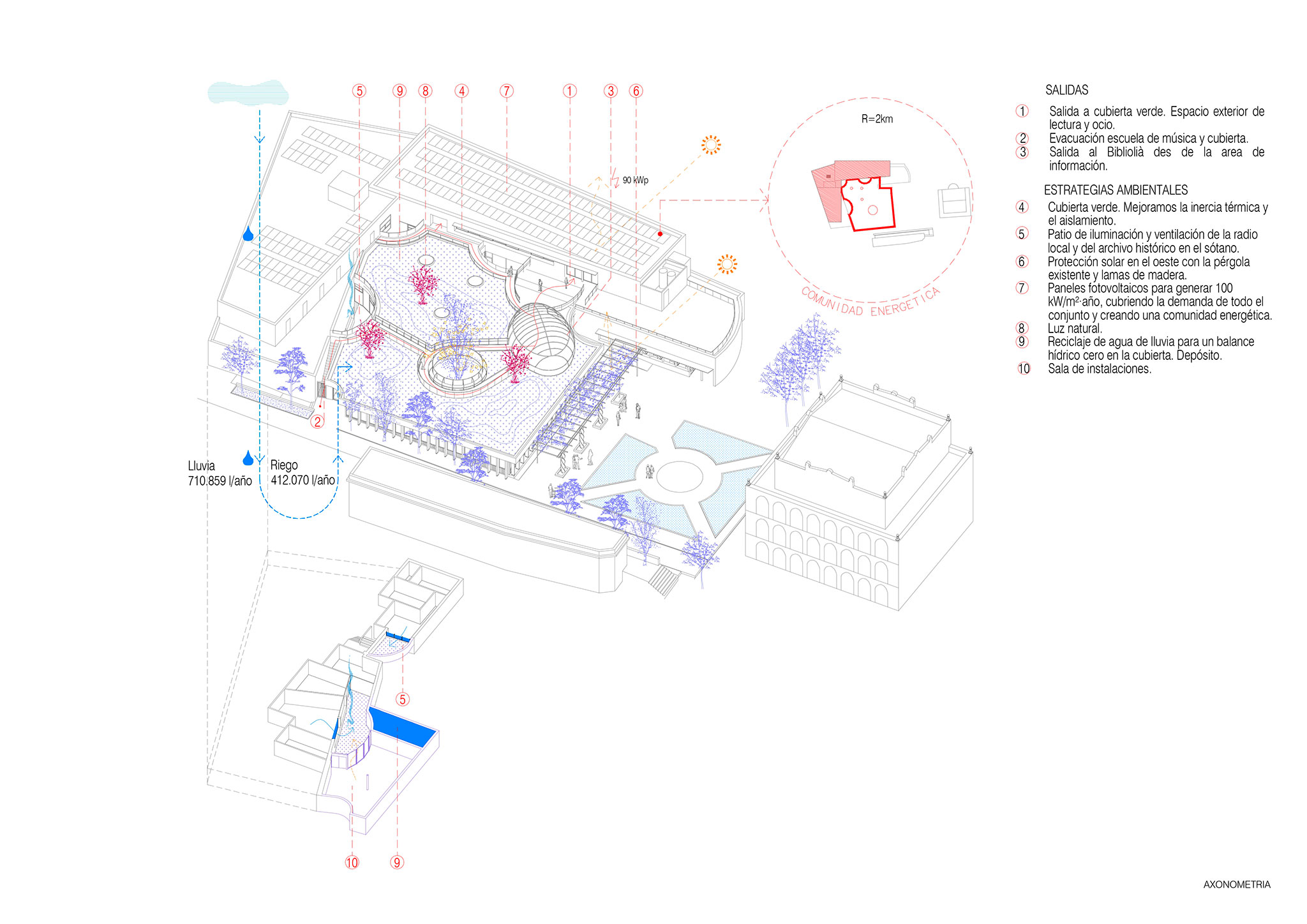 El lugar, por tanto, es un ecosistema que ha pasado de zona productiva agrícola (hasta 1900), a espacio para el ocio y la salud (hotel y jardines hasta 1931), y a espacio público (parque y equipamientos públicos). Actualmente la Casa de la Cultura debe ser protagonista con un fuerte compromiso climático (el edificio debe pasar de consumidor a productor de energía renovable), cultural (potenciar la literatura, la música, las artes plásticas y la comunicación), sanitarias (aprovechar para hacer un conjunto más saludable), ambientales (potenciar la naturaleza) y sociales (abierto a todo el mundo). Por tanto la ampliación de la biblioteca sigue las siguientes estrategias: