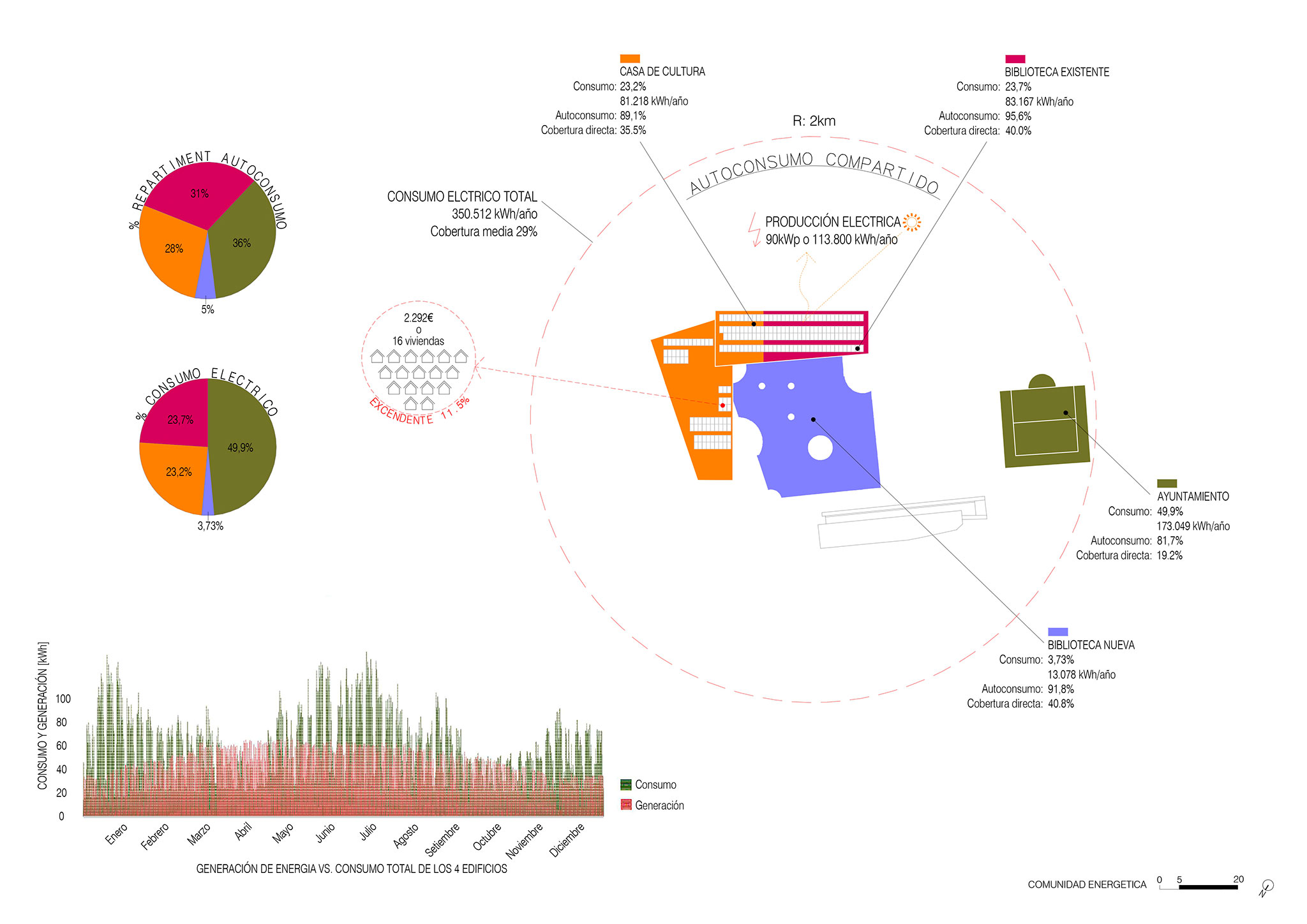 Planteamos una comunidad energética que dará servicio al conjunto de edificios municipales vecinos incluyendo el ayuntamiento, produciendo 90 kWp de electricidad, cubriendo un 29% del consumo medio anual. Un referente urbano para la ciudadanía.