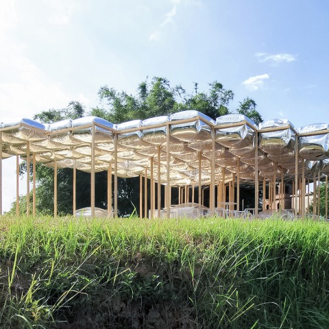 La cubierta está compuesta de módulos conformados a partir de una película inflable de polivinilo, formalmente evocan una sensación de ingravidez como si de globos metálicos se tratasen. Genera al mismo tiempo una percepción formal única que permite un sutil reflejo de lo que se proyecta a su alrededor: los árboles, la luz, etc. Un efecto similar al que generan los destellos que proyecta el agua.