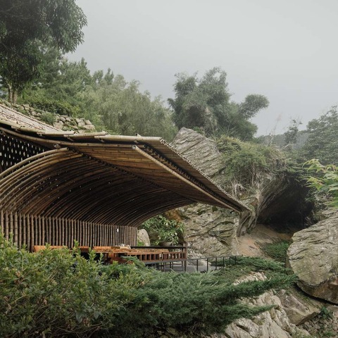 El bambú es un material de construcción utilizado en Asia desde hace miles de años gracias a, su crecimiento rápido, que permite tener troncos de hasta seis metros en un año, y a su resistencia a flexión, que facilita ser curvado con facilidad. La construcción en bambú, permite que el edificio se mimetice con el entorno, y que su huella de carbono sea muy baja.