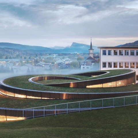 El pabellón en forma de espiral del Musée Atelier, diseñado por BIG y realizado por la oficina de arquitectura suiza CCHE, se eleva paulatinamente sobre las paredes de vidrio estructural curvado. Una hazaña de ingeniería y diseño, es la primera construcción de este tipo que se construye a tal altitud. El acristalamiento curvo soporta por completo el techo de acero, mientras que una malla de latón corre a lo largo de la superficie externa para regular la luz y la temperatura. El techo verde además ayuda a regular la temperatura, mientras absorbe agua.