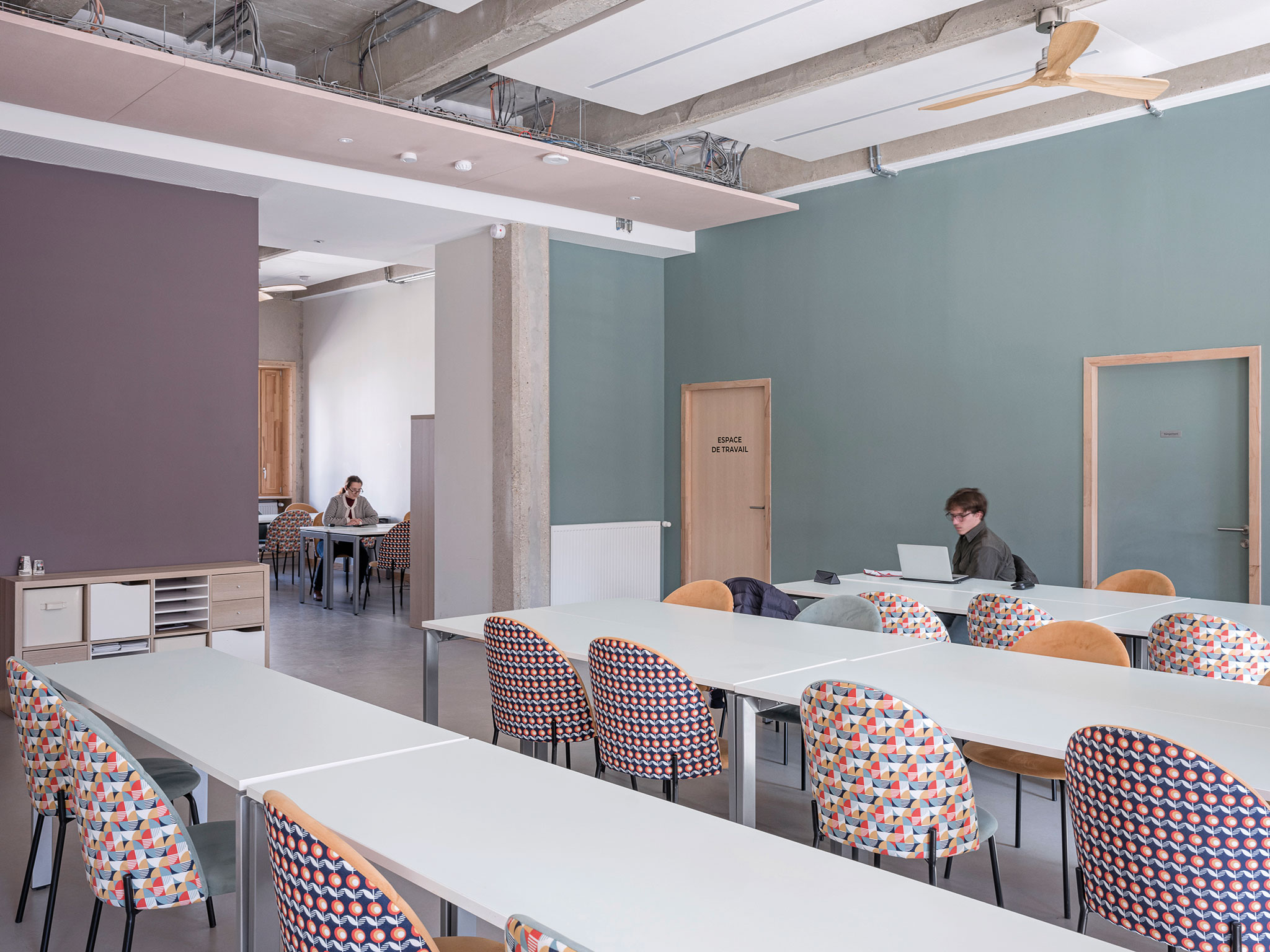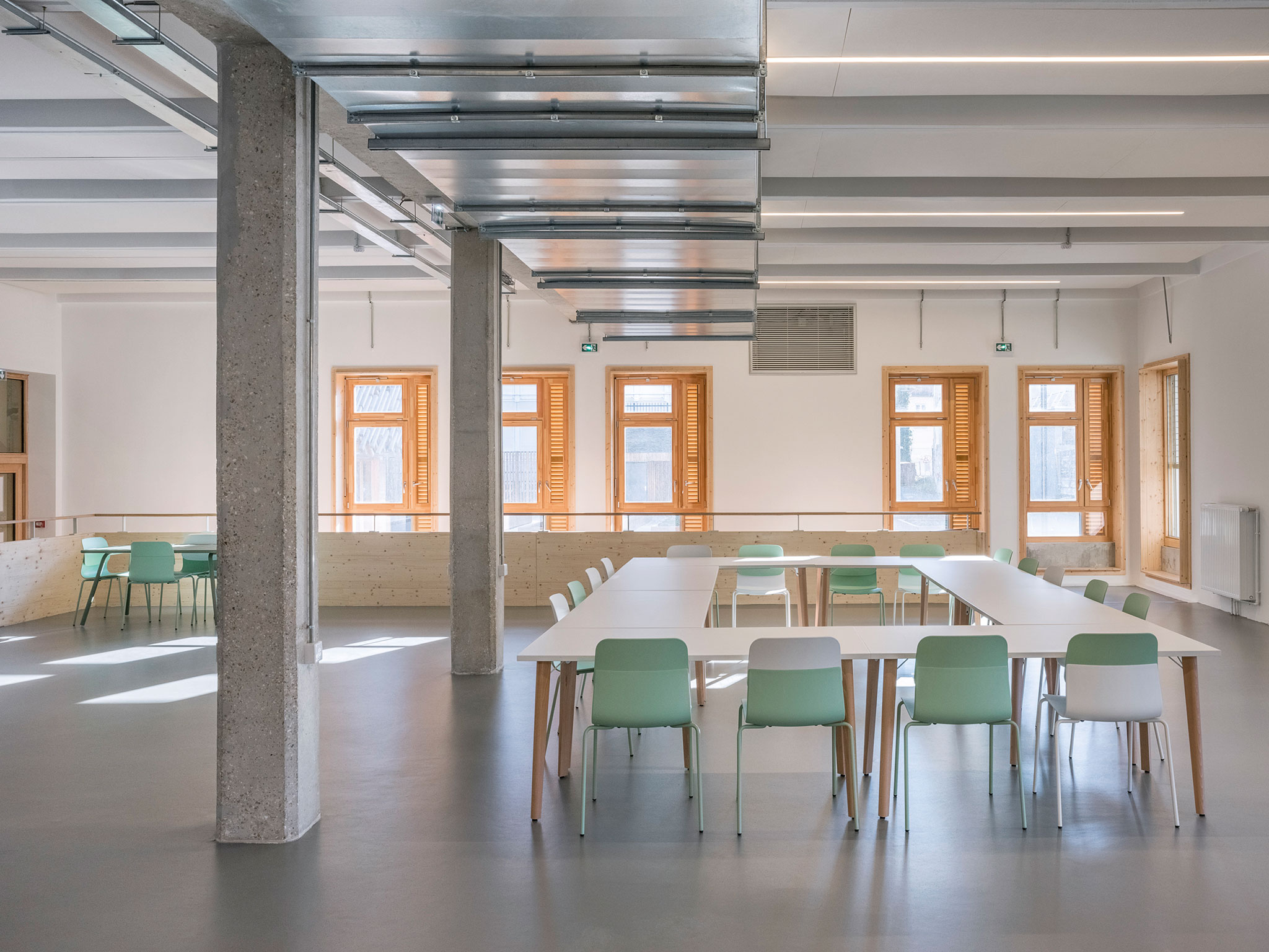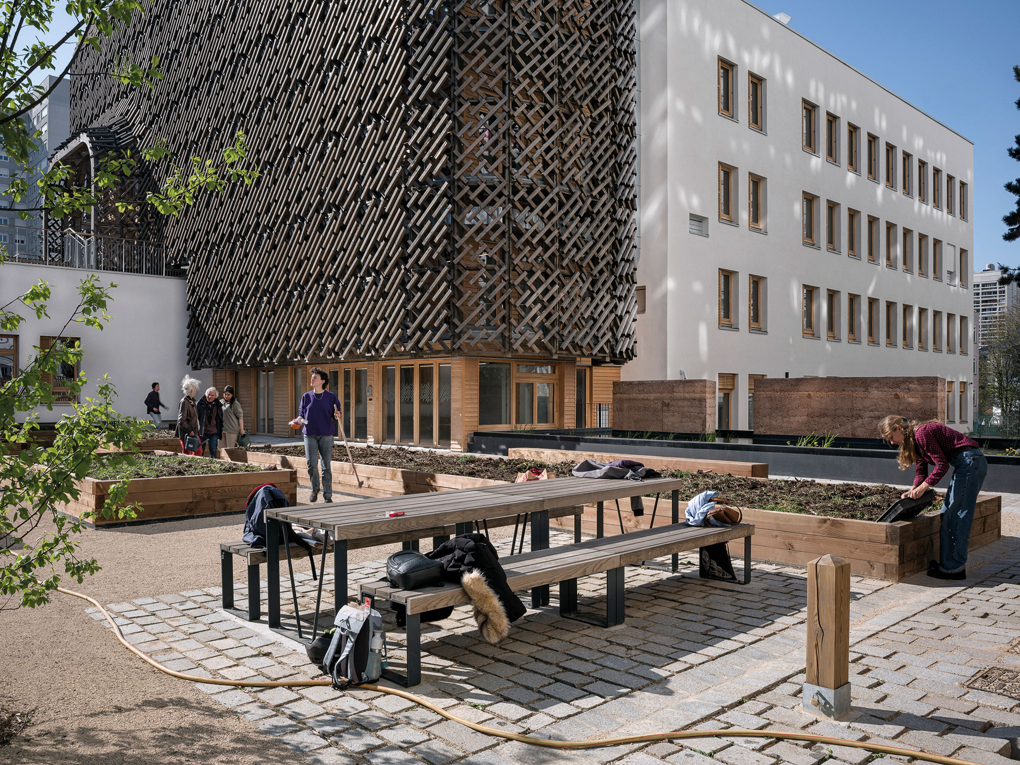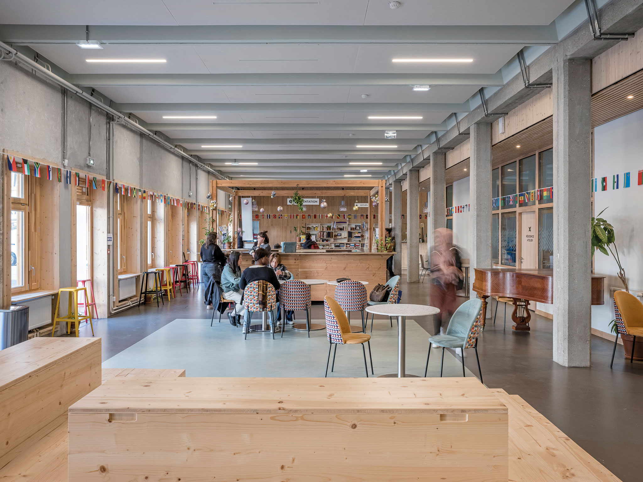 La alta estructura de postes y vigas ofrece un espacio acogedor para que refugiados y residentes disfruten de bebidas, aprendan francés y cocinen. Cuenta con amplias zonas y diversos lugares con una acústica especialmente diseñada para la comodidad de todos. Una larga terraza orientada al sur ofrece momentos de relajación y acceso a un jardín compartido.