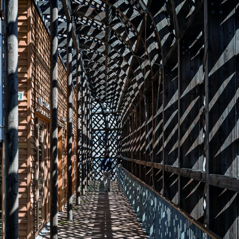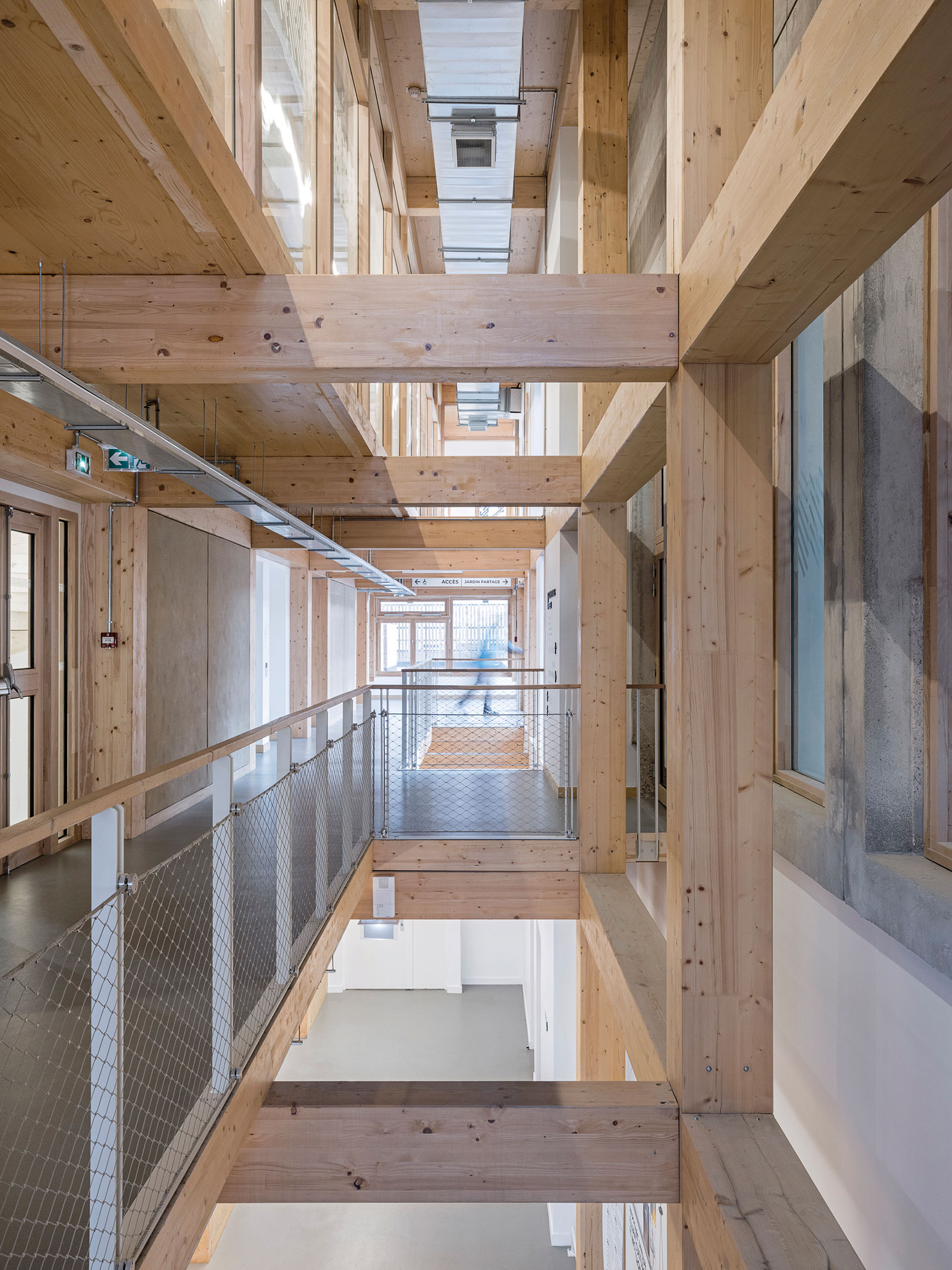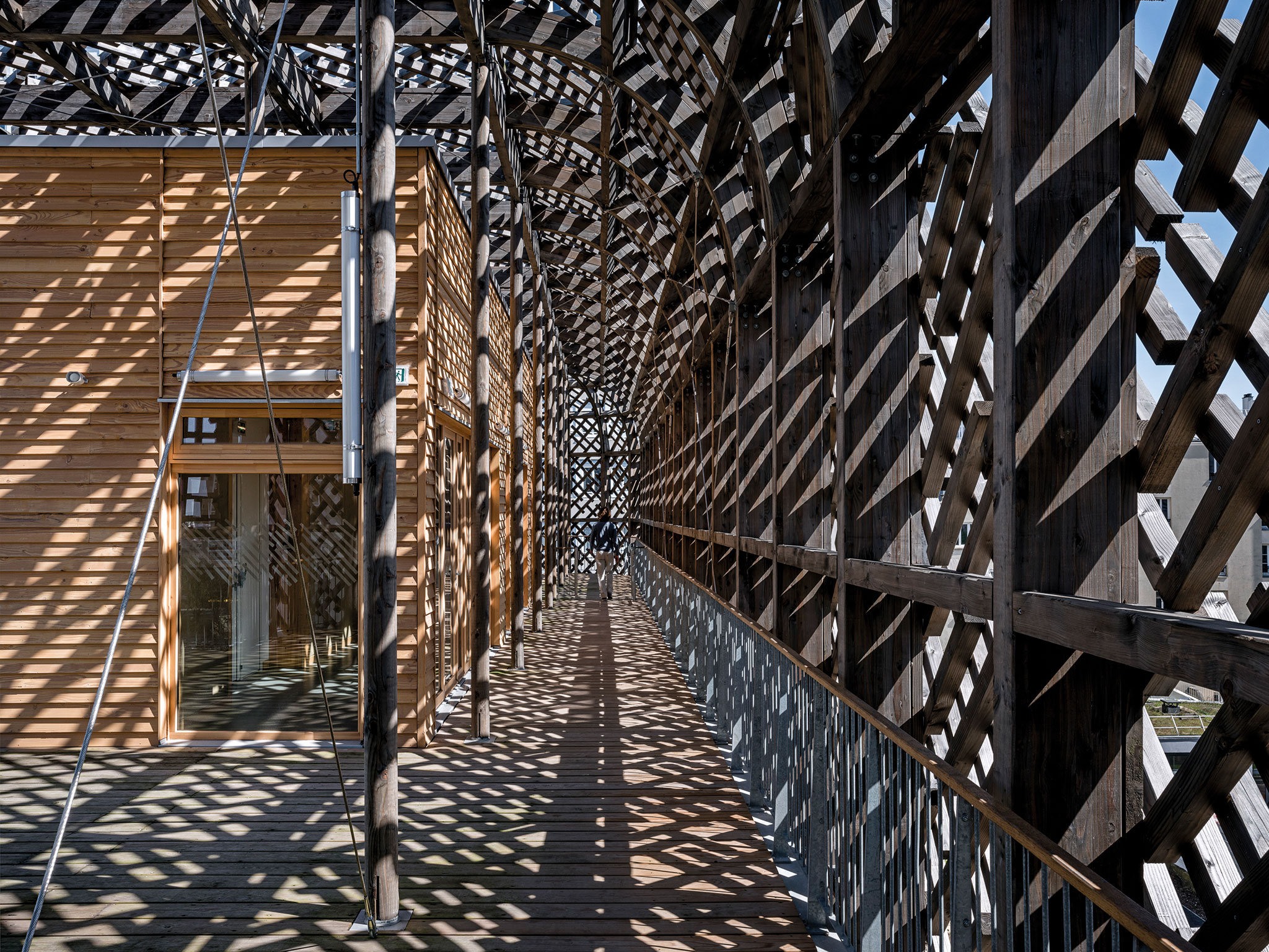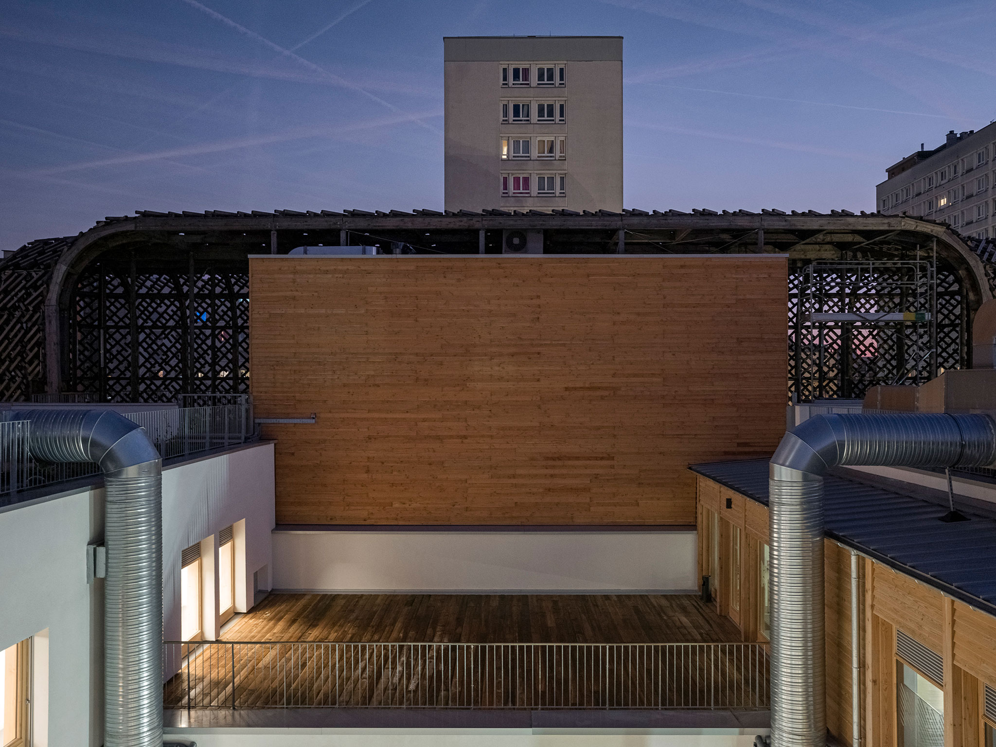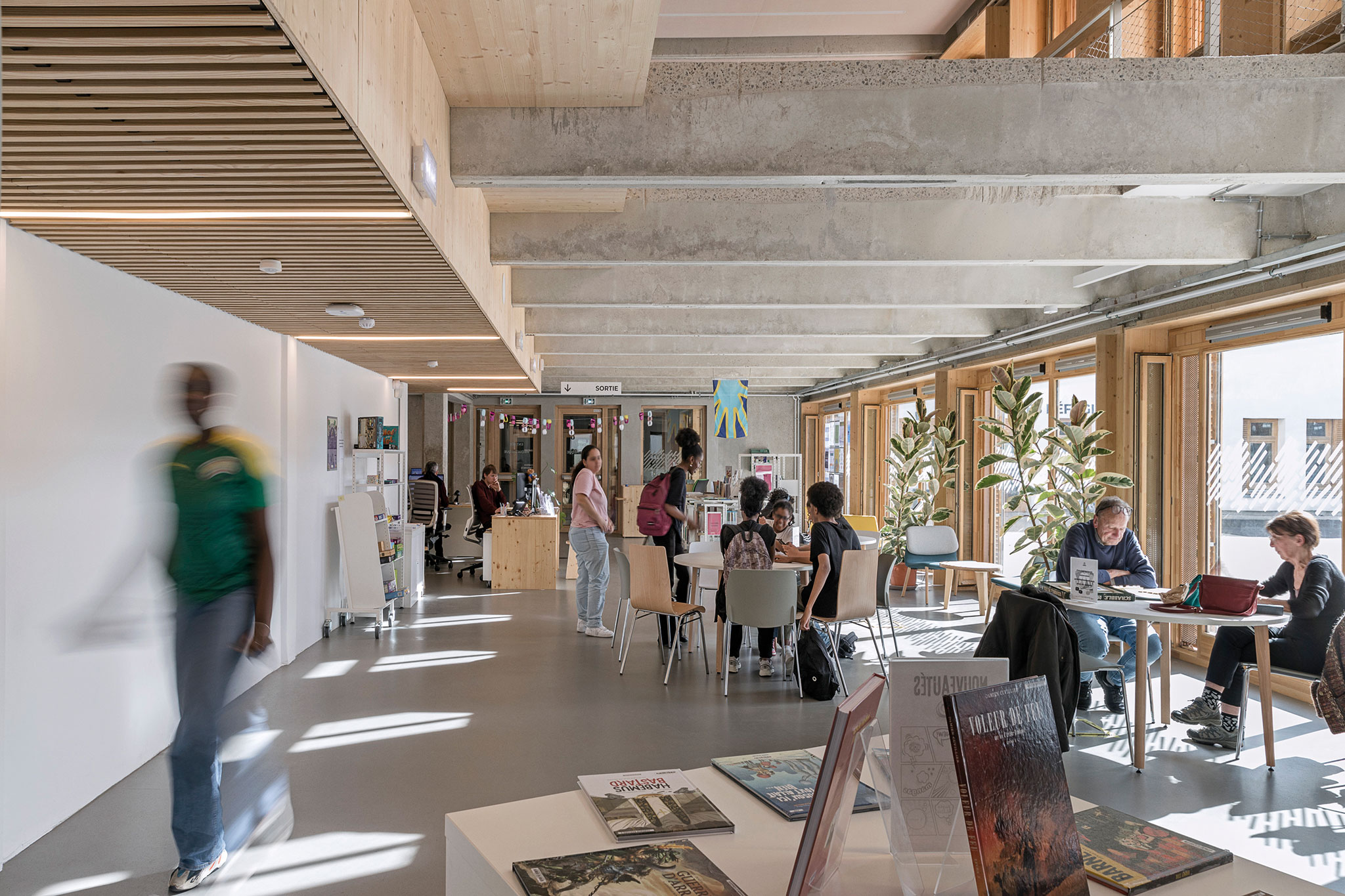 La alta estructura de postes y vigas ofrece un espacio acogedor para que refugiados y residentes disfruten de bebidas, aprendan francés y cocinen. Cuenta con amplias zonas y diversos lugares con una acústica especialmente diseñada para la comodidad de todos. Una larga terraza orientada al sur ofrece momentos de relajación y acceso a un jardín compartido.